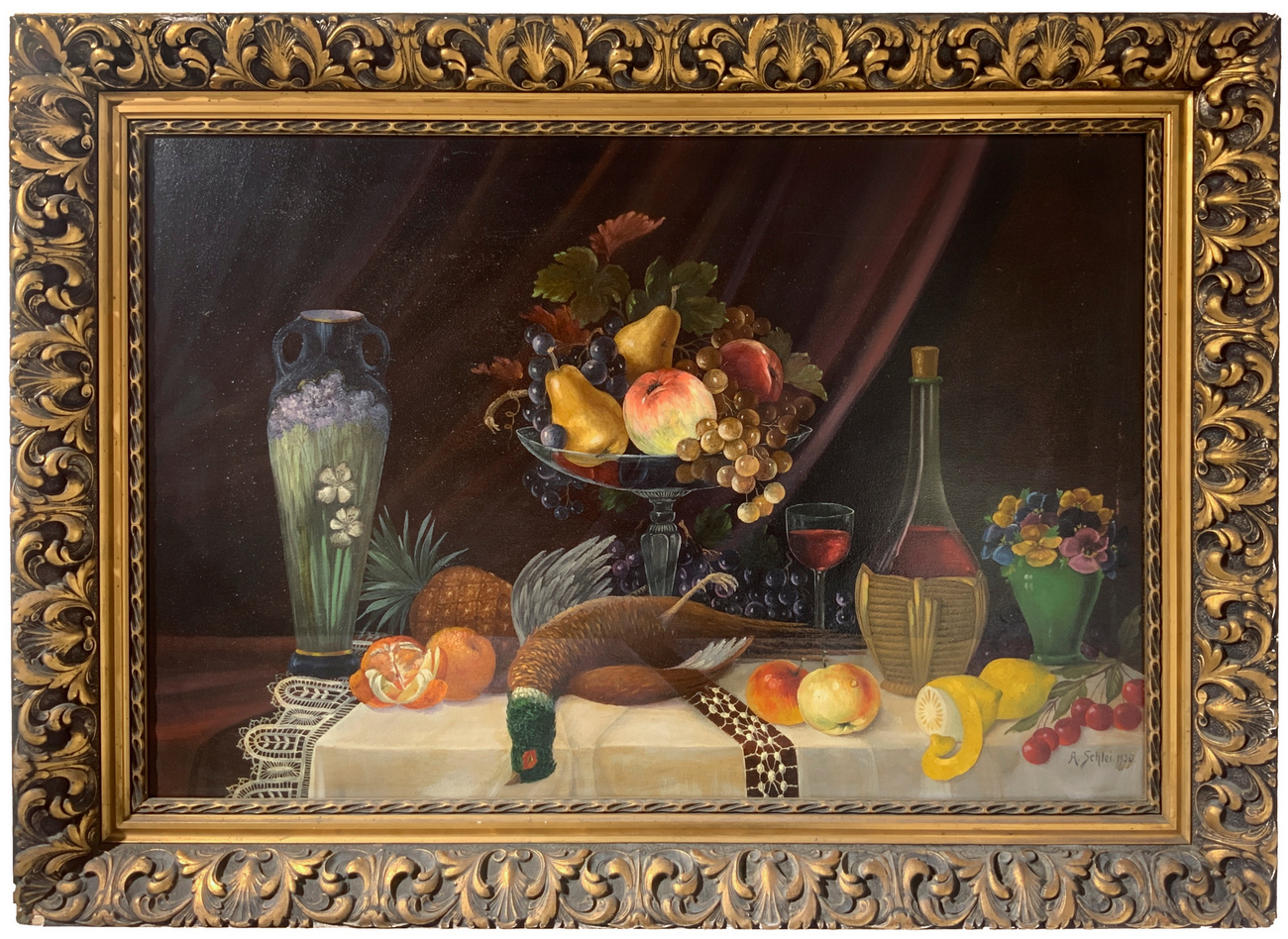 Dipinto ad olio su tela raffigurante natura morta di frutta e cacciagione, firmata A. Schle e datato ’30. Inizi XX secol