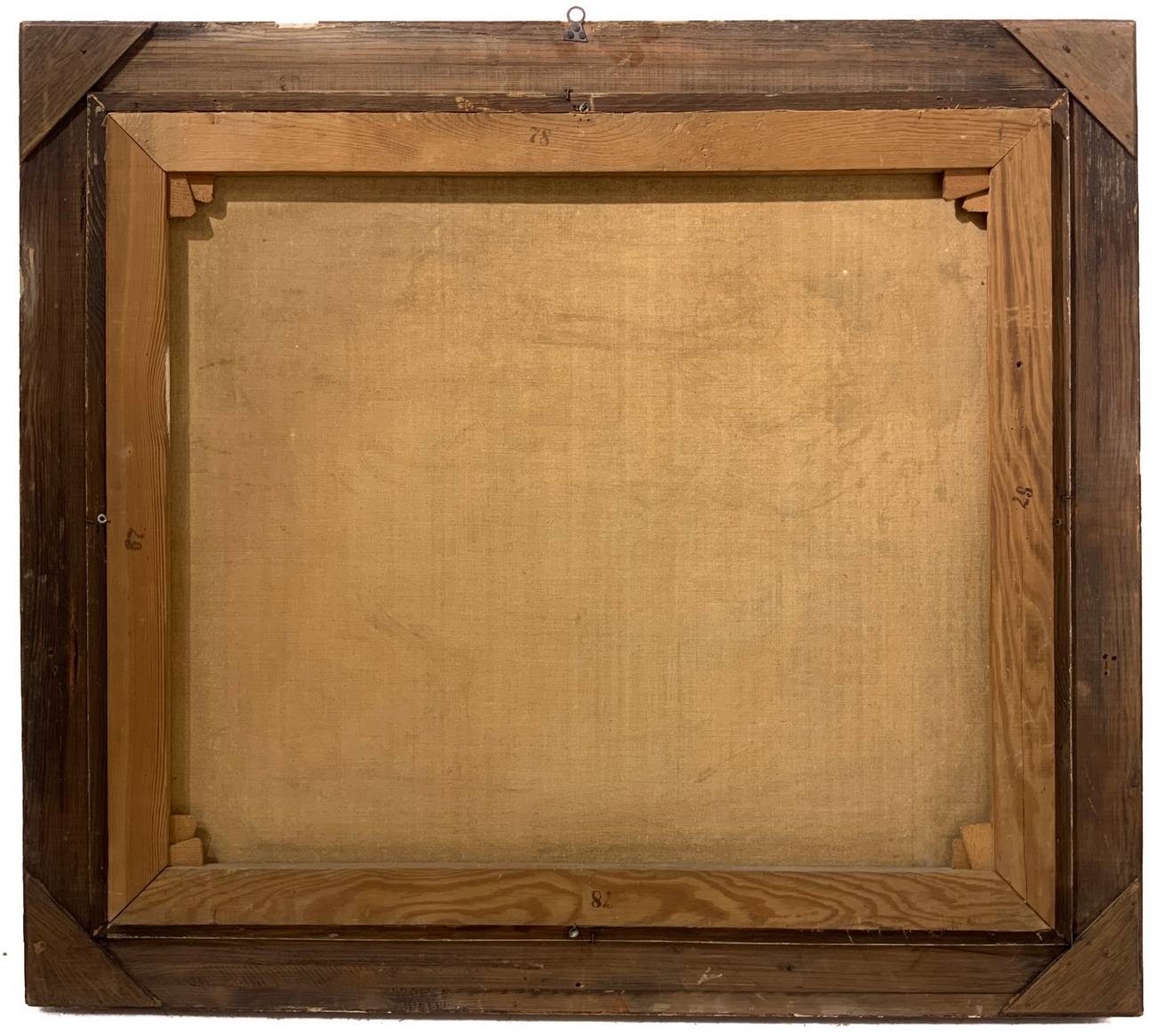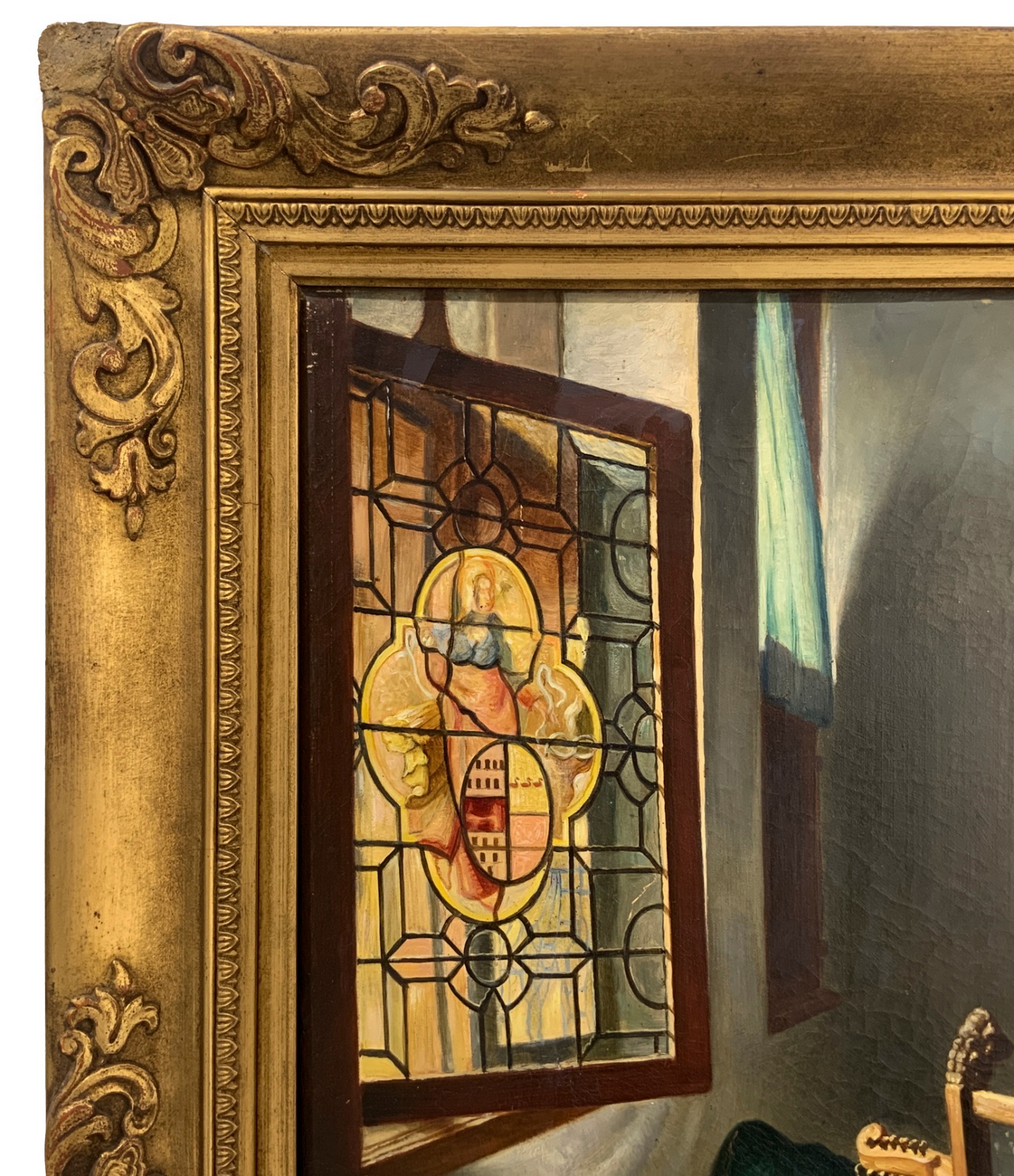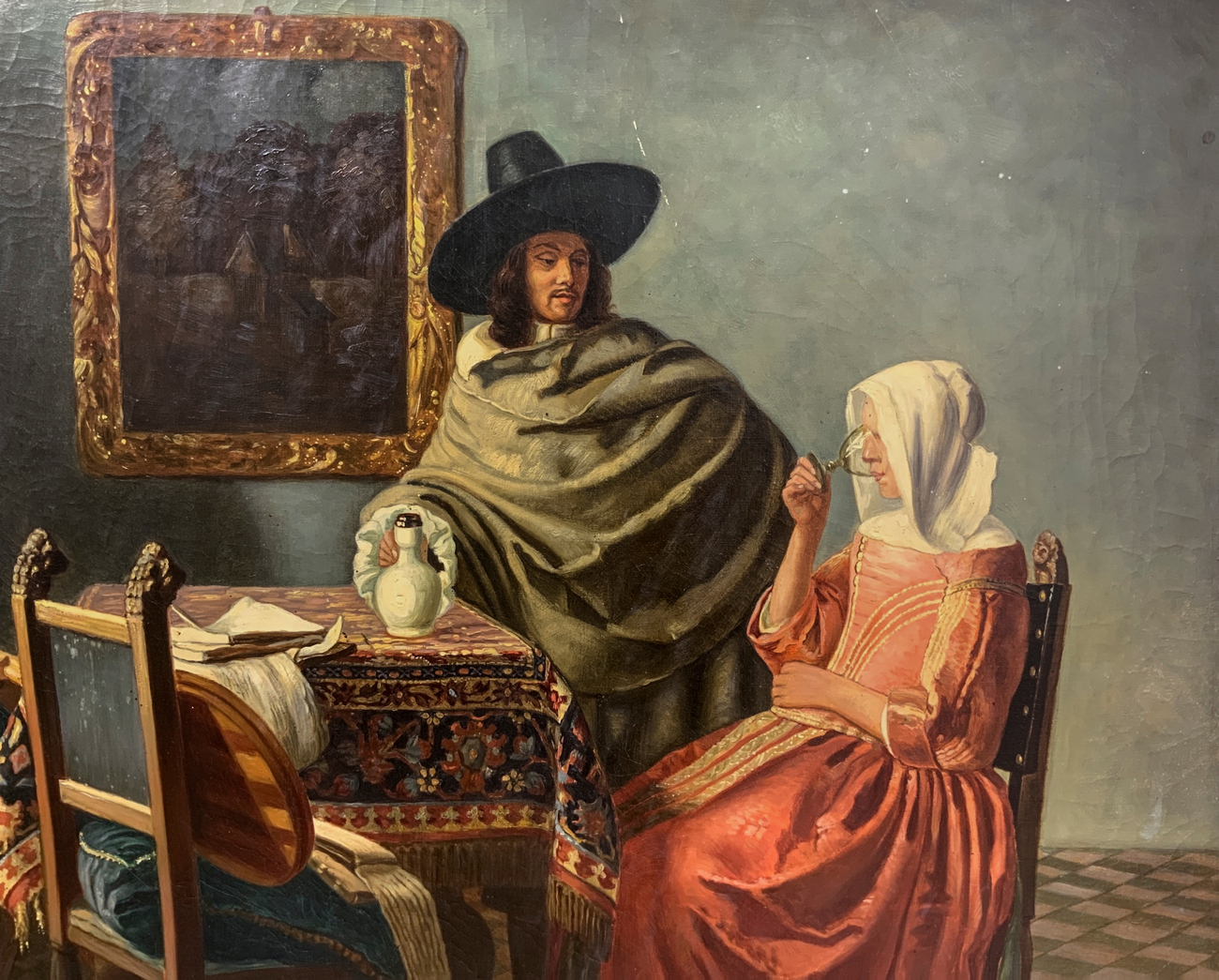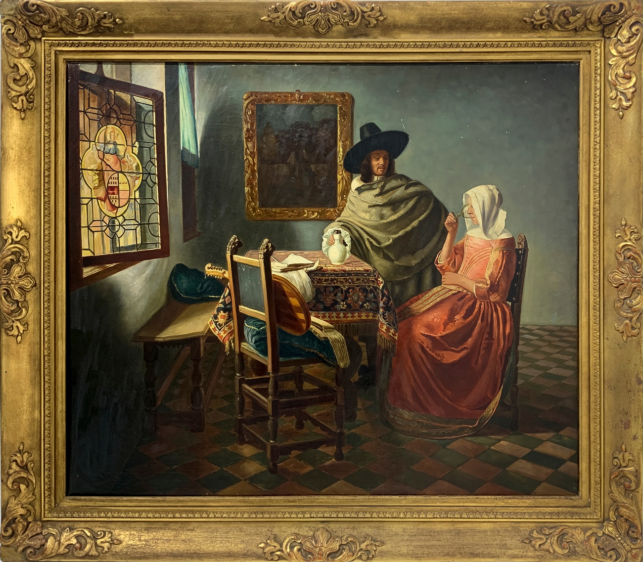 Dipinto ad olio su tela raffigurante personaggi in un interno, pittore olandese della fine del XIX secolo. Copia da Vermeer. Cm 68x78, in cornice cm 84x94