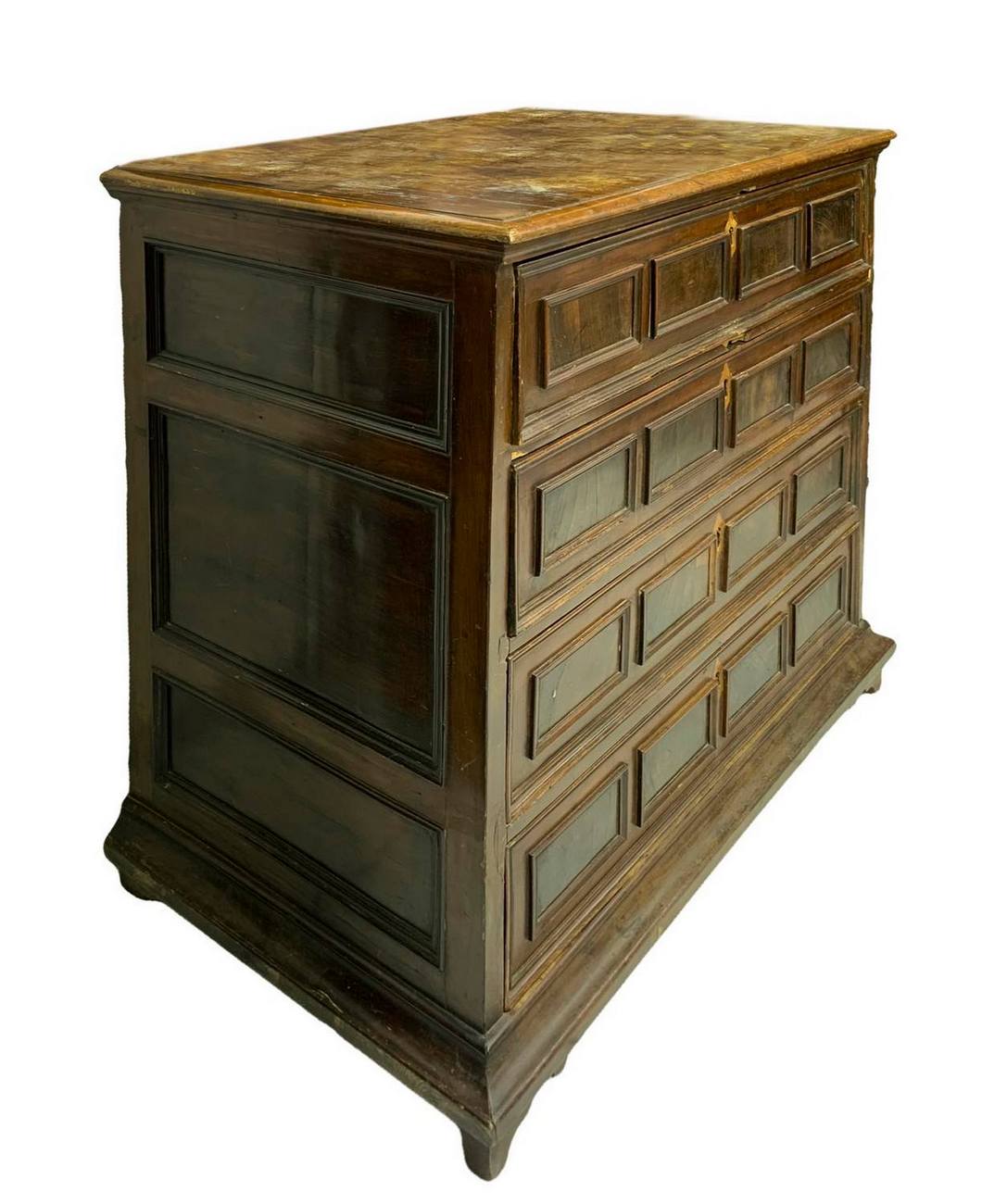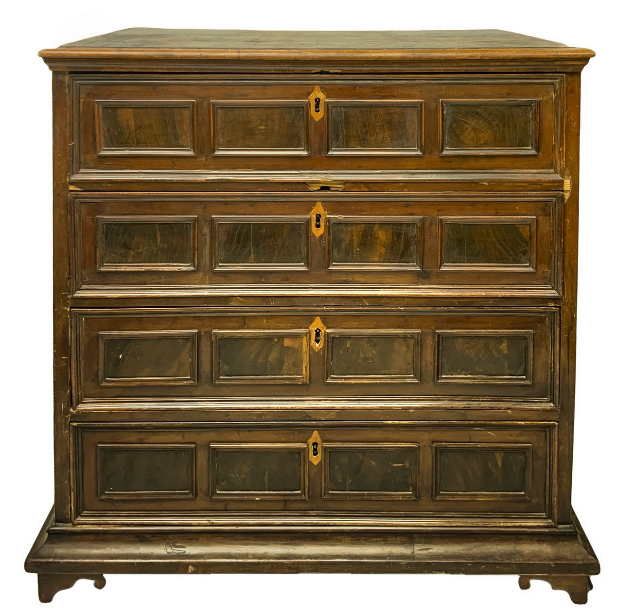 Cassettone in legno di noce, fine XVII secolo, Emilia. Sul fronte quattro cassetti decorati ciascuno con formelle lastronate in palissandro. Sui laterali grandi formelle entro cornici rettangolari. Piedi a mensola. H cm 125x105x60