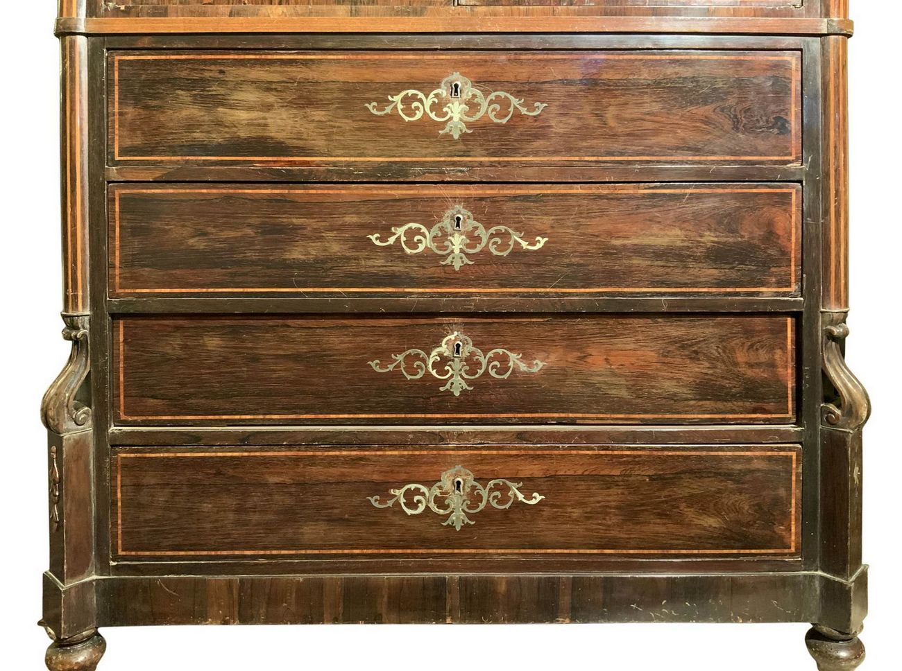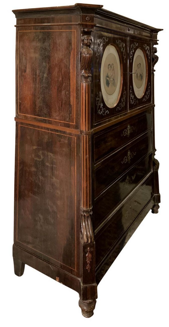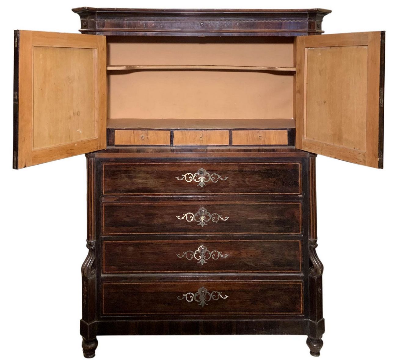 Chiffoniera in legno di palissandro con intarsi in metallo argentato, Sicilia, XIX secolo. Quattro cassetti alla base più due ante con stampe ovali sulla parte superiore. H cm 190, larghezza cm 123/140, profondità 52/56.