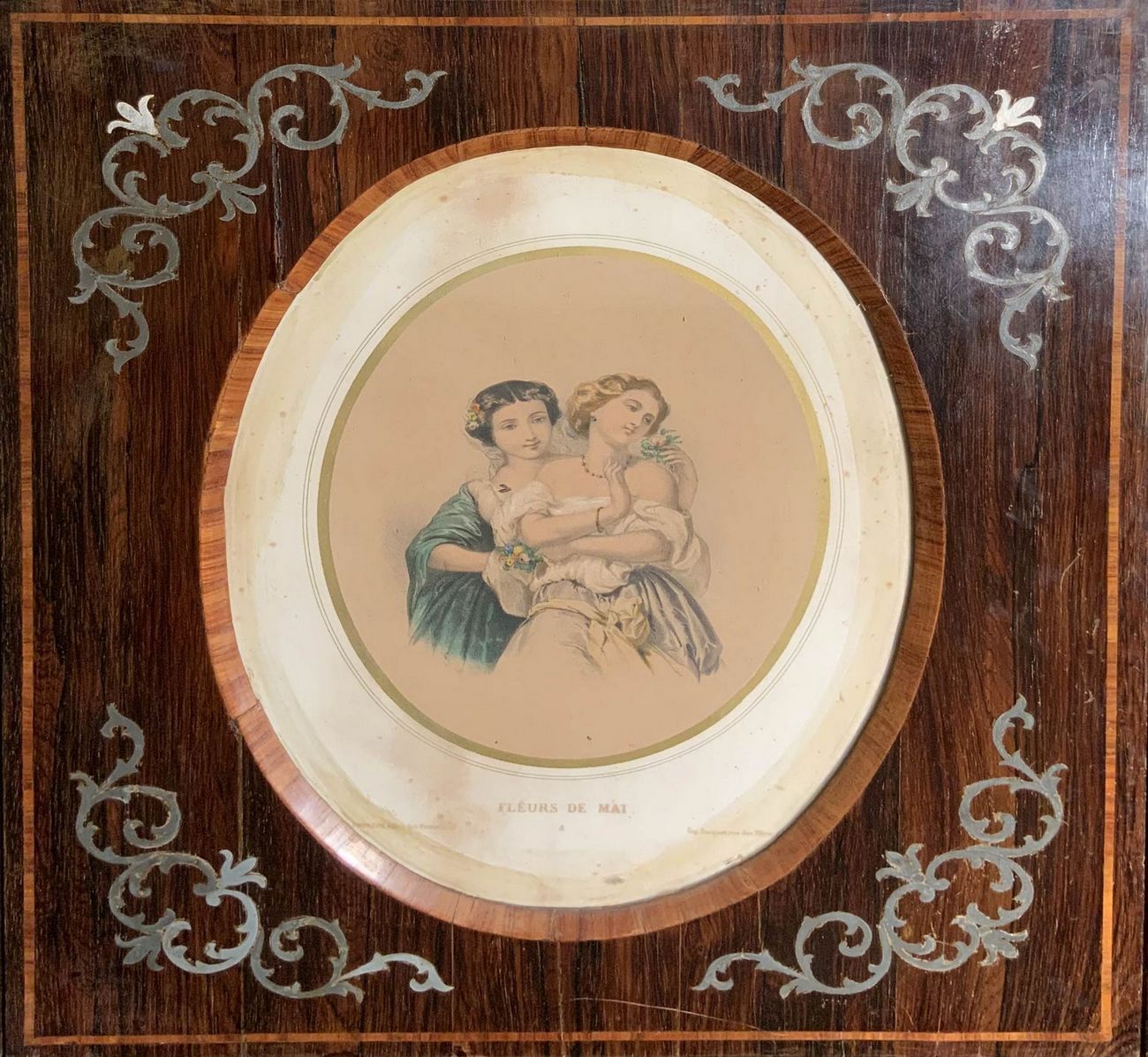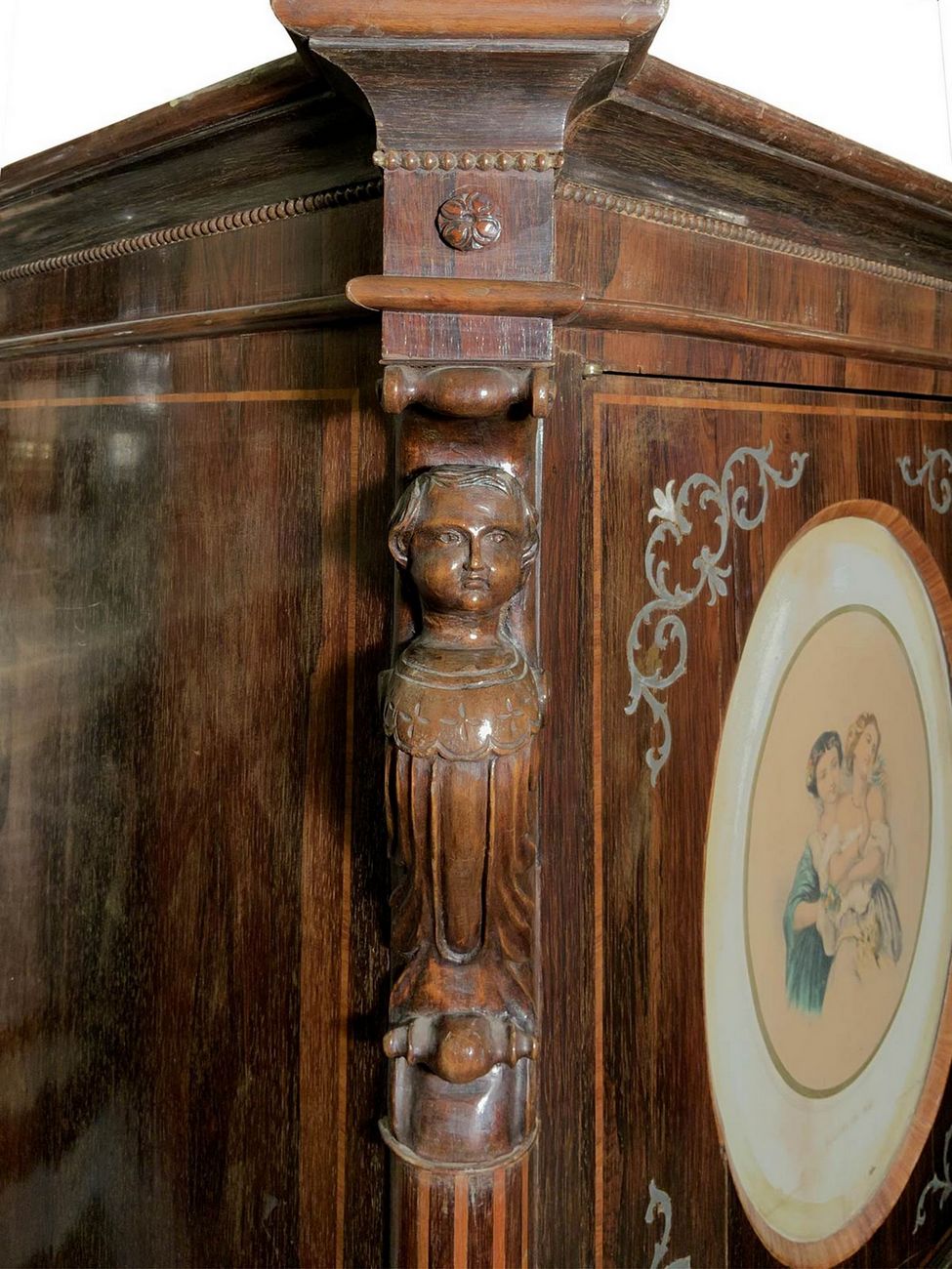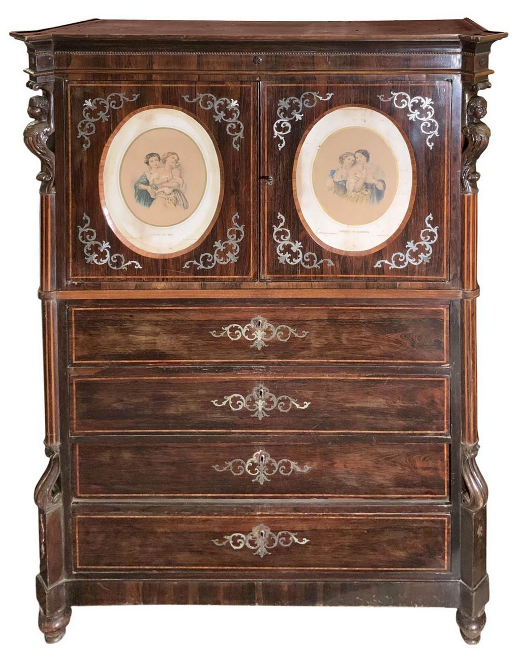 Chiffoniera in legno di palissandro con intarsi in metallo argentato, Sicilia, XIX secolo. Quattro cassetti alla base più due ante con stampe ovali sulla parte superiore. H cm 190, larghezza cm 123/140, profondità 52/56.