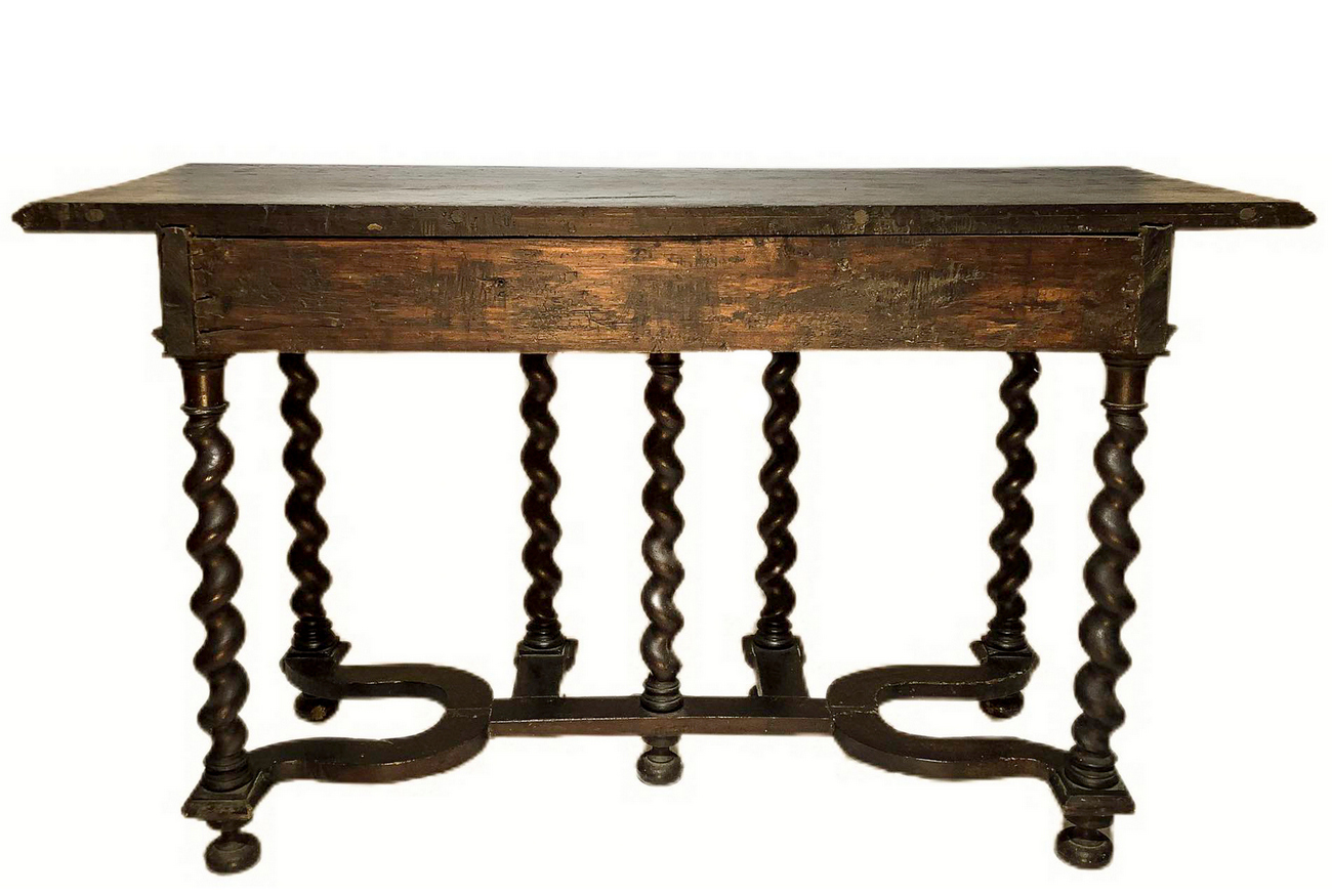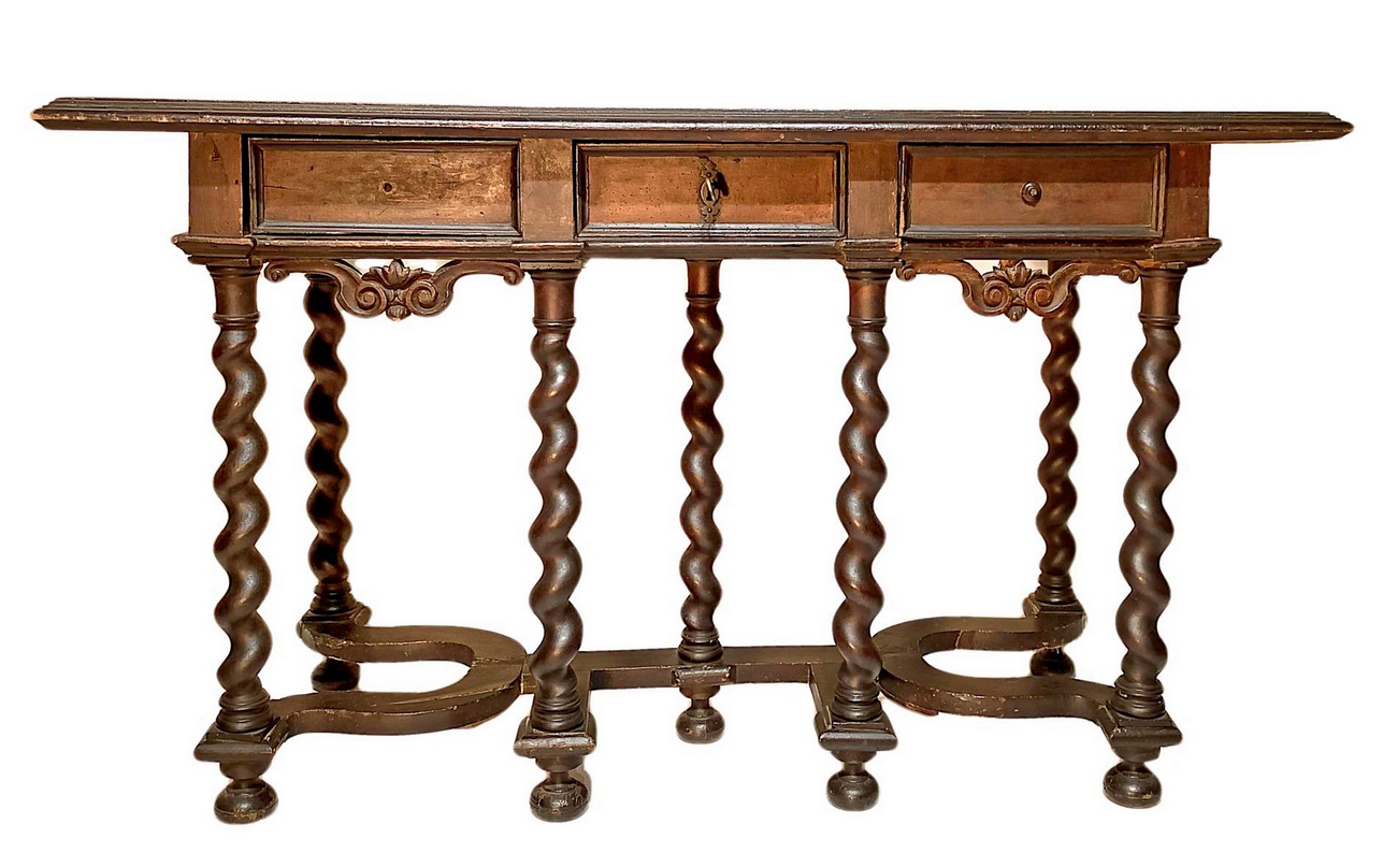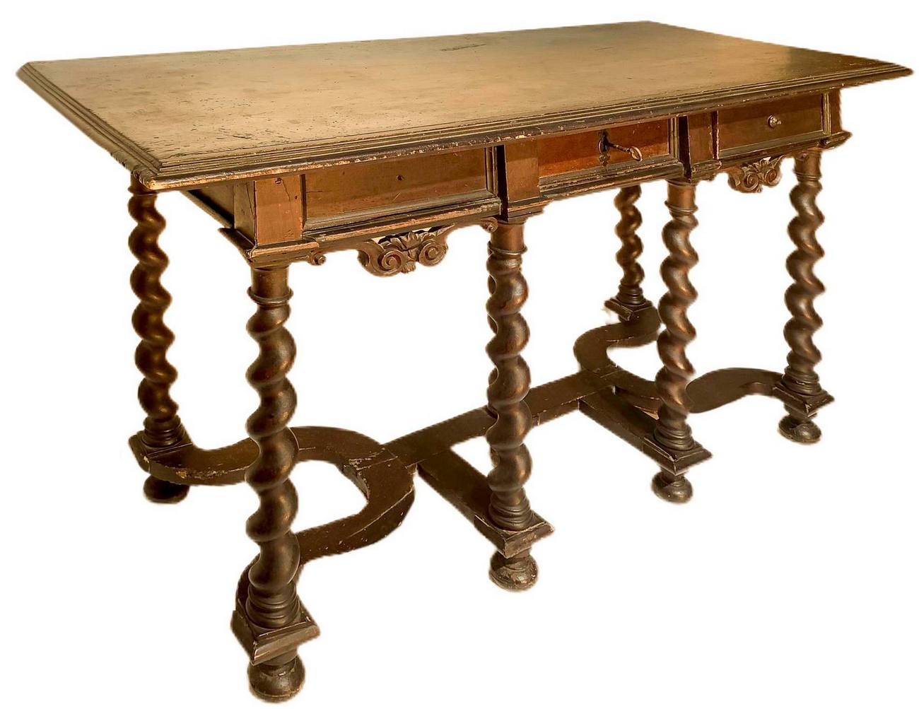 Tavolo scrittoio in legno massello di noce da muro, Luigi XIII, secolo XVII. Piano bordato a becco di civetta, tre cassetti al sottopiano n. 7 strutture a torciglione terminanti con basi a cipolla schiacciata. H cm 78x142x73
