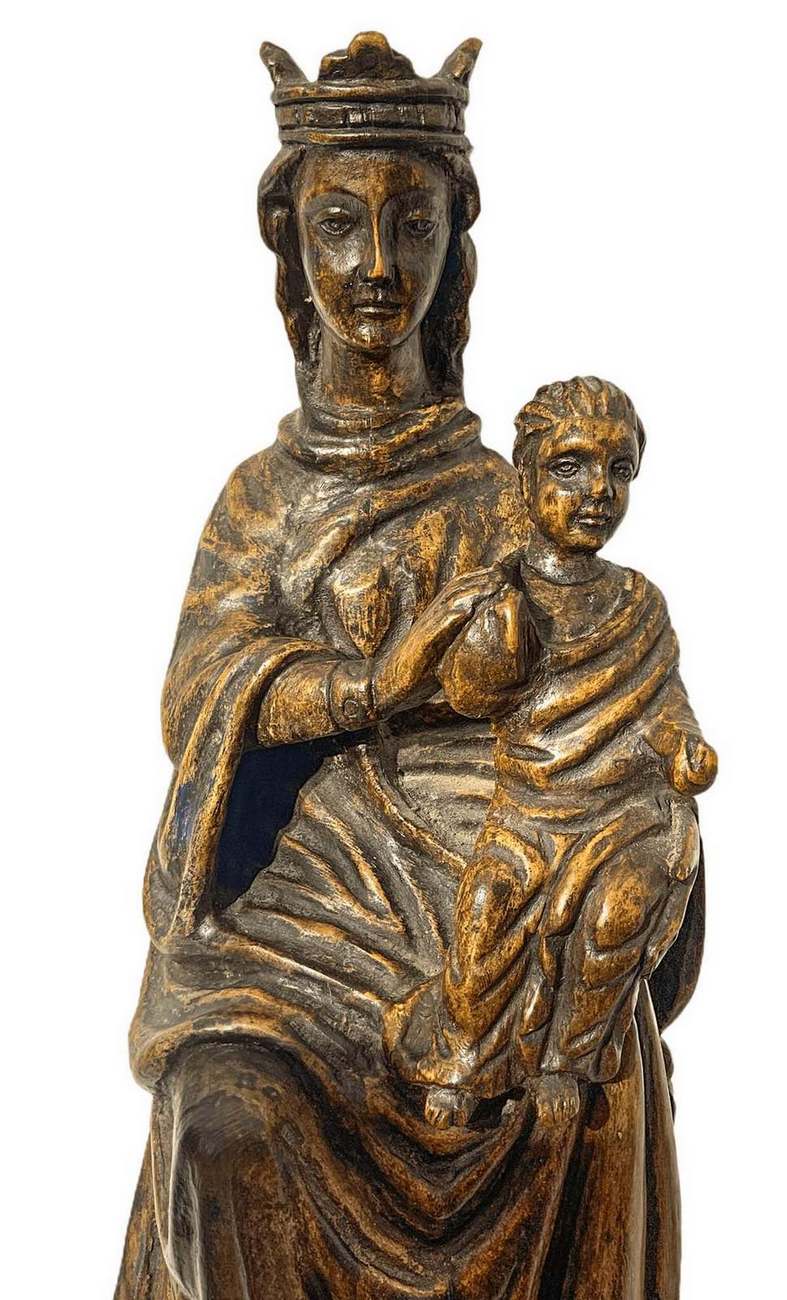 Statua lignea raffigurante Madonna con bambino, XV/XVI secolo. H cm 42. Base cm 18x15
