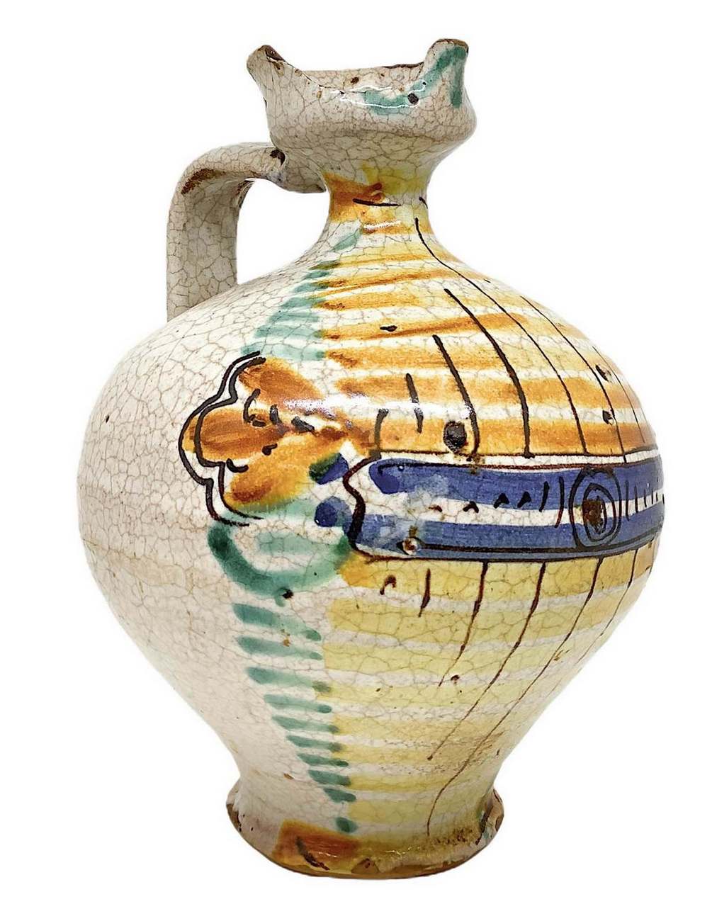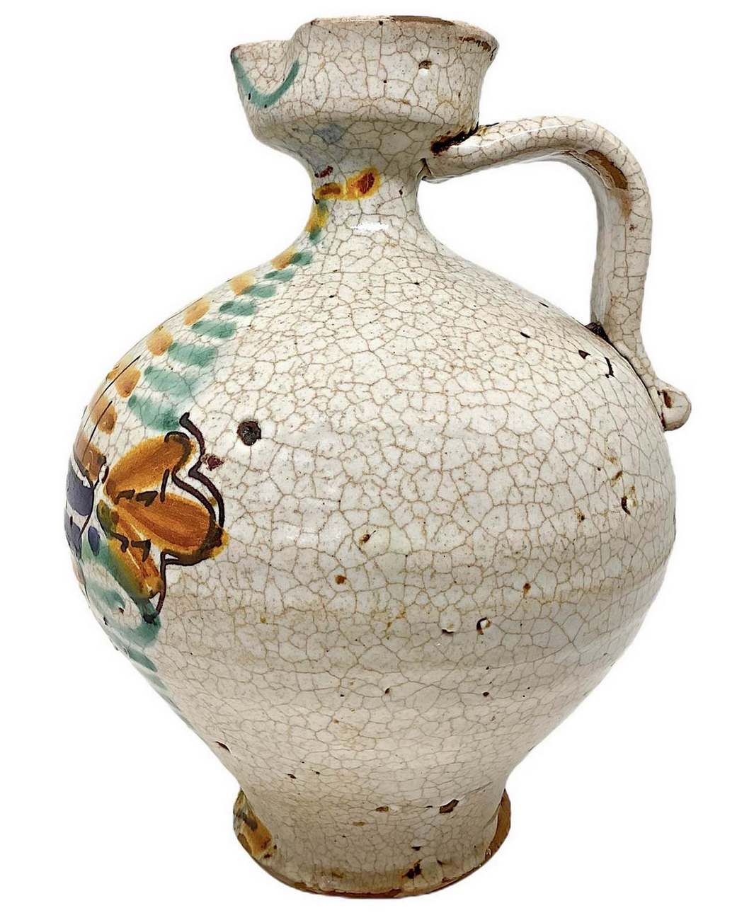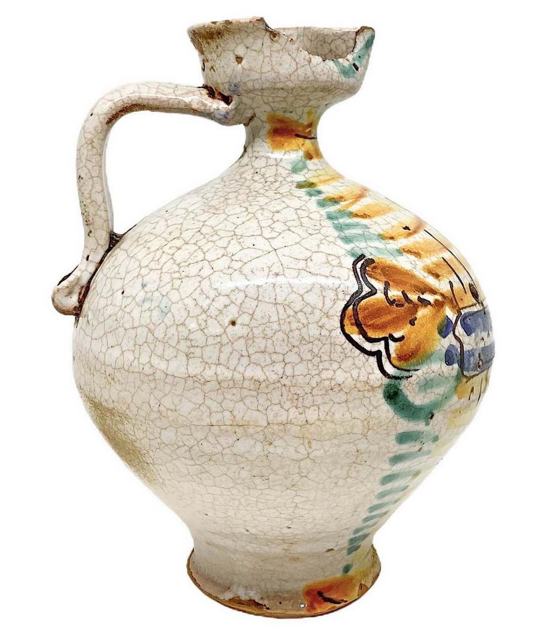 Versatoio con manico, fine XIX secolo. Nei toni del verde, giallo e blu. H cm 20. Piccola sbeccatura all’imbocco.