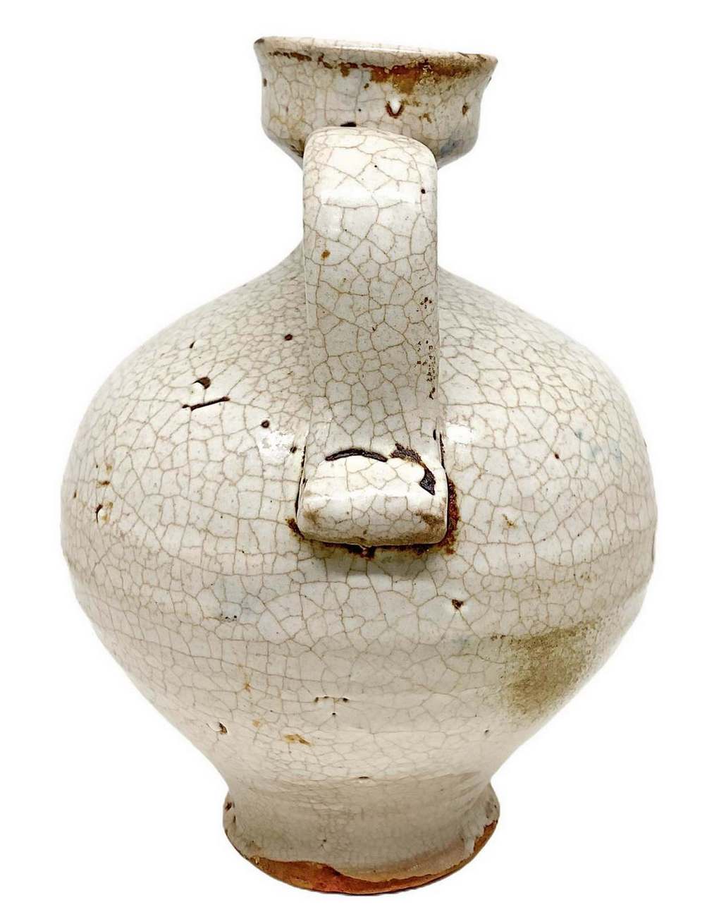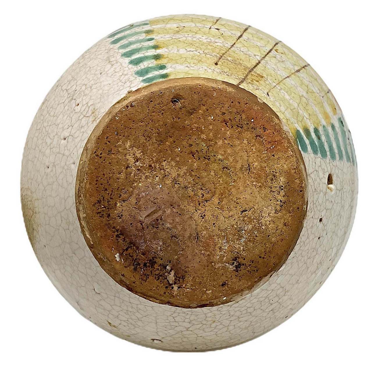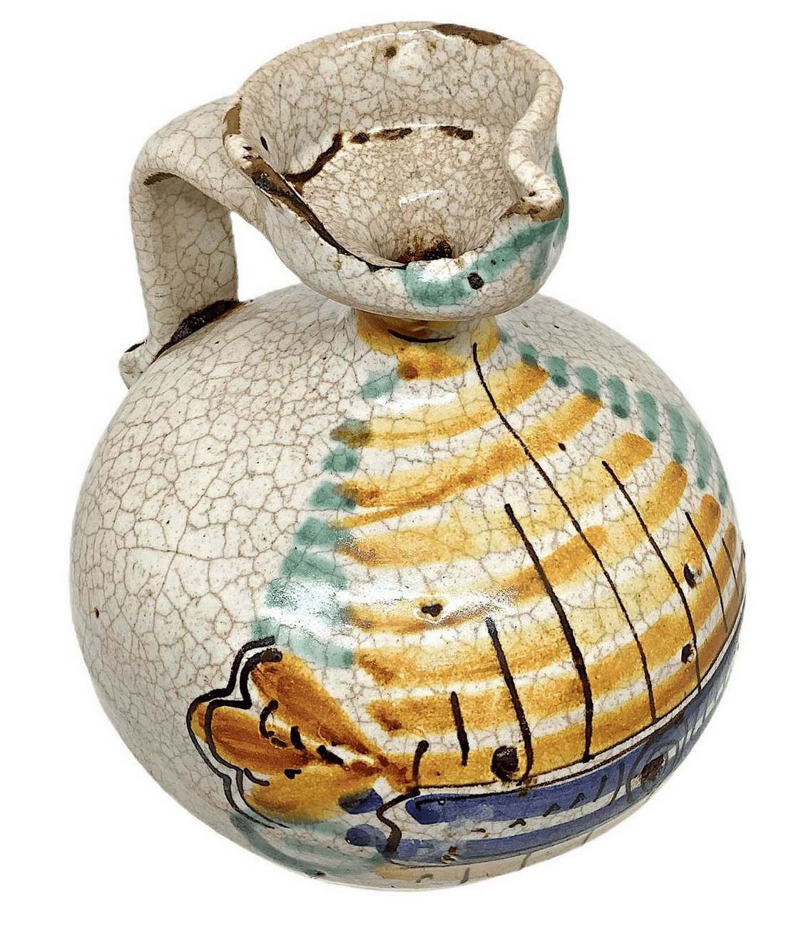 Versatoio con manico, fine XIX secolo. Nei toni del verde, giallo e blu. H cm 20. Piccola sbeccatura all’imbocco.