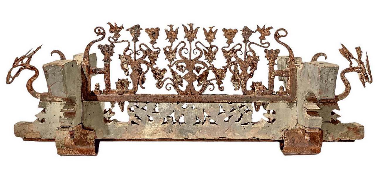 Frammento di carretto, fascia di fuso. In legno policromo scolpito a putti, mascheroni e ferro battuto alla forgia in st