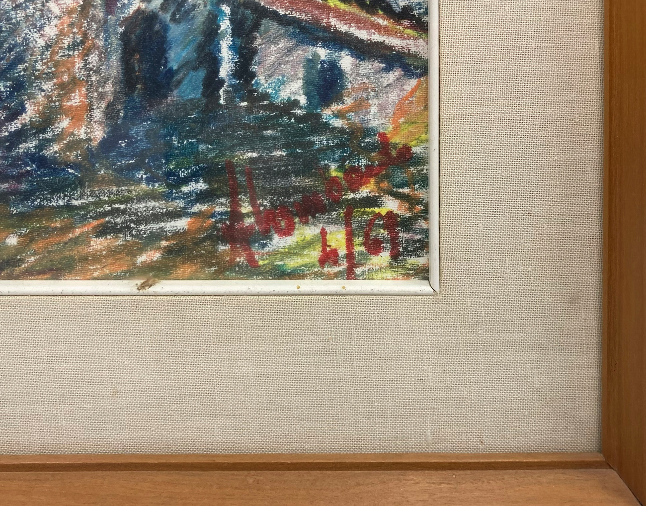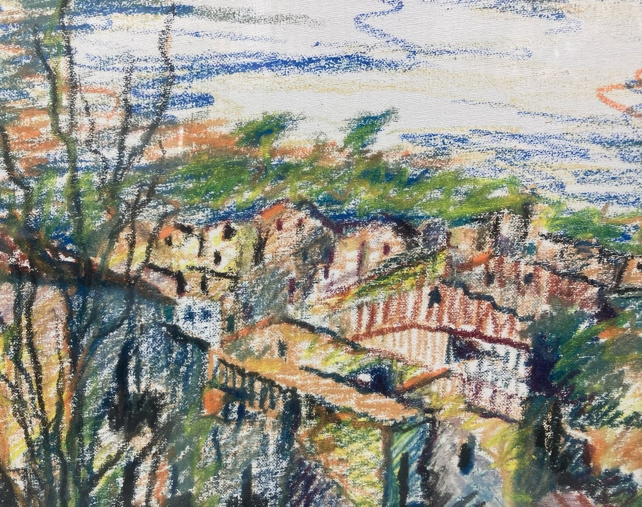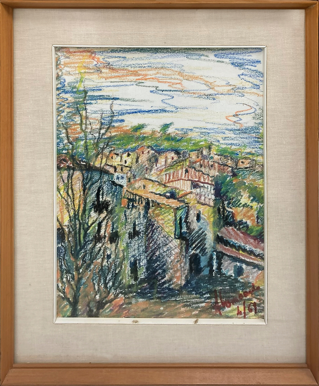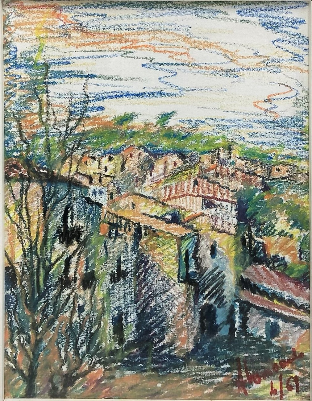 Pastello su cartoncino raffigurante paesaggio di Caltagirone. Metà XX secolo. Firmato e datato Lombardo 4/69. Cm 39x28,5, in cornice cm 51,5x41