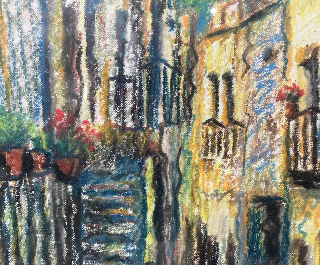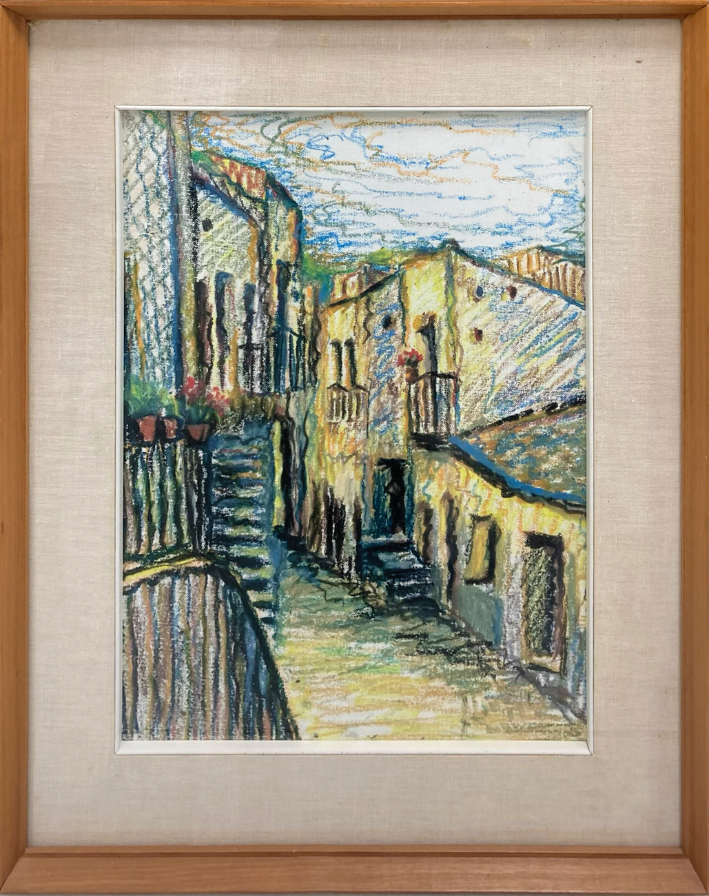 Pastello su cartoncino raffigurante paesaggio di Caltagirone. Metà XX secolo. Cm 39x28,5, in cornice cm 51,5x41