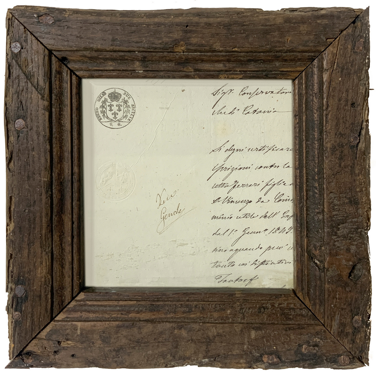 Frammento cartaceo con timbri a secco del Regno delle Due Sicilie e timbro ad inchiostro del Regno delle Due Sicilie, XVIII/XIX secolo. In cornice povera in legno di noce. Cm 25,5x25,5 (3)