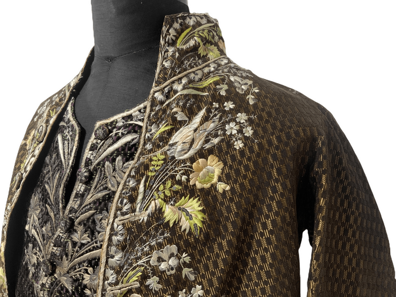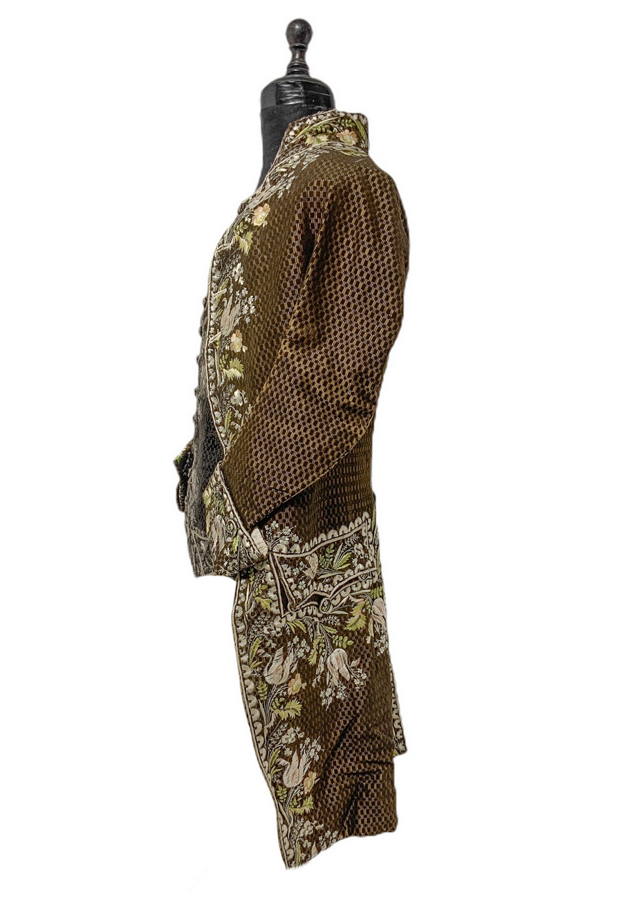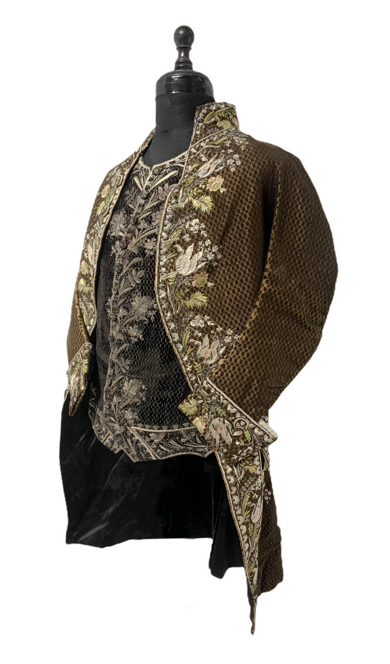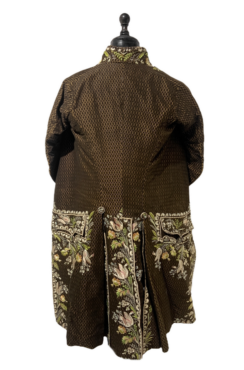 Antico ed importante vestito di corte francese, 1750/1775. Con decorazioni floreali ricamati in seta.