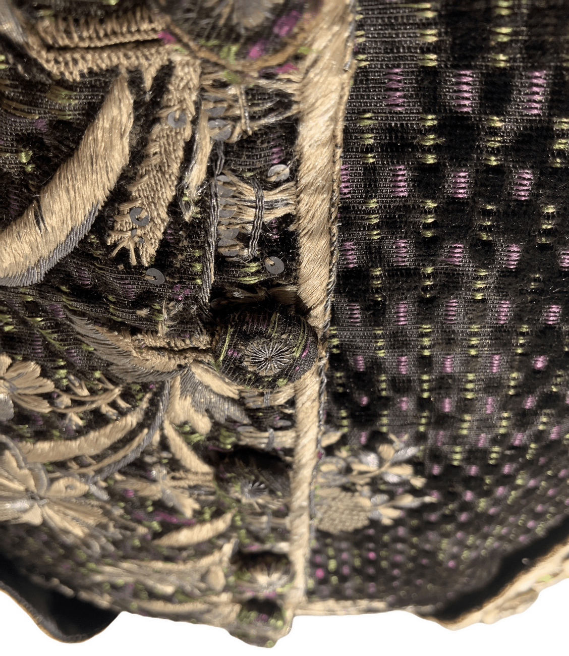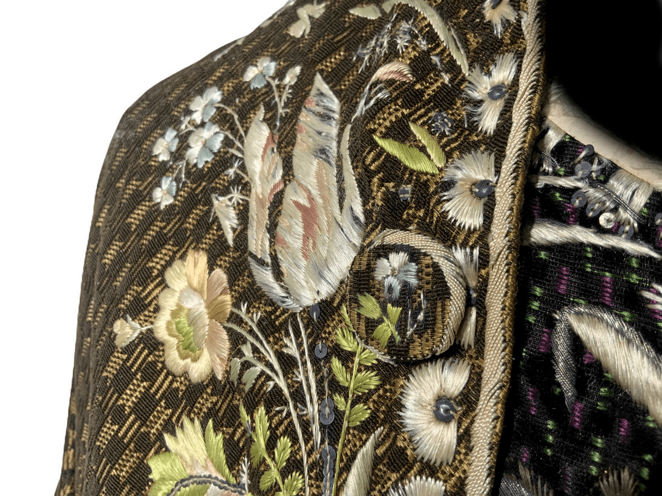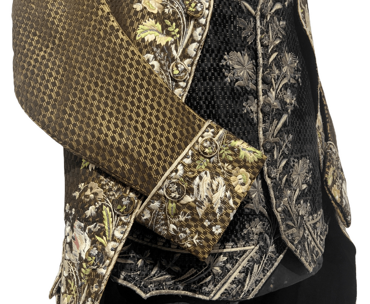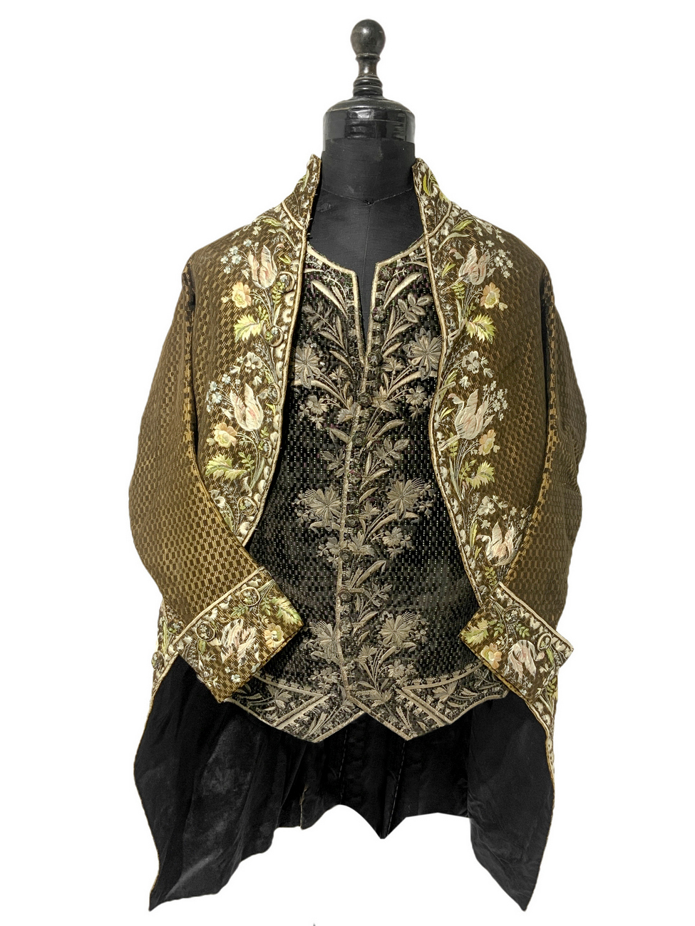 Antico ed importante vestito di corte francese, 1750/1775. Con decorazioni floreali ricamati in seta.