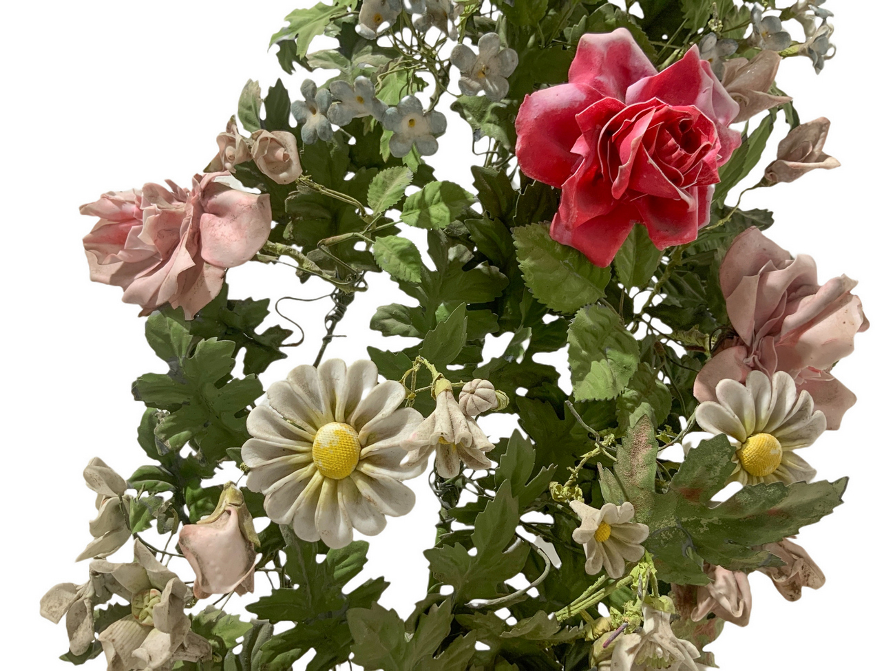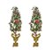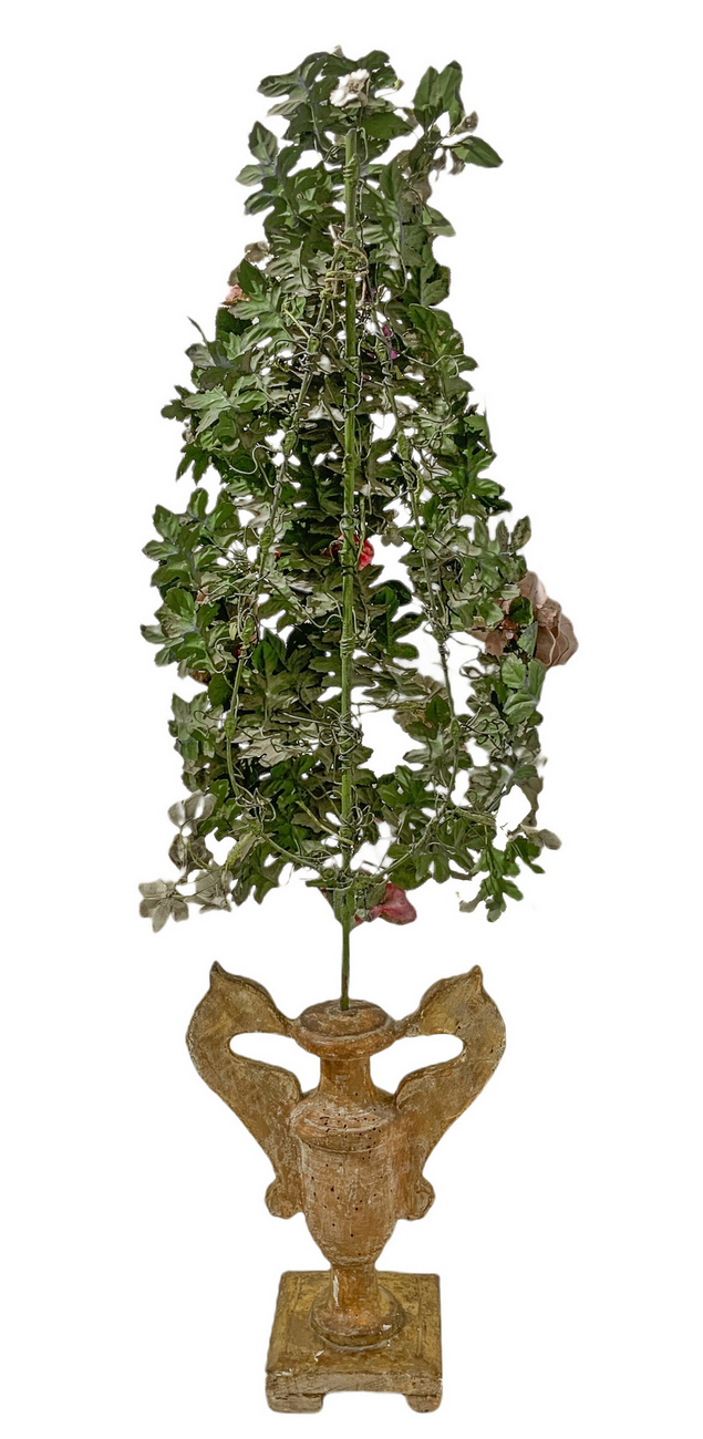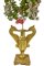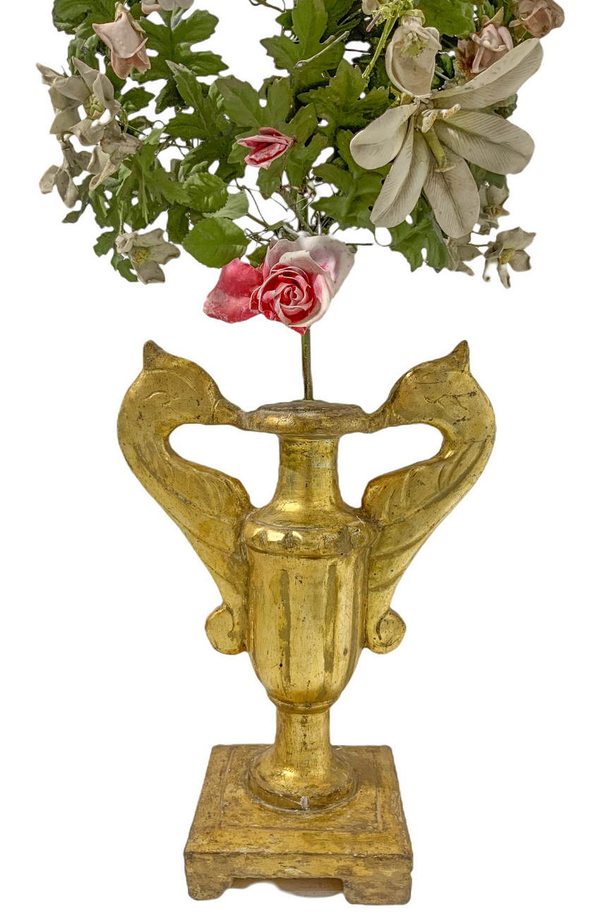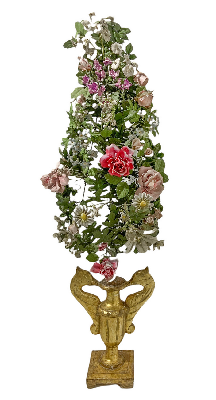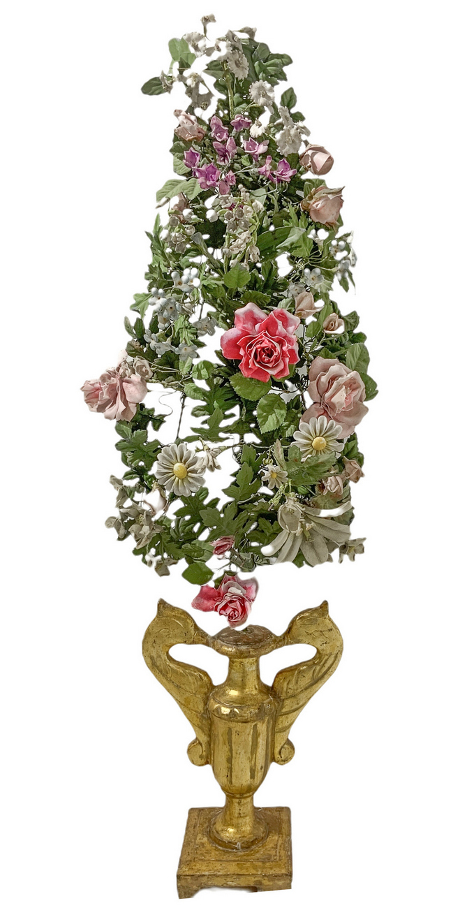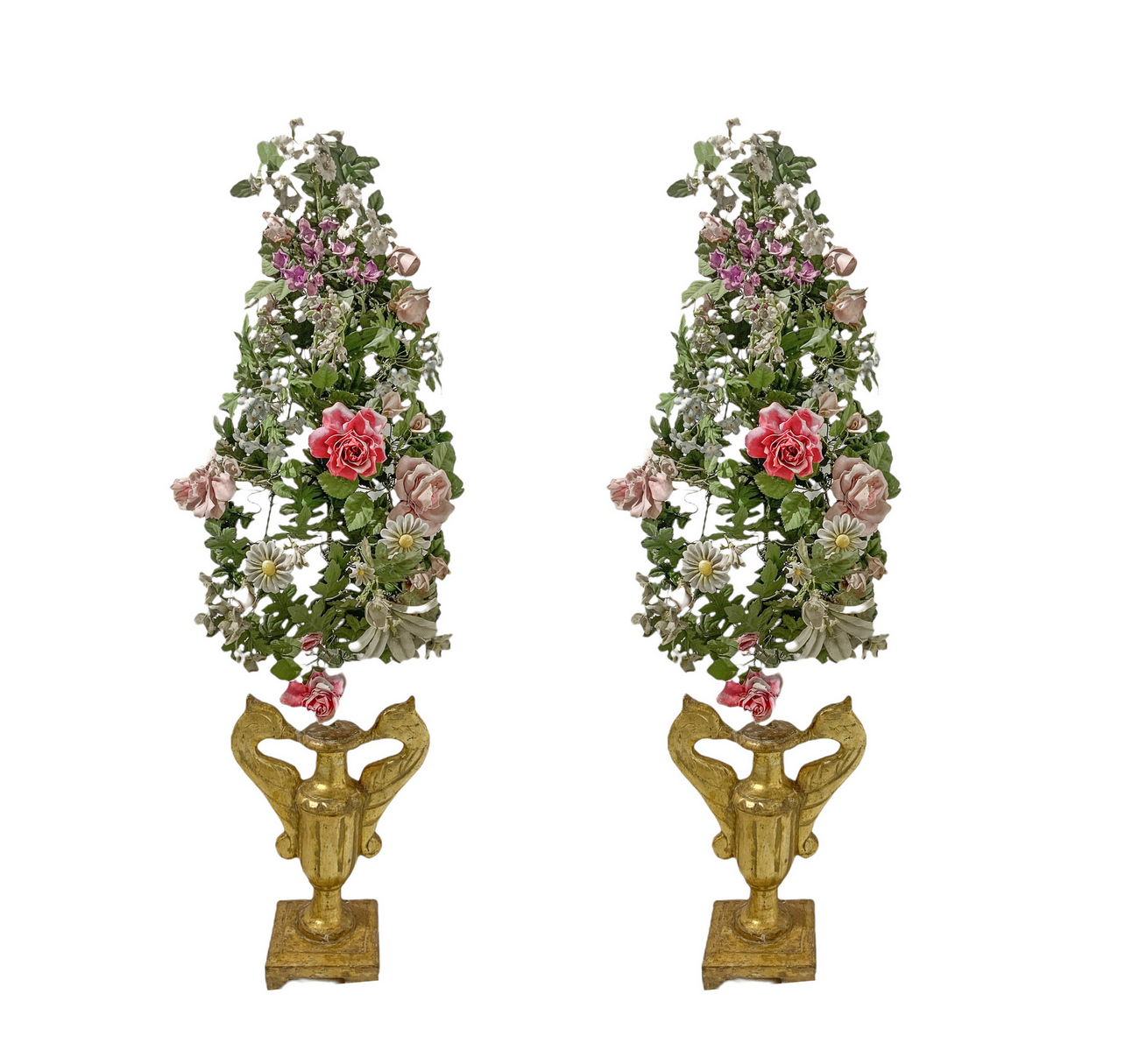 Coppia di vasi in legno dorato con ghirlanda di fiori in porcellana e metallo, Toscana, XIX secolo. H cm 115