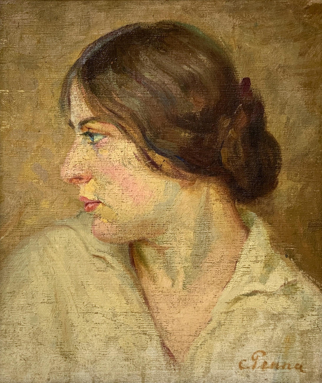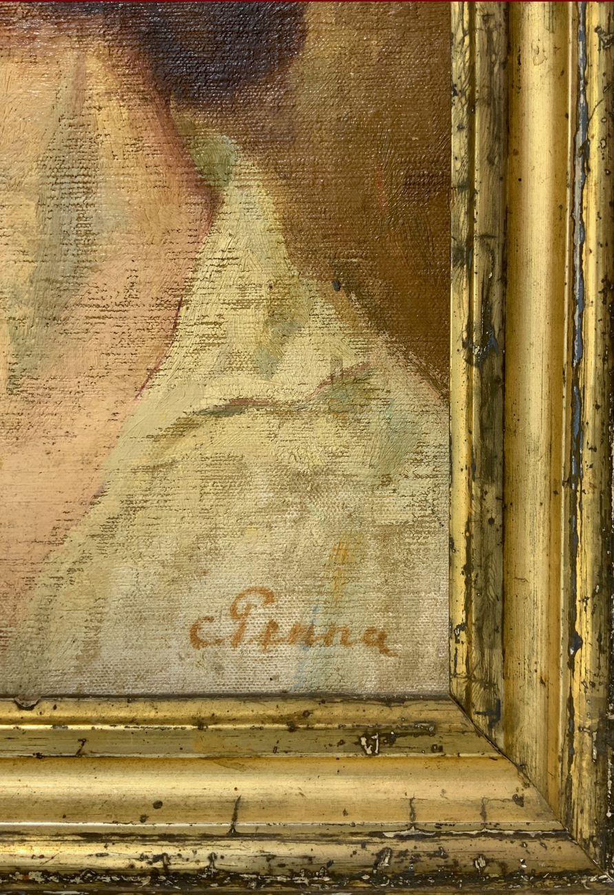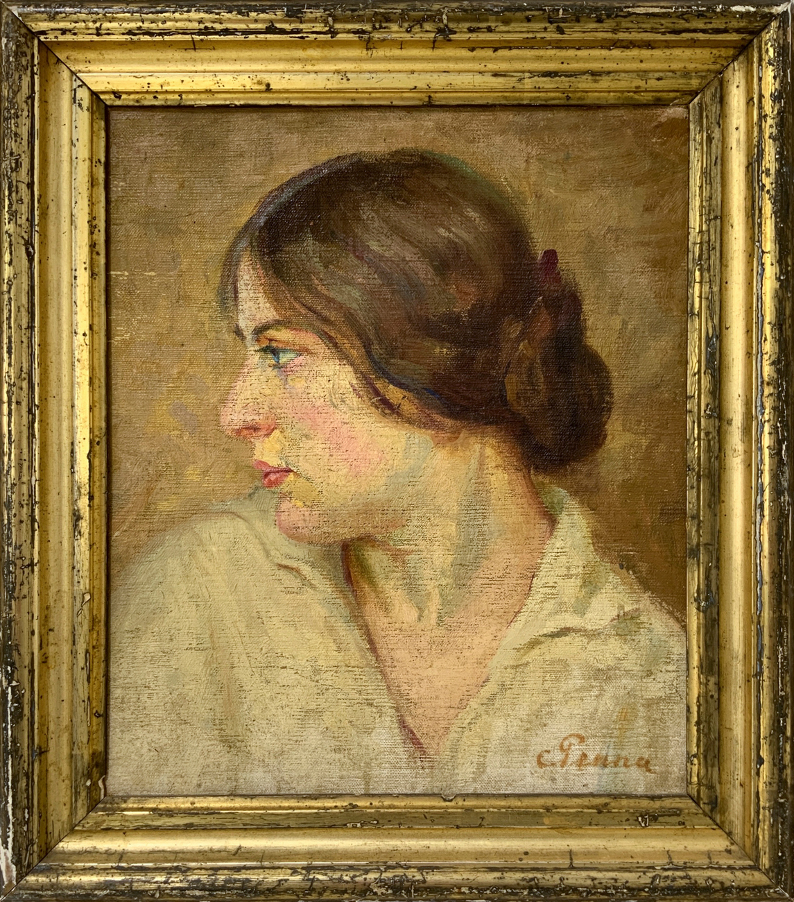 Dipinto ad olio su compensato raffigurante profilo di donna, prima metà del XX secolo. Firmato in basso a destra C.Penna. Cm 40x34 in cornice cm 49x42