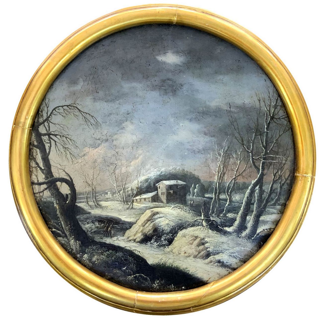 Dipinto ad olio su tela rotonda raffigurante paesaggio innevato, seconda metà del XVIII secolo. Diametro cm 27.