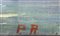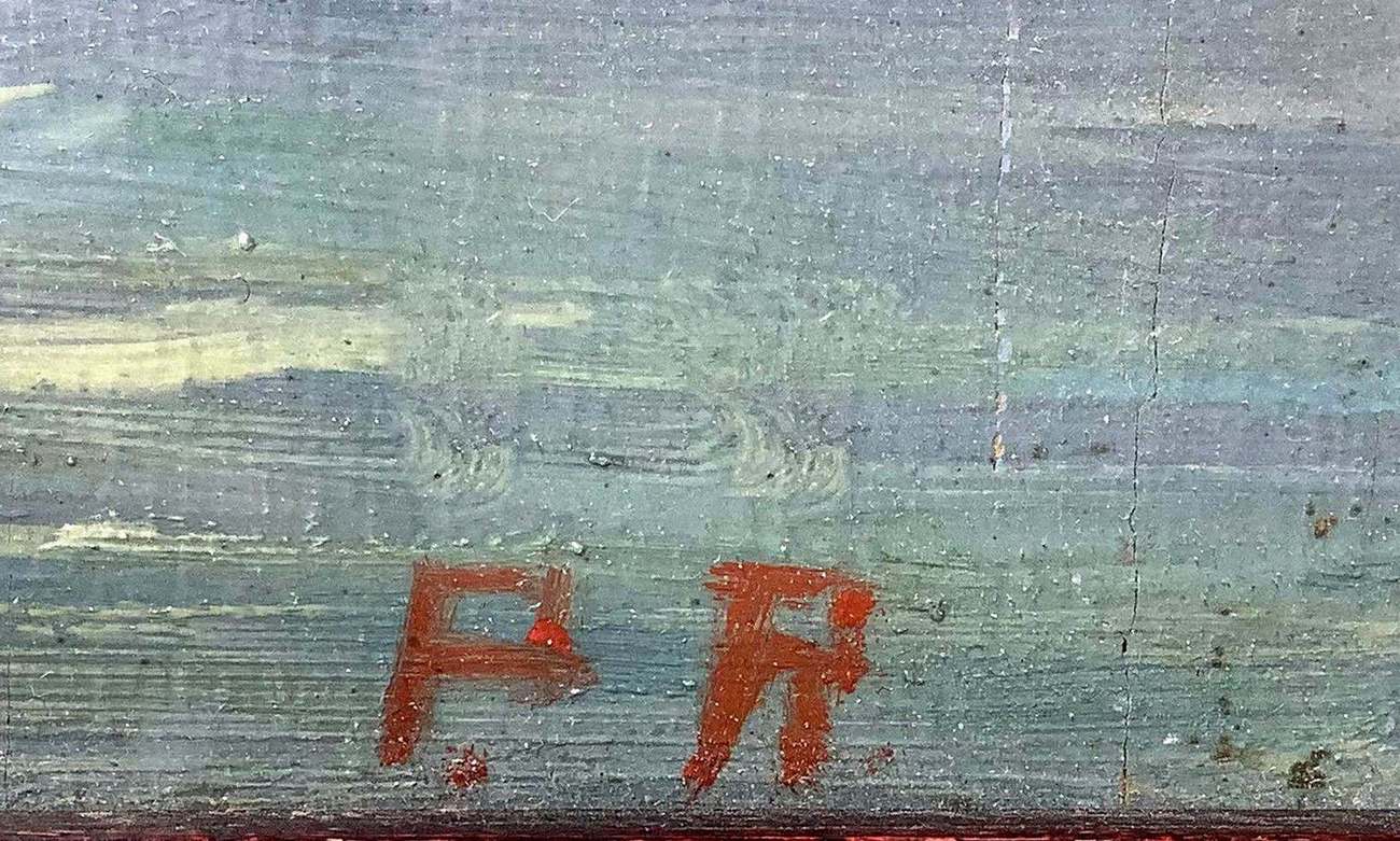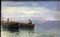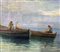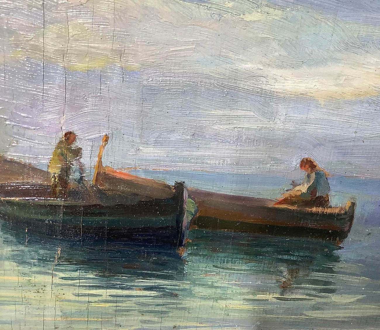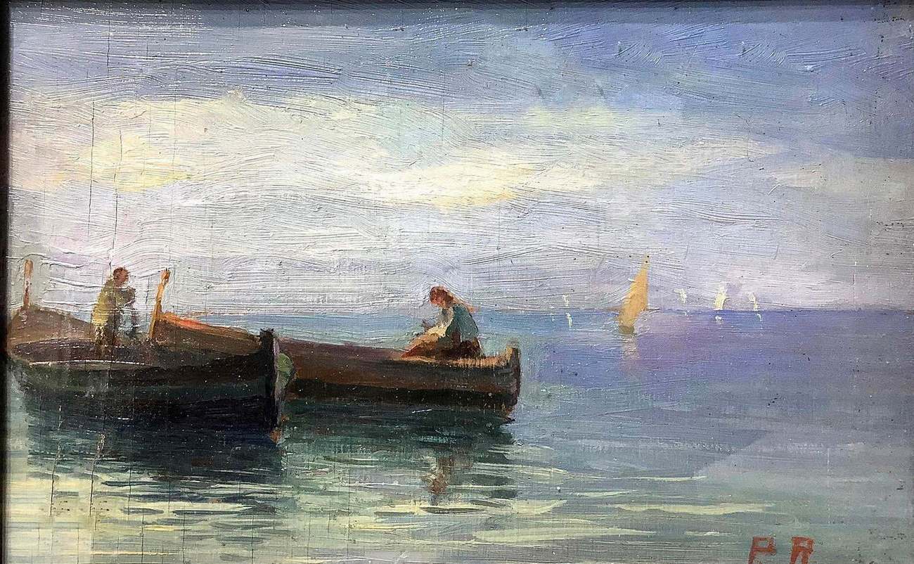 Olio su tela applicata a tavola raffigurante marina con barche, XX secolo. Cm 18x27, con cornice cm 33x43. Firmato P.A.