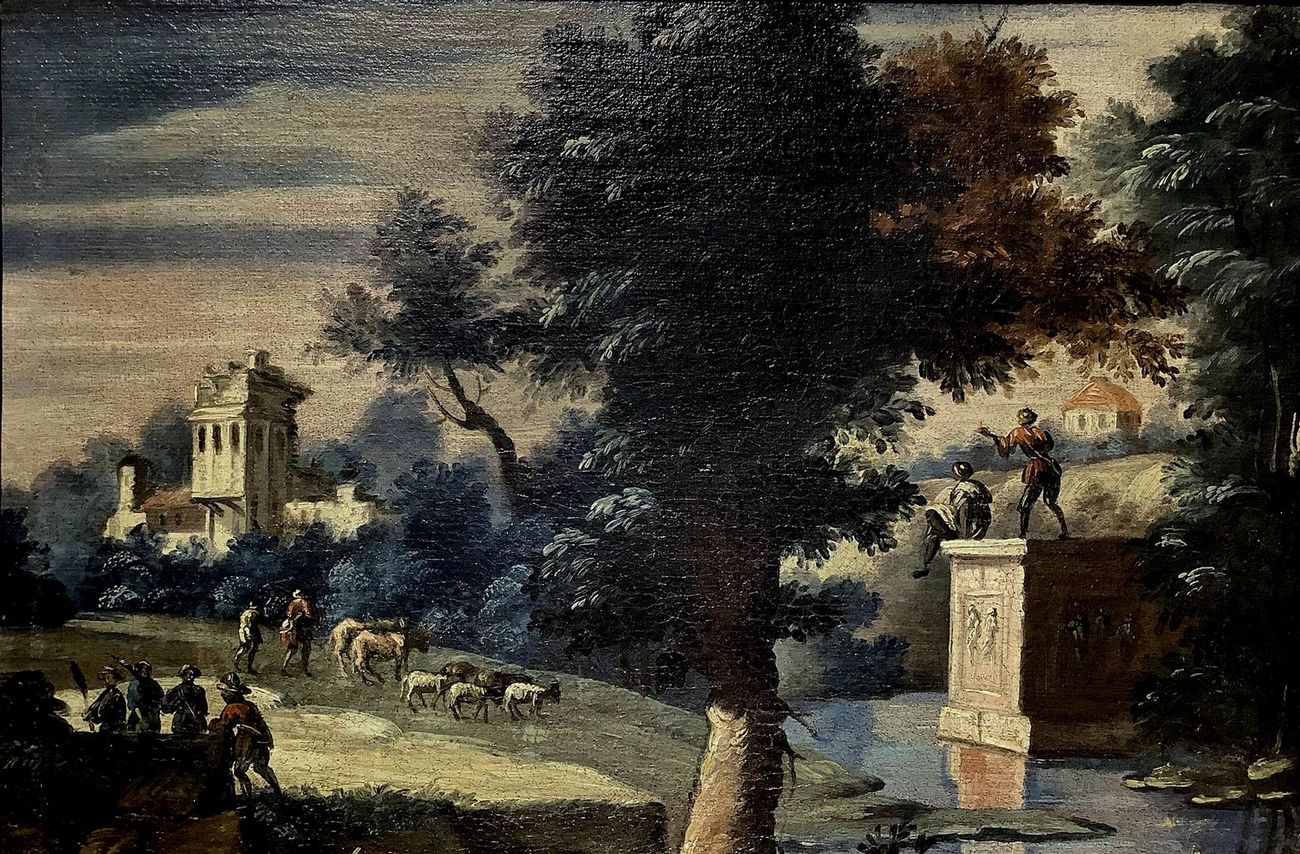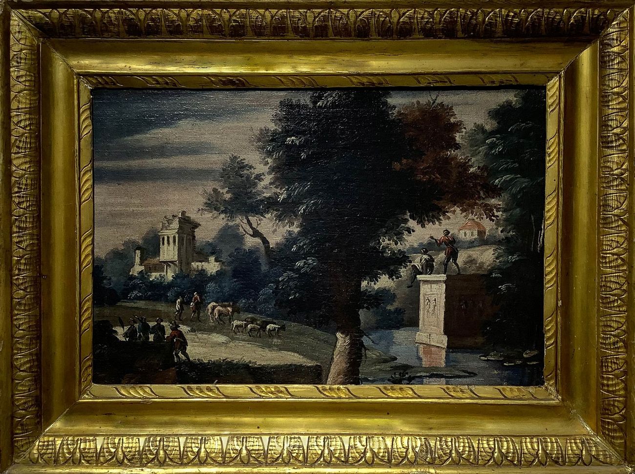 Dipinto ad olio su tela raffigurante paesaggio con personaggi e armenti. Pittore del XVII secolo. Cm 34x49,5 olio su tel