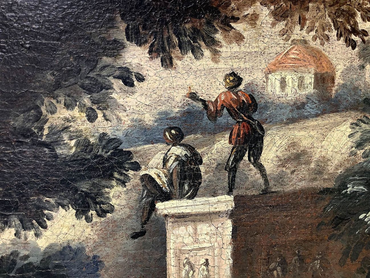 Dipinto ad olio su tela raffigurante paesaggio con personaggi e armenti. Pittore del XVII secolo. Cm 34x49,5 olio su tela