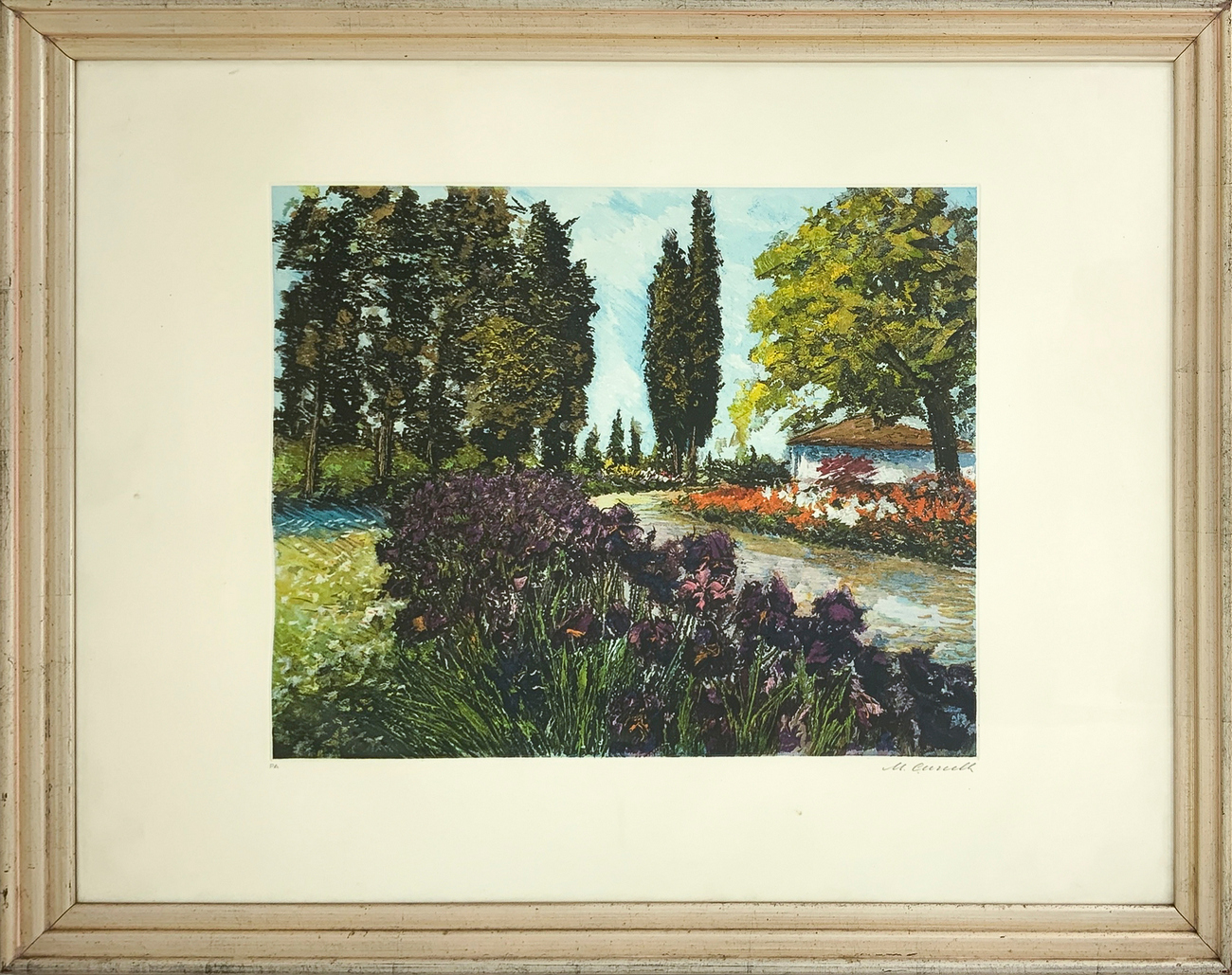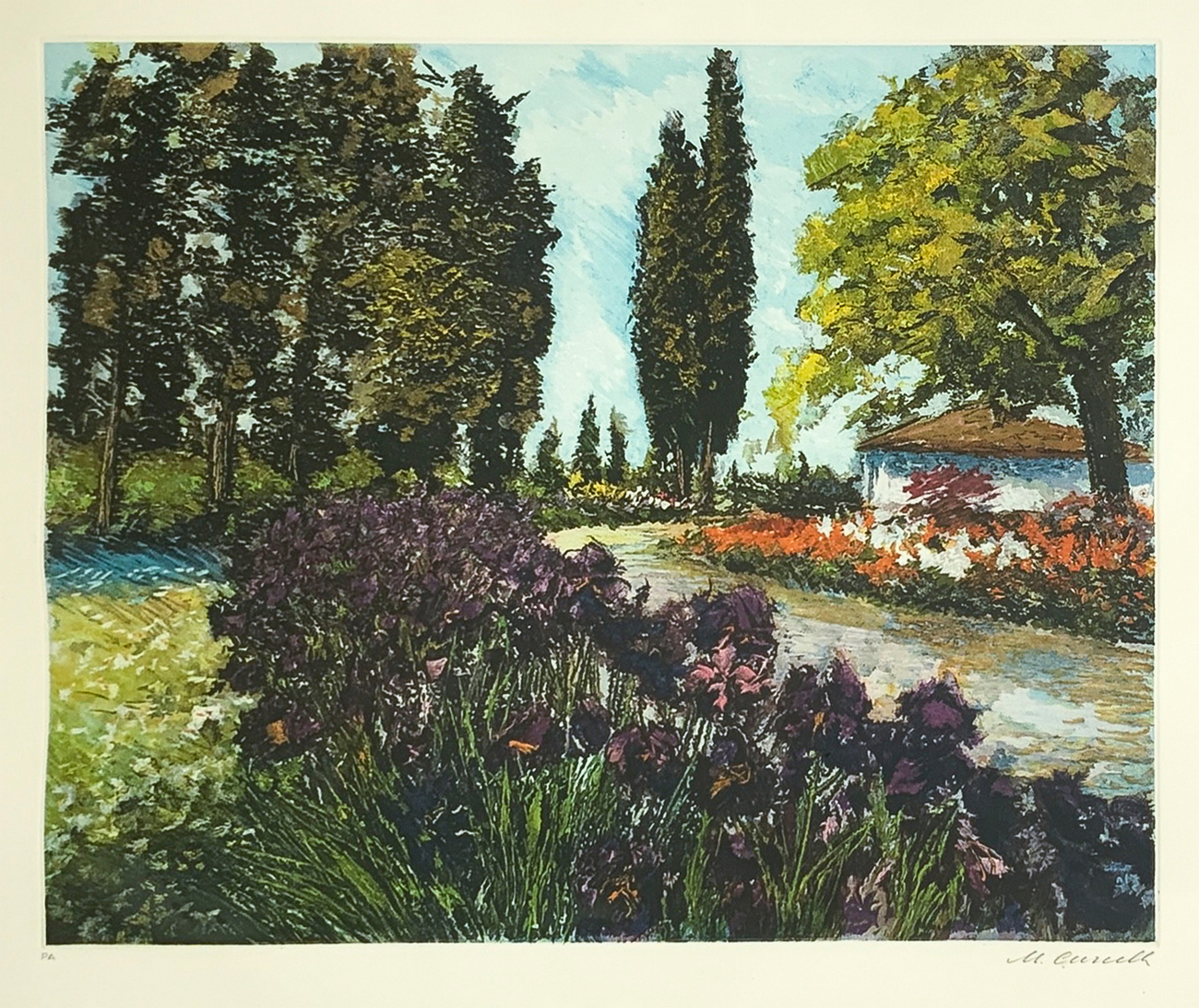 Cascella Michele (Ortona 1892- 1989 Milano), litografia raffigurante casa in campo di fiori, 33/200. Firmata in basso a destra M. Cascella. In cornice cm 64x84