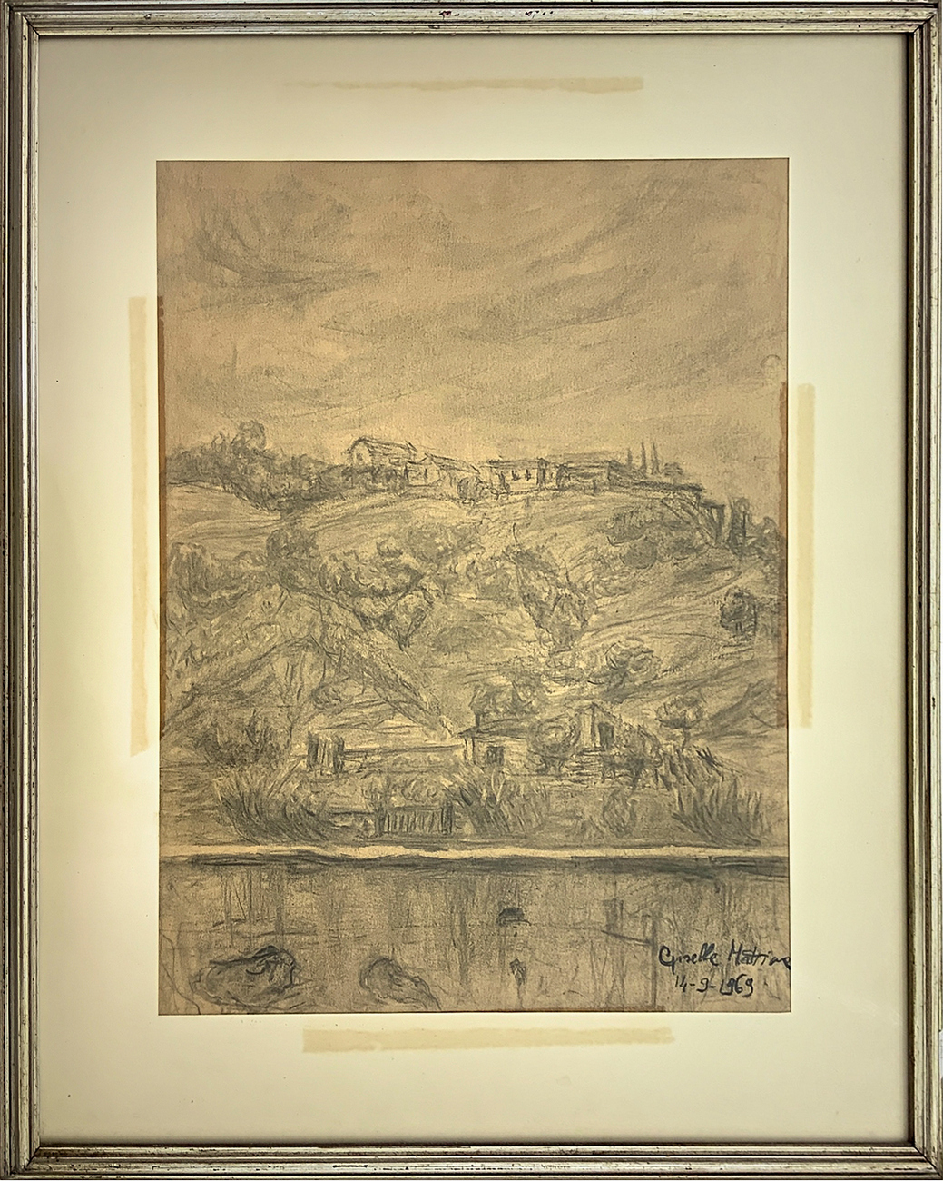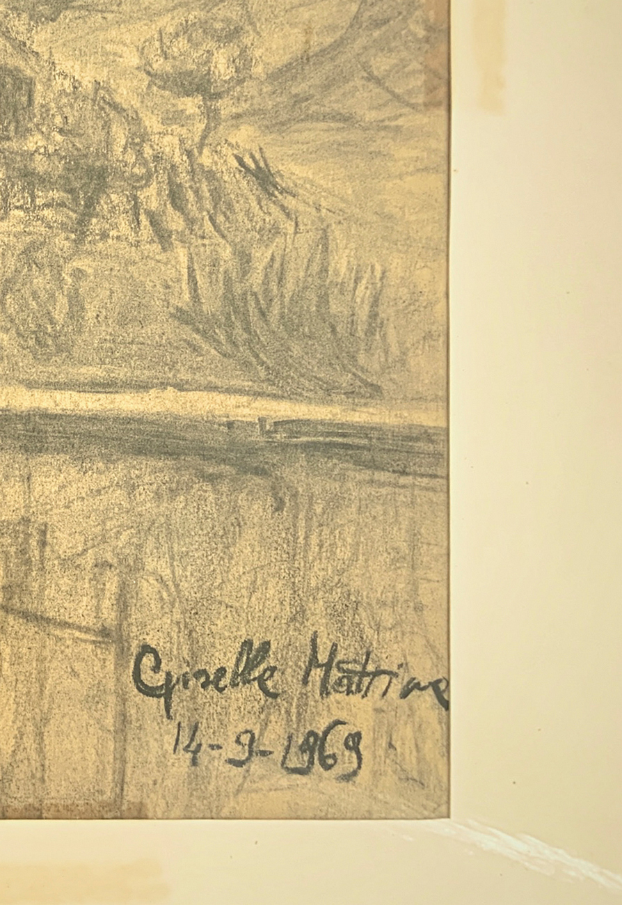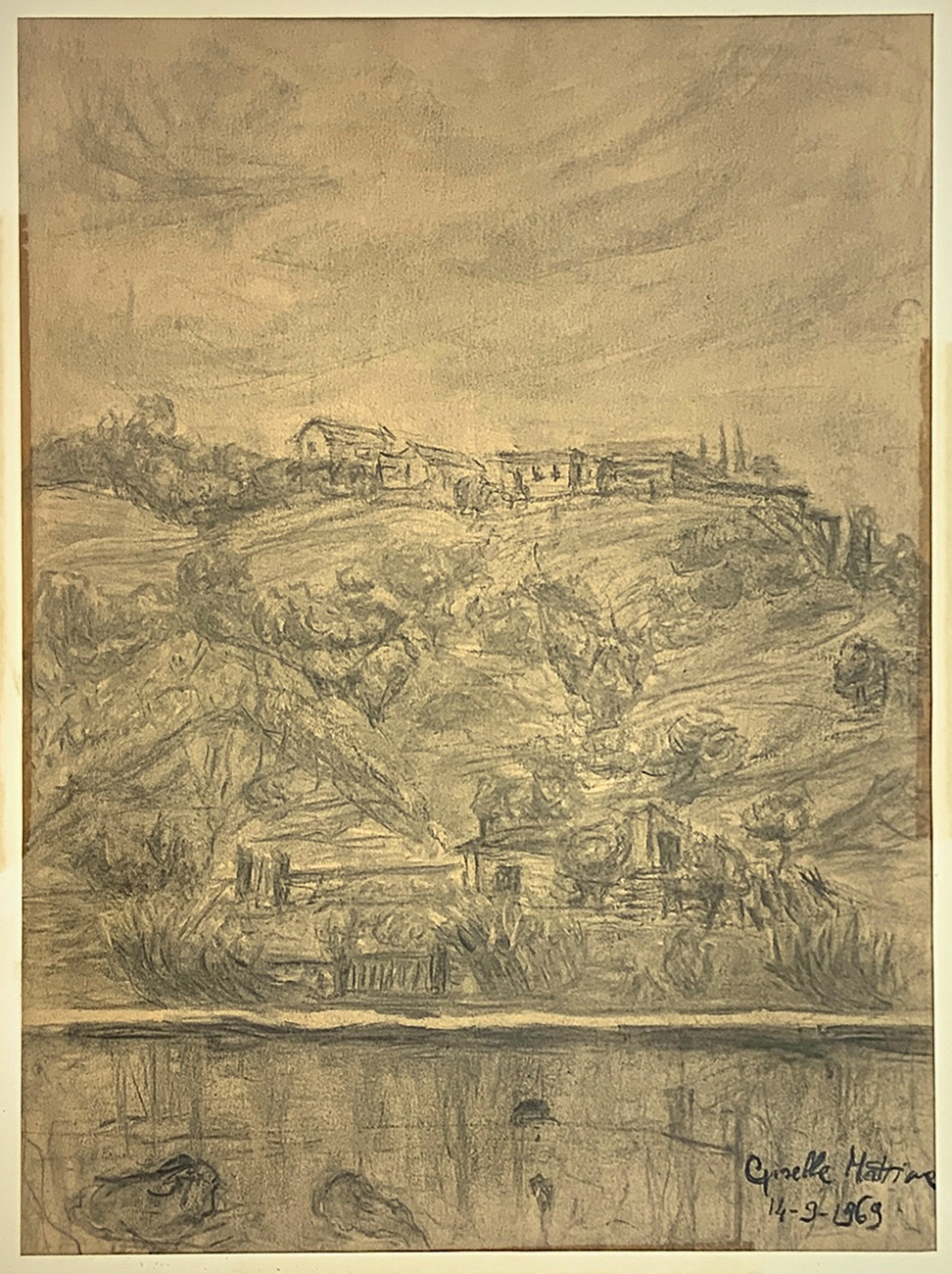 Lotto 295 | Disegno a carboncino su cartone raffigurante case di campagna, firmato in basso a destra Gisella Mattina e datato 1969.