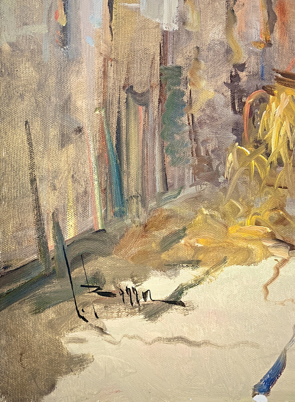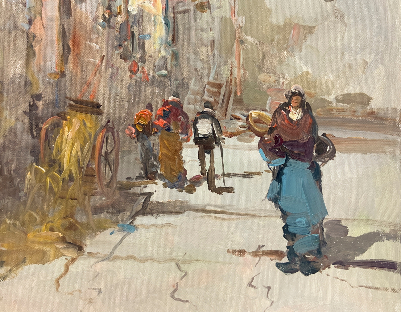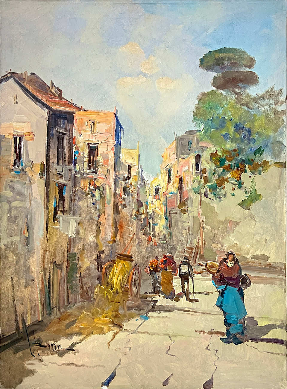 Olio su tela raffigurante strade di paese con personaggi , firmato in basso a sinistra Poma. Cm 70x50 . Quadro sprovvist