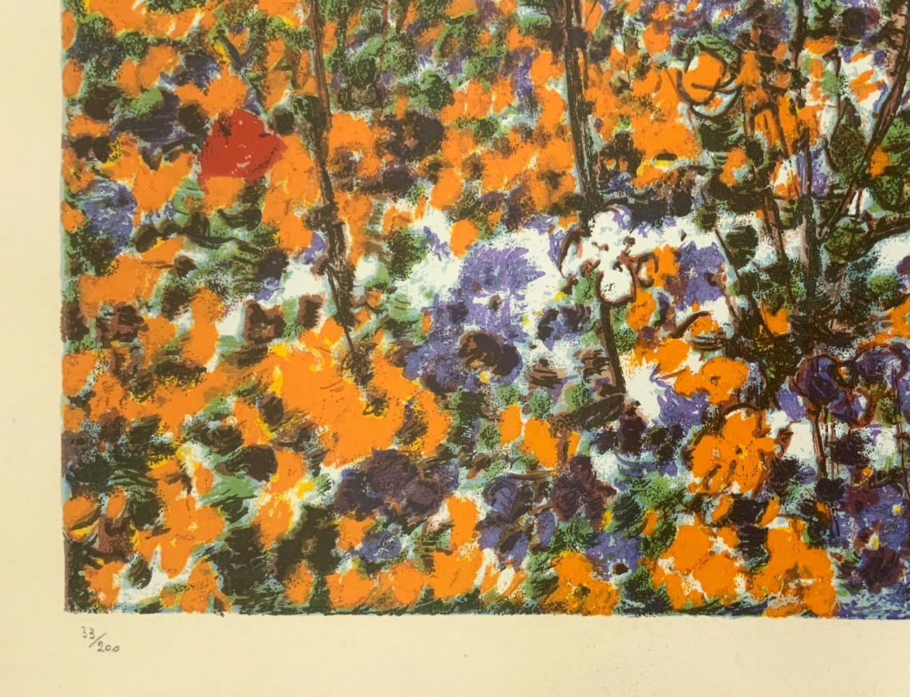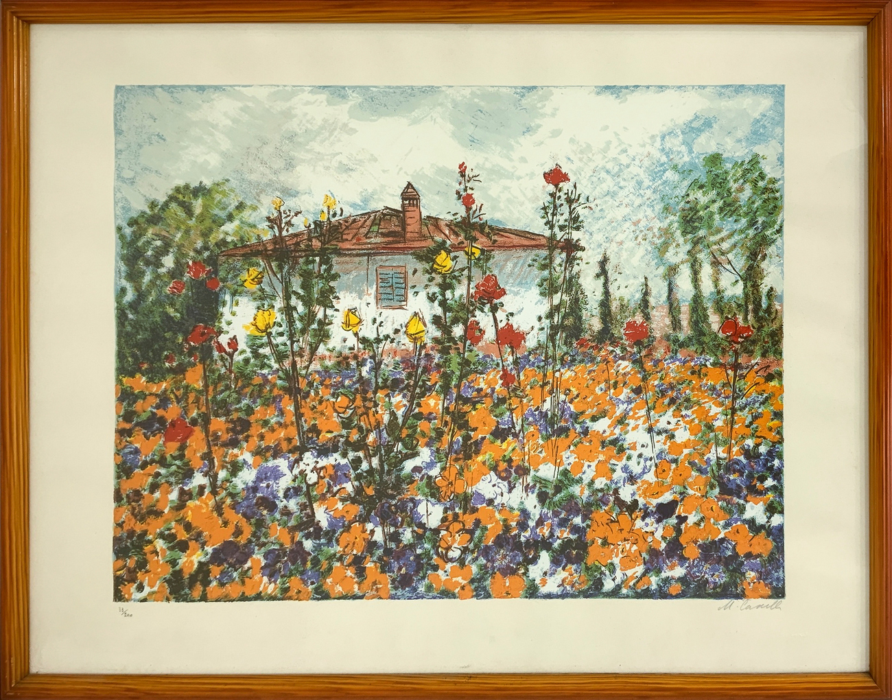 Litografia raffigurante casa in campo di fiori, 33/200. Firmata in basso a destra M. Cascella. In cornice cm 64x84