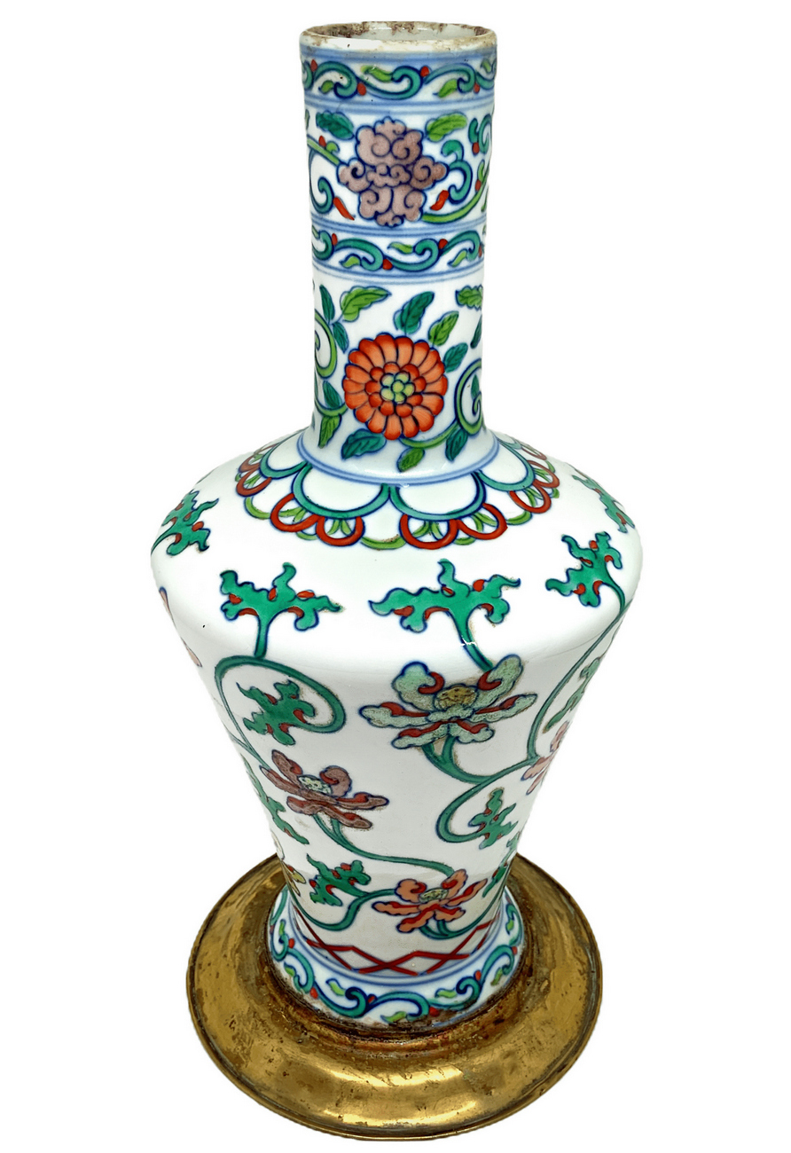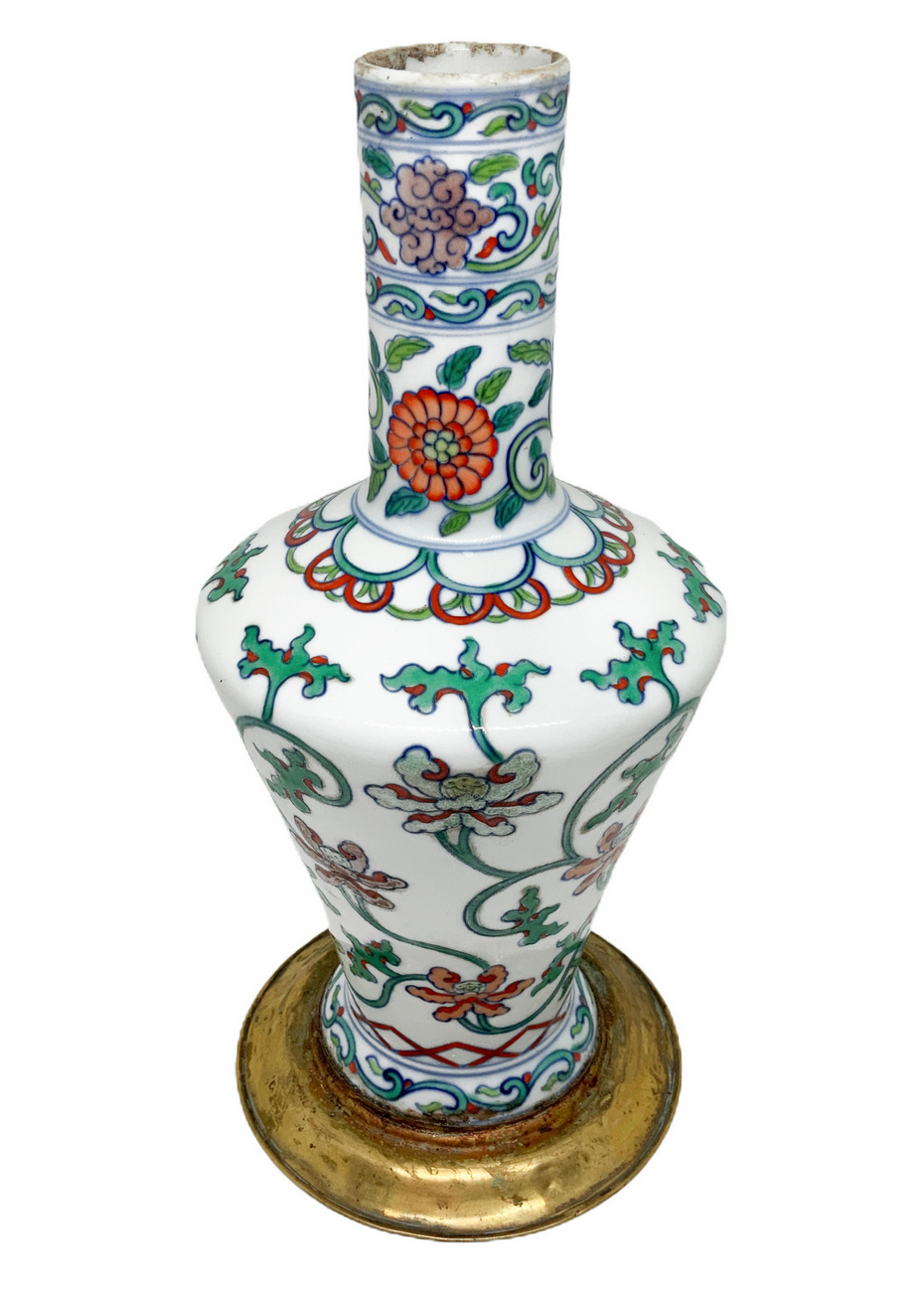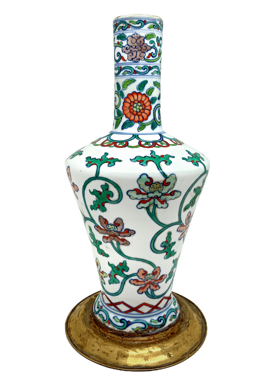 Vaso in porcellana per bile, Cina, periodo del regno dell'imperatore Yongzheng della dinastia Qing (1723 - 1735). Porcellana cinese sagomata con una base stretta, contornata da rame e collo alto cilindrico con apertura piatta. Ornamenti armoniosamente dipinti a mano nel colore di sottosmalto bianco pallido che contrasta con il colore Doucai. H 26,5