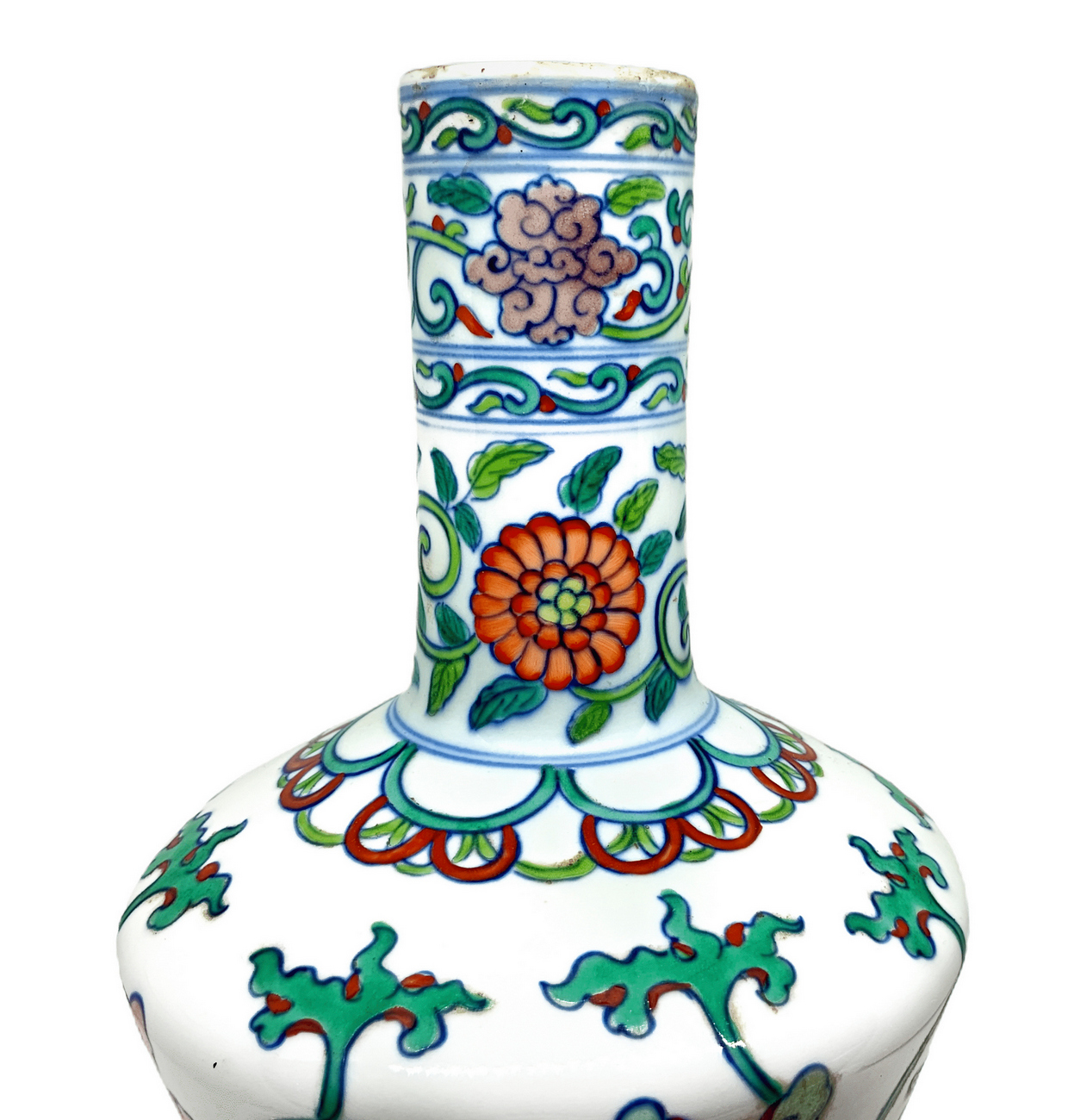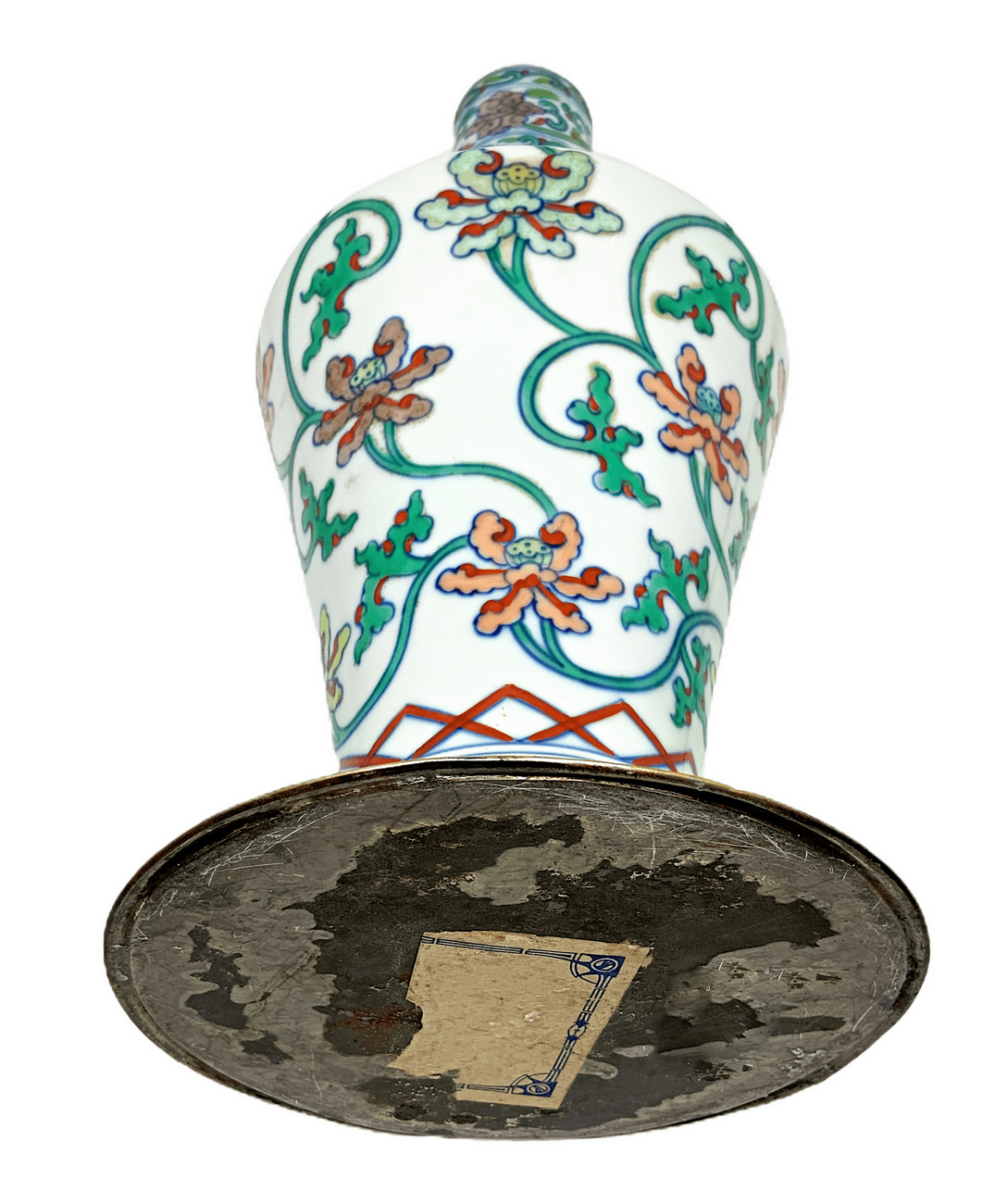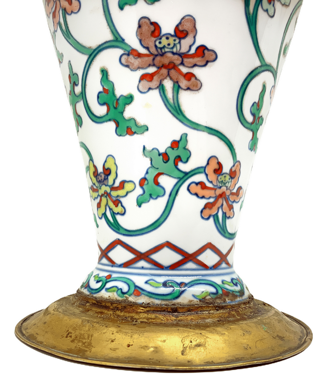 Vaso in porcellana per bile, Cina, periodo del regno dell'imperatore Yongzheng della dinastia Qing (1723 - 1735). Porcellana cinese sagomata con una base stretta, contornata da rame e collo alto cilindrico con apertura piatta. Ornamenti armoniosamente dipinti a mano nel colore di sottosmalto bianco pallido che contrasta con il colore Doucai. H 26,5