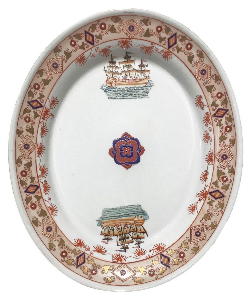 Zuppiera in porcellana cinese con piatto da portata, decorazione di paesaggi entro riserve a medaglione sia sul fronte c