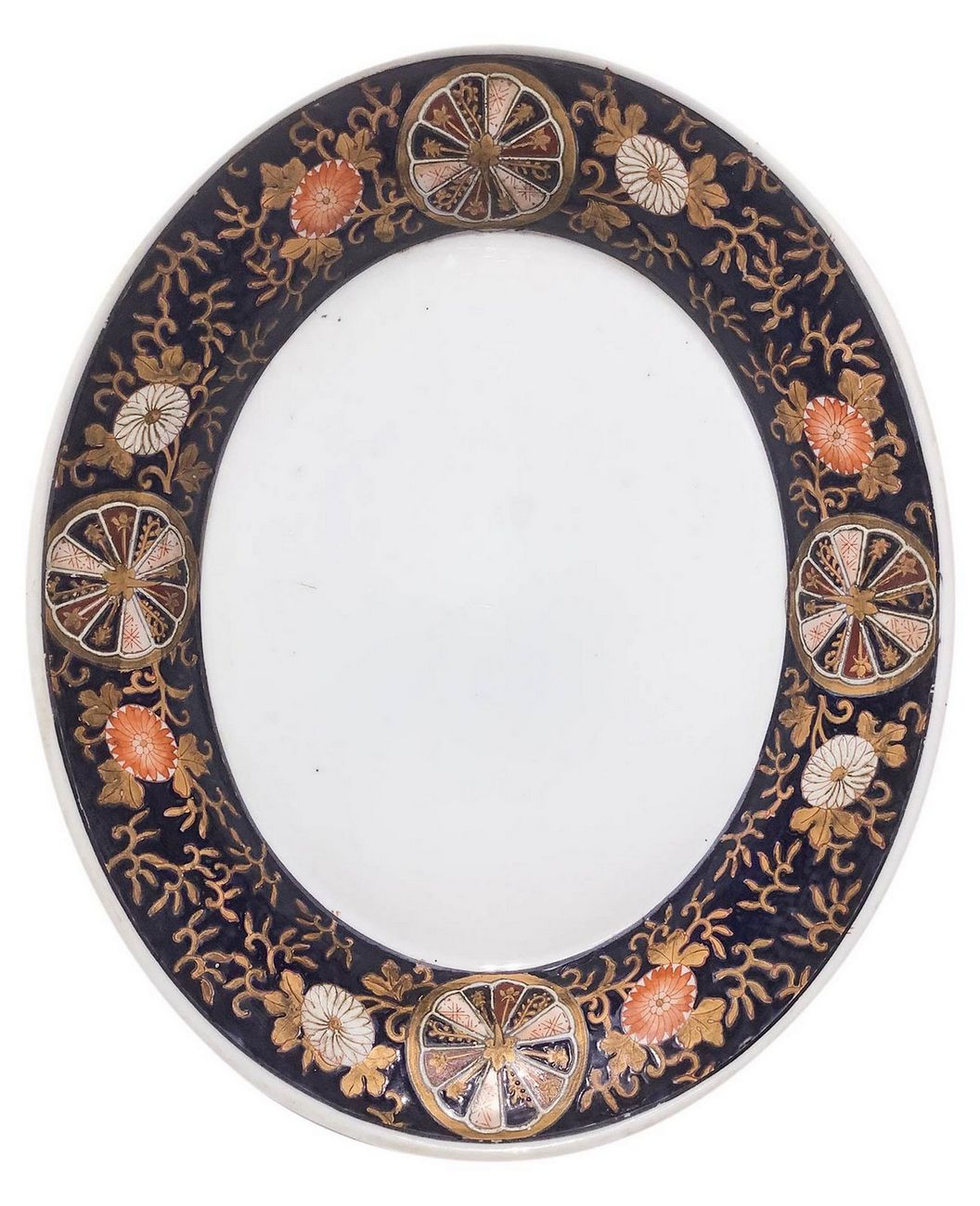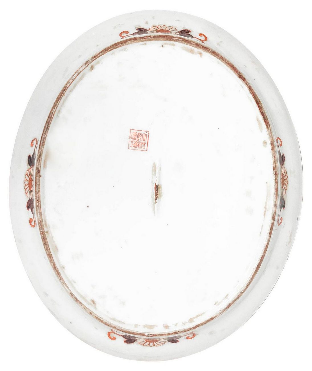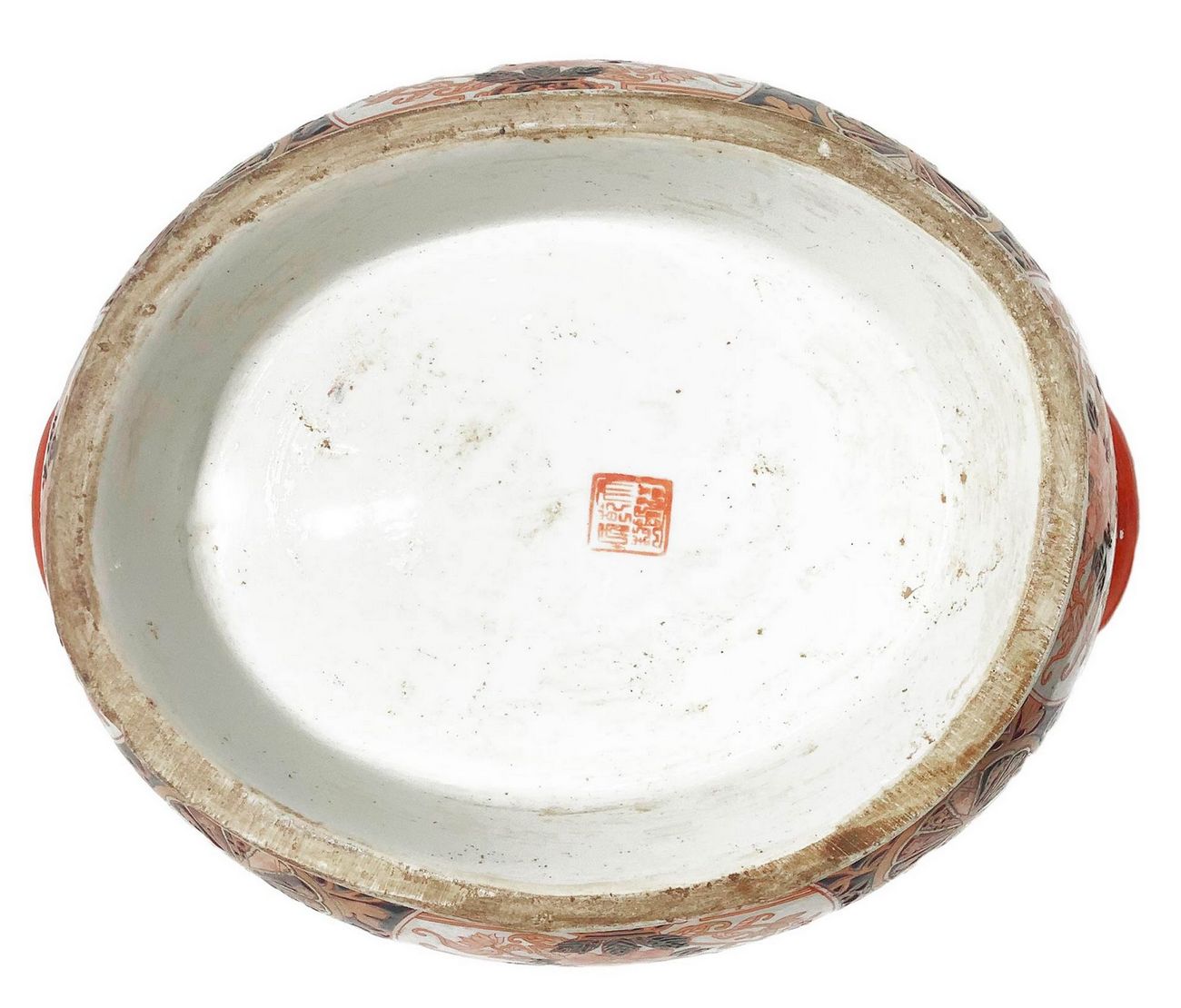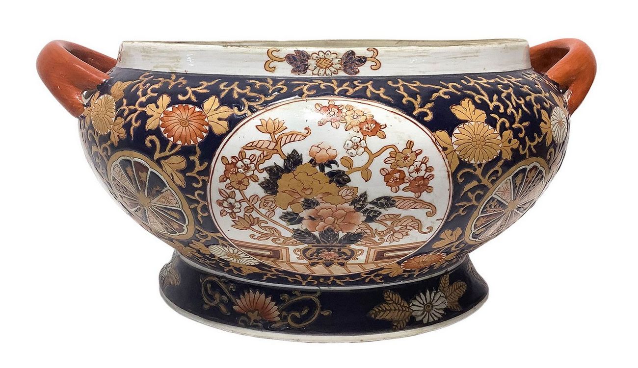 Zuppiera in porcellana cinese con piatto di portata fondo nero decorazione in colore arancio. H cm 25. Larghezza cm 35.