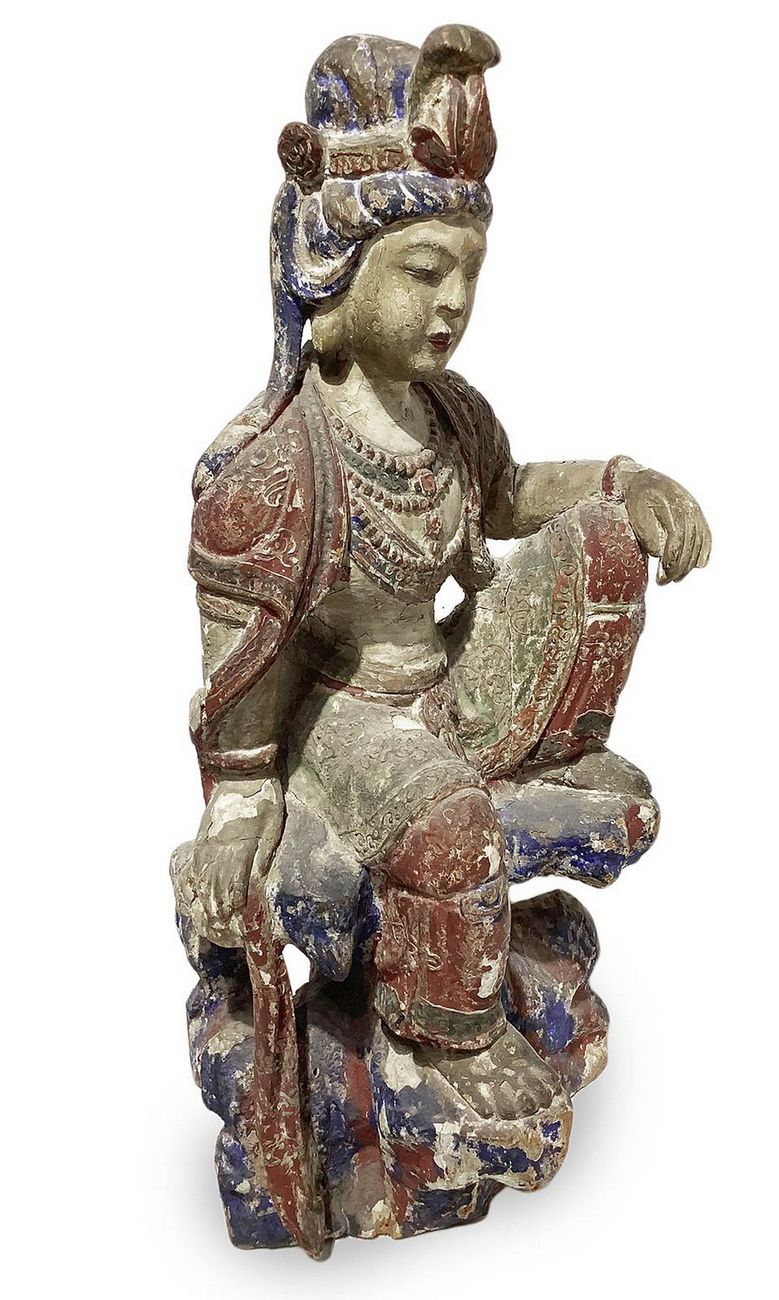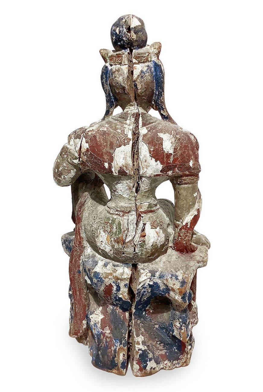 Scultura in legno policromo raffigurante divinità orientale seduta, XIX secolo. H cm 70. Base cm 30.