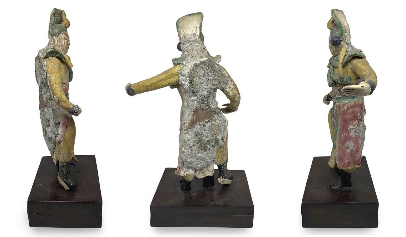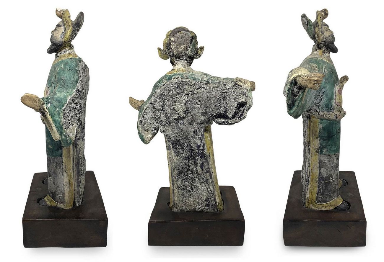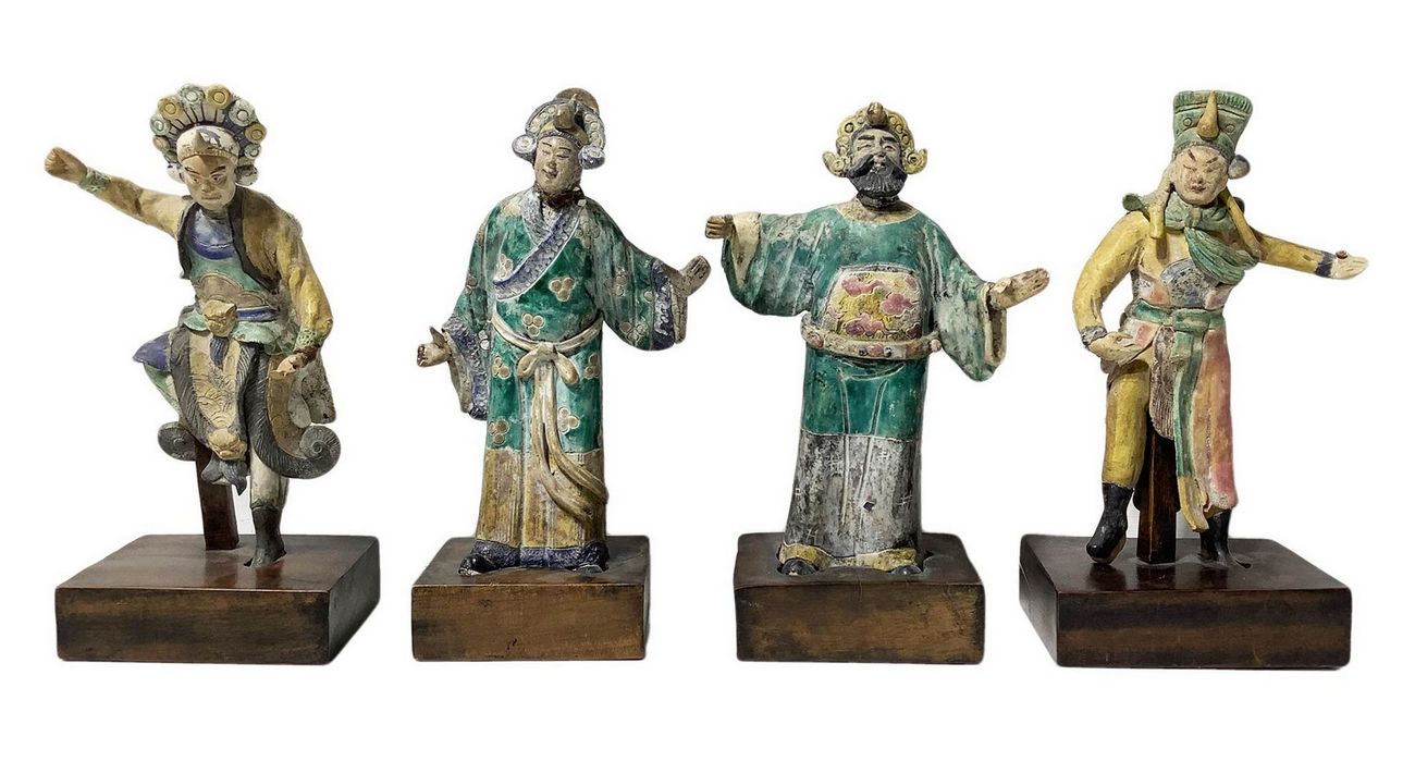 Lotto 313 | Gruppo di quattro antiche statuette raffiguranti personaggi cinesi in terracotta. Base in legno cm 4. H totale cm 30. Su