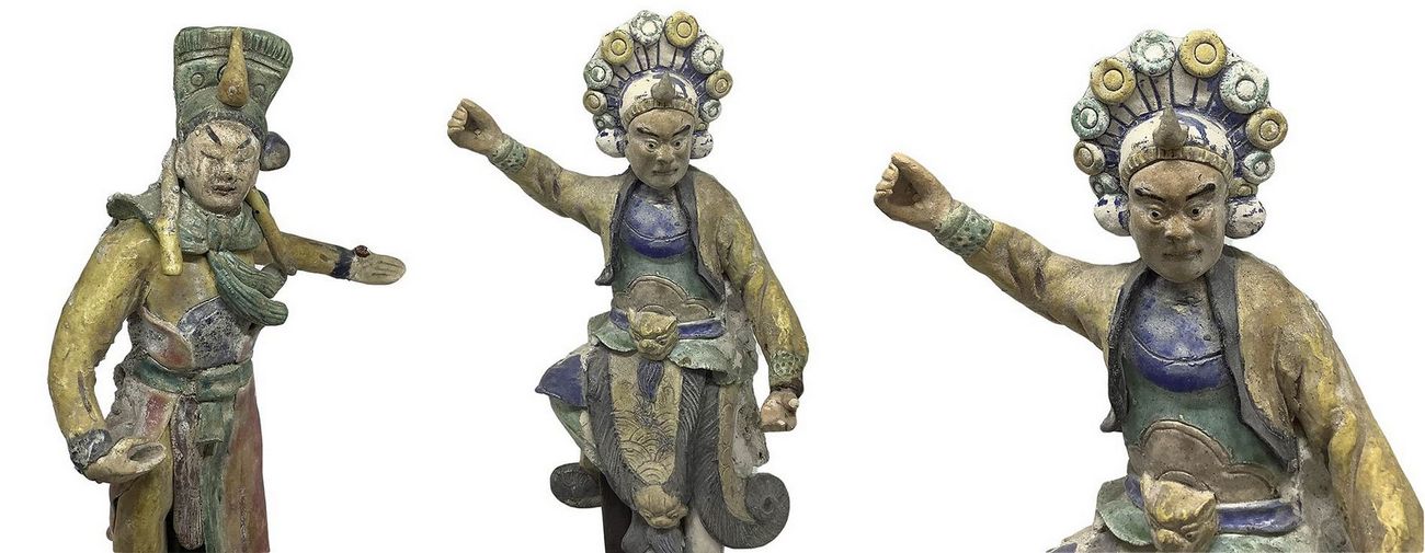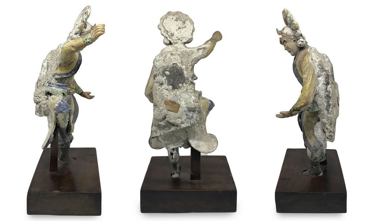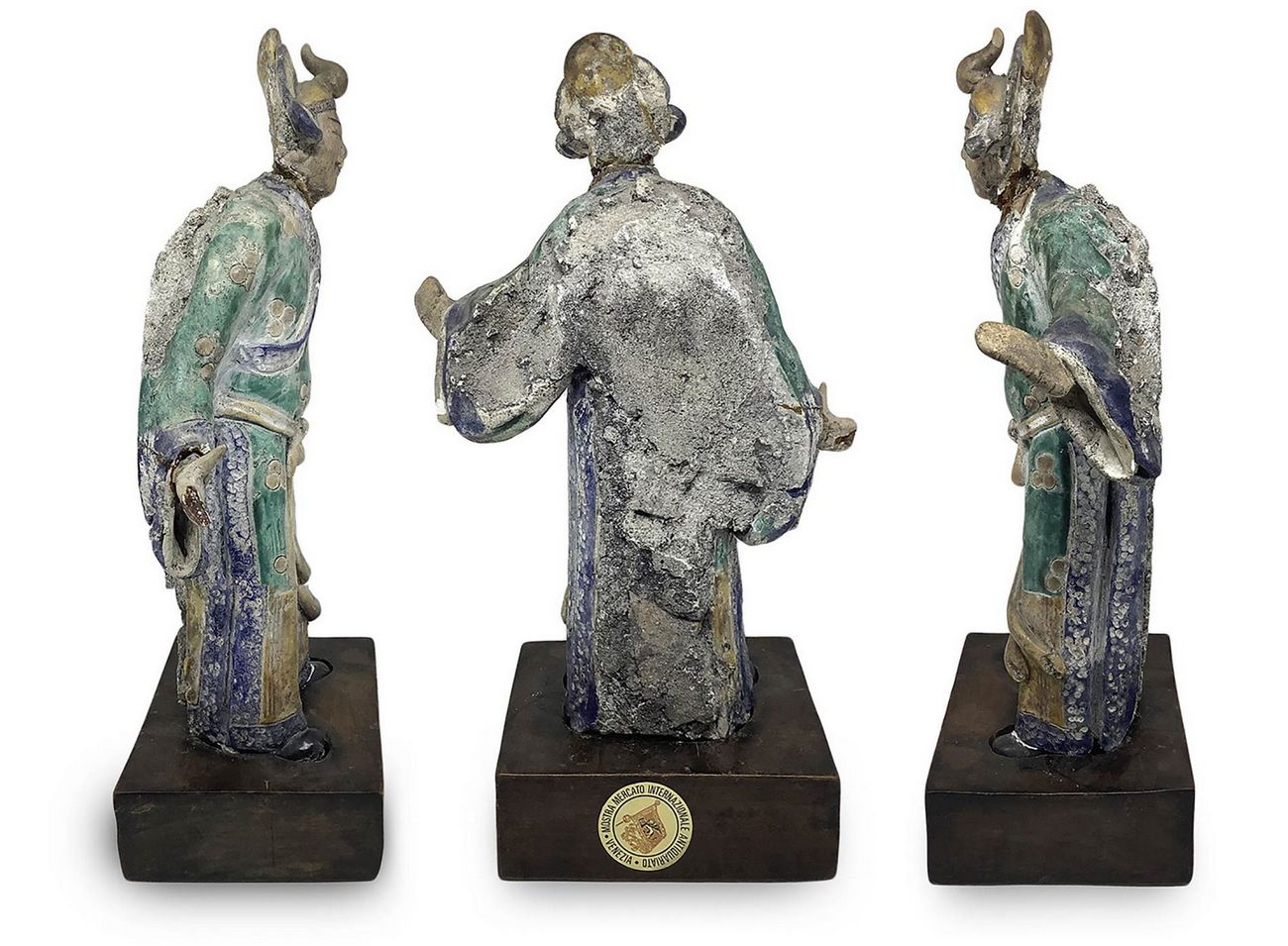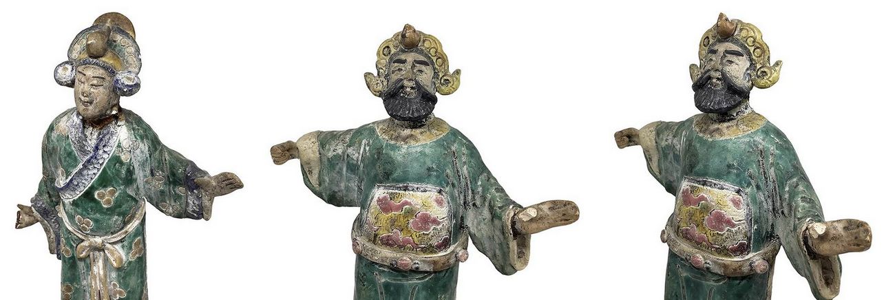 Lotto 313 | Gruppo di quattro antiche statuette raffiguranti personaggi cinesi in terracotta. Base in legno cm 4. H totale cm 30. Su