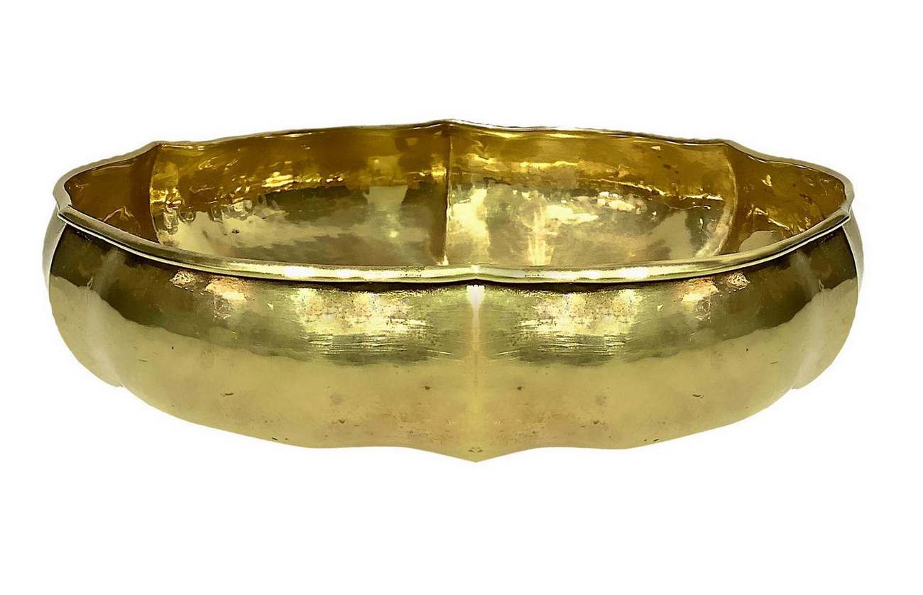Gruppo composto da n. 6 piatti in ottone e n. 2 ciotole, Job Art, fatto a mano. Diametro piatti cm 25. Diametro ciotola grande cm 17, diametro ciotola piccola cm 12,3. Presenti macchie
