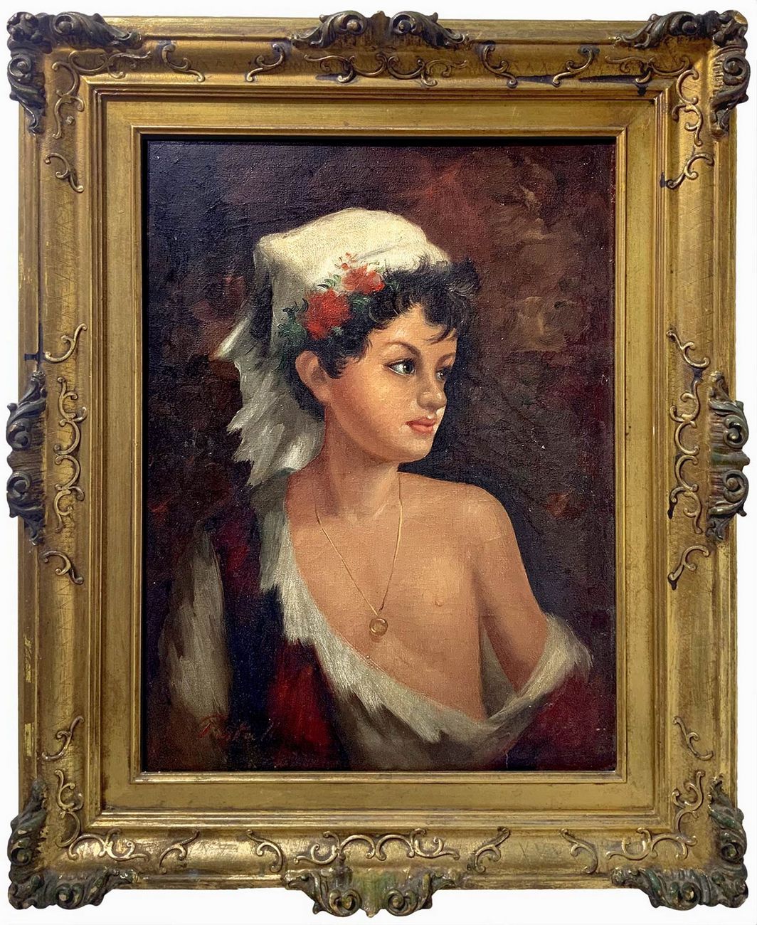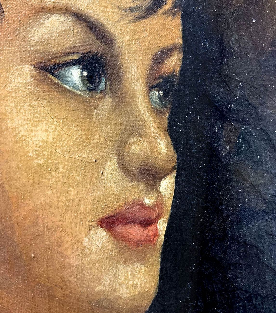 Dipinto ad olio su tela raffigurante ritratto di fanciulla. Pittore italiano del XX secolo. Cm 68x48,5