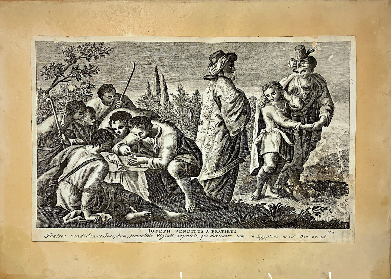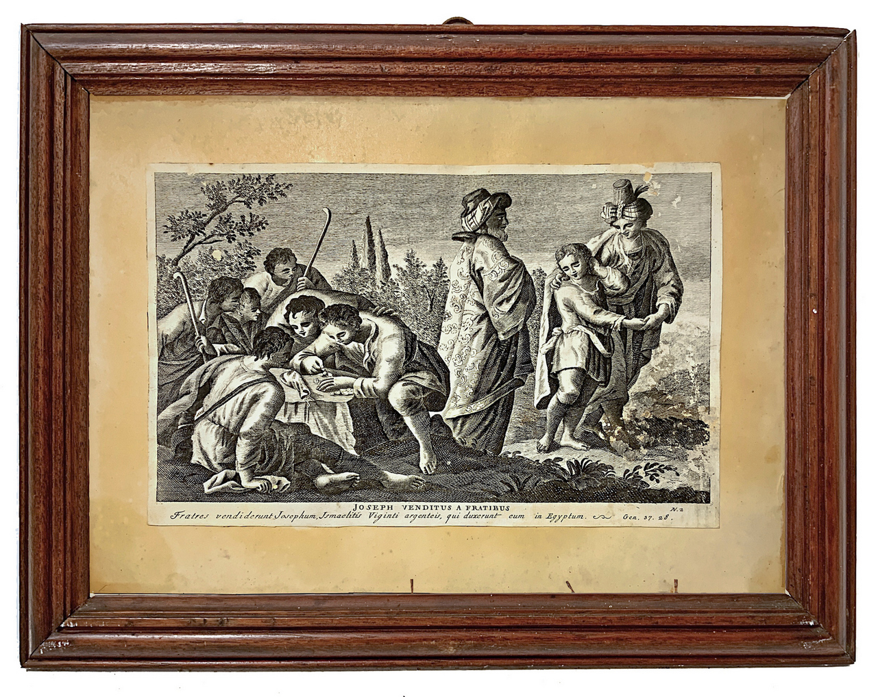 Incisione ad acquaforte di Joannes Giovanni Volpato (1733-1803) raffigurante episodi della vita di Giuseppe. Mm 200x300, in cornice di legno cm 35x43. Tracce e buchi di tarme