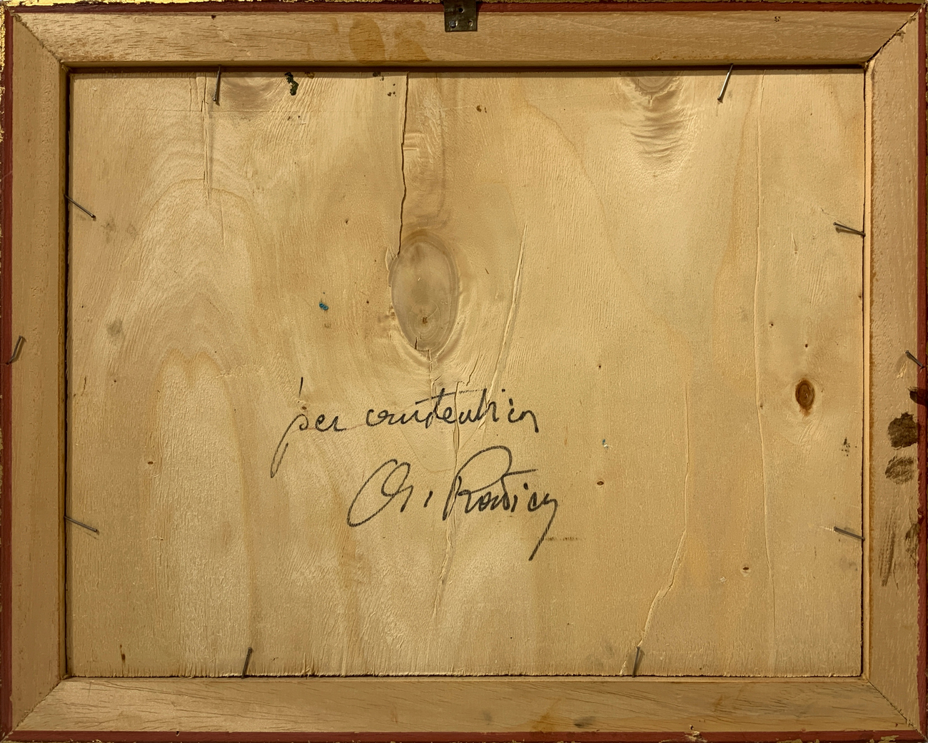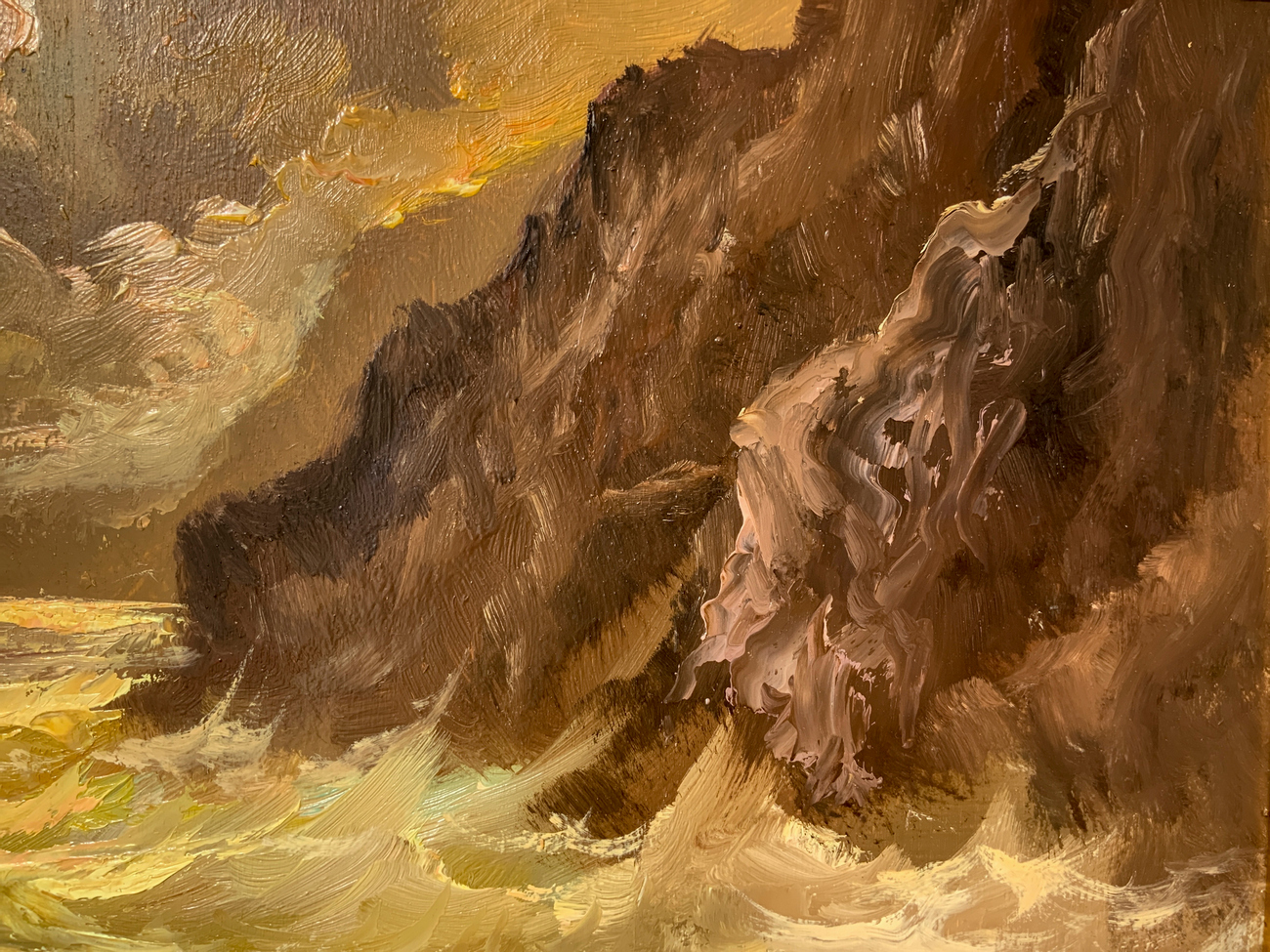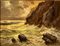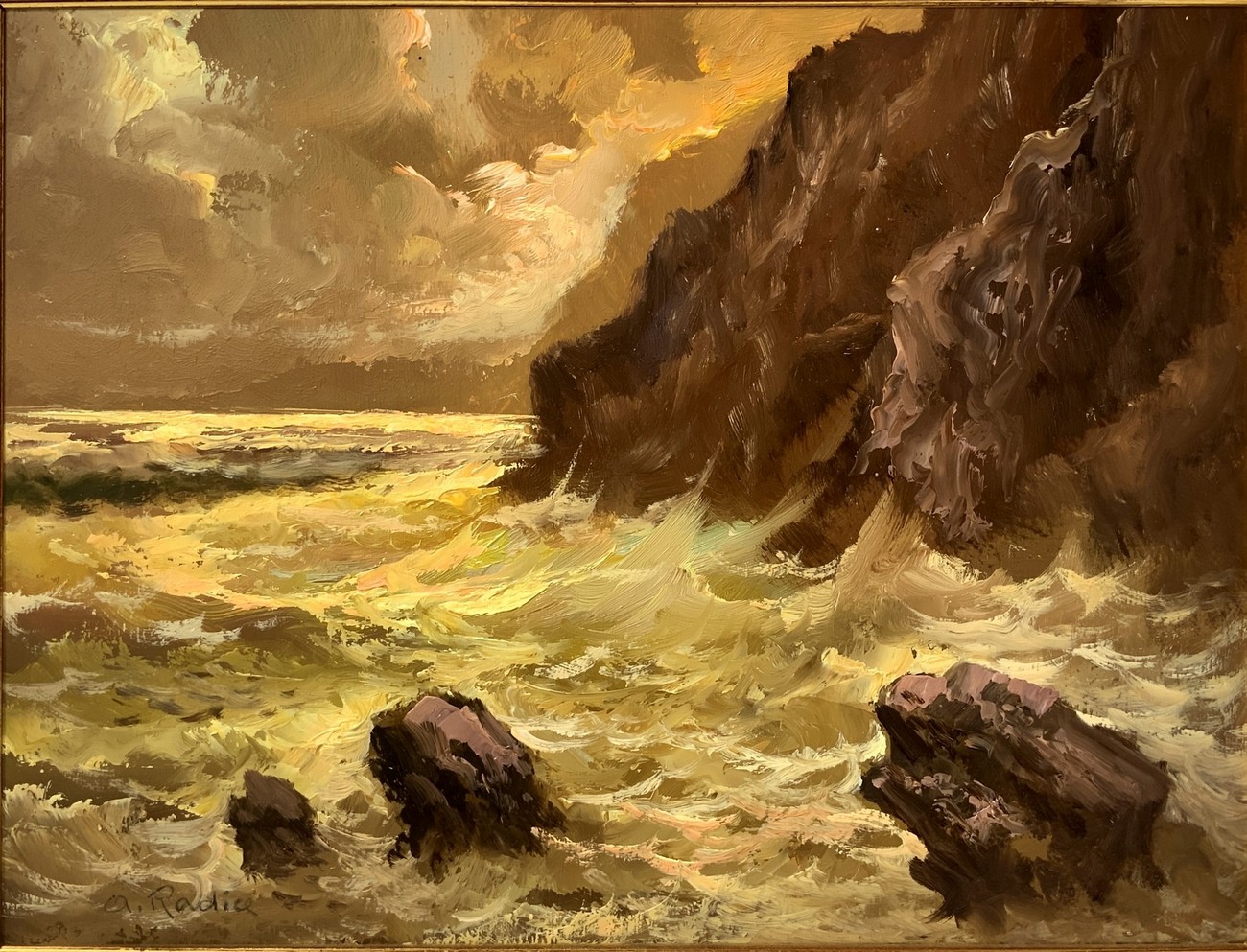 Dipinto ad olio su tavoletta raffigurante scogliera con mare agitato, firmato A. Radice. Cm 30x40