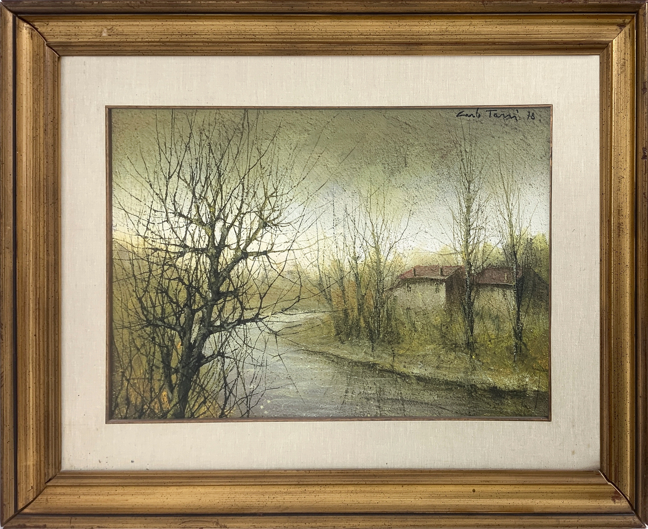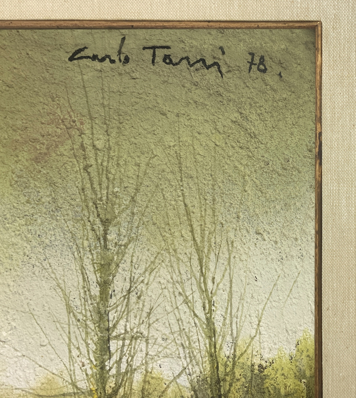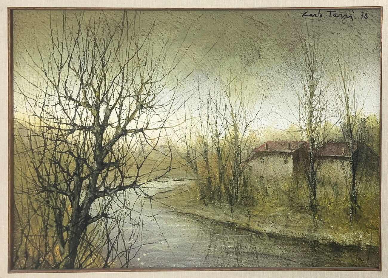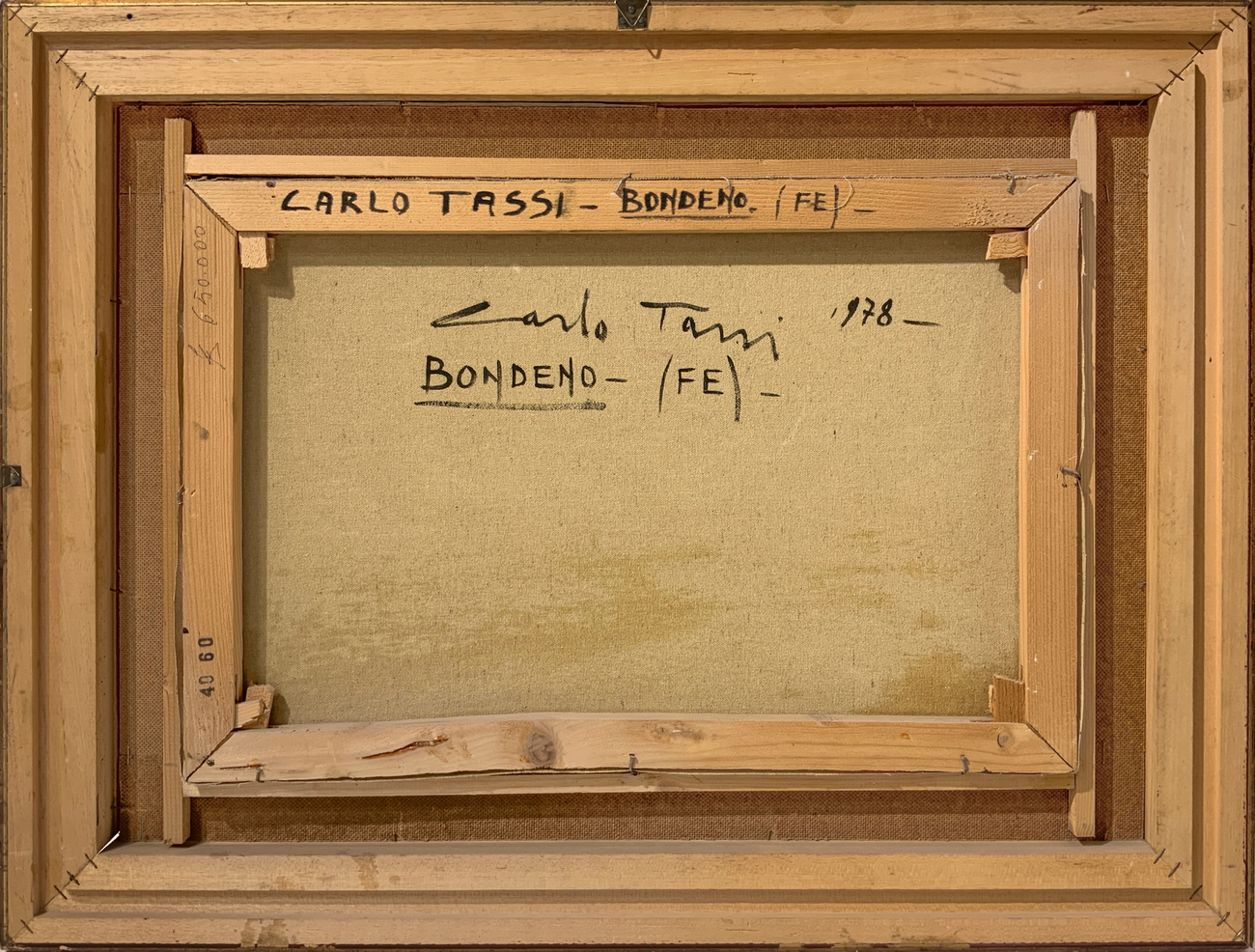 Dipinto ad olio su tela raffigurante “Bondeno”, firmato in alto a destra Carlo Tassi e datato ’78. Cm 40x60, in cornice 65x85
