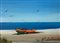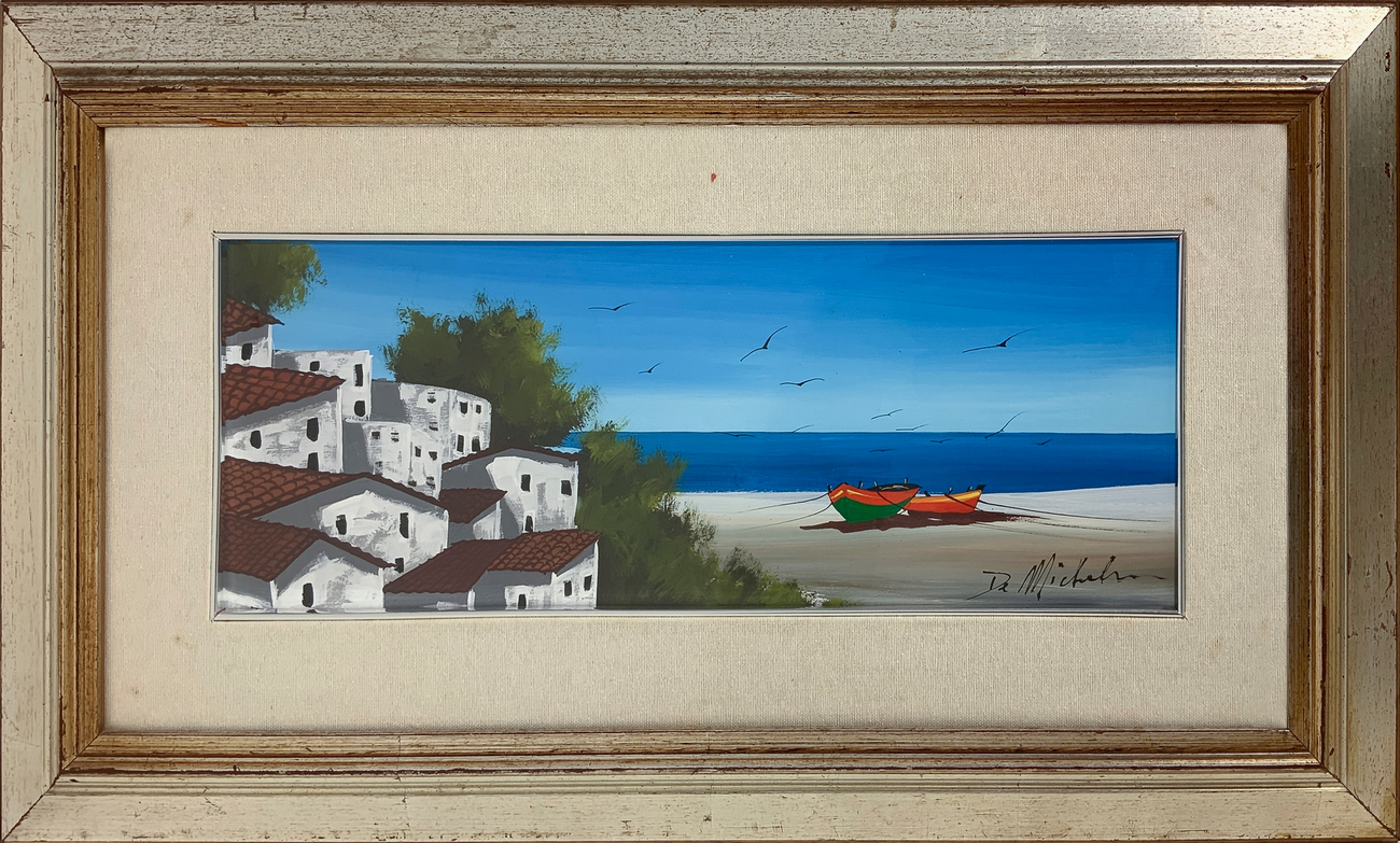 Dipinto ad olio su masonite raffigurante marina con barche e case. Firmato in basso a destra De Michelis. Cm 18x49, in cornice cm 41x72