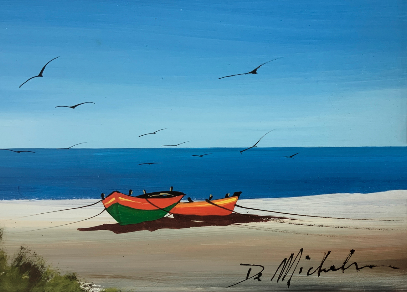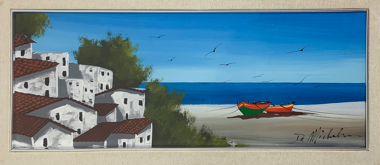 Dipinto ad olio su masonite raffigurante marina con barche e case. Firmato in basso a destra De Michelis. Cm 18x49, in c
