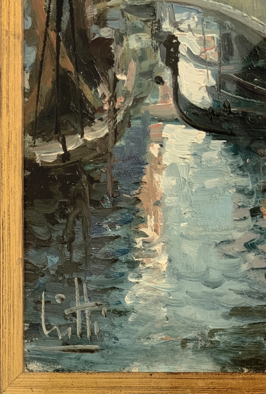 Dipinto ad olio su tela raffigurante canale di Venezia. Firmato in basso a sinistra Liatti.. Cm 60x30, in cornice cm 80x50