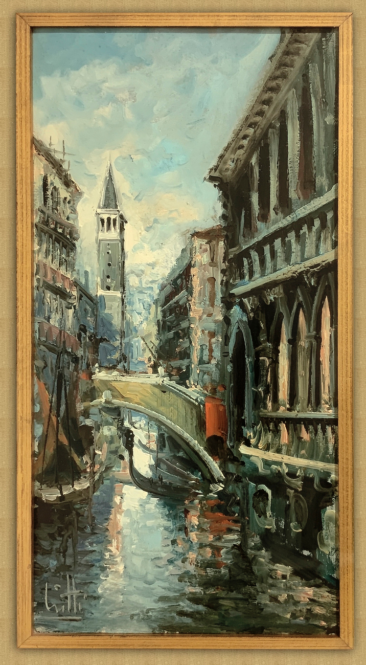 Dipinto ad olio su tela raffigurante canale di Venezia. Firmato in basso a sinistra Liatti.. Cm 60x30, in cornice cm 80x