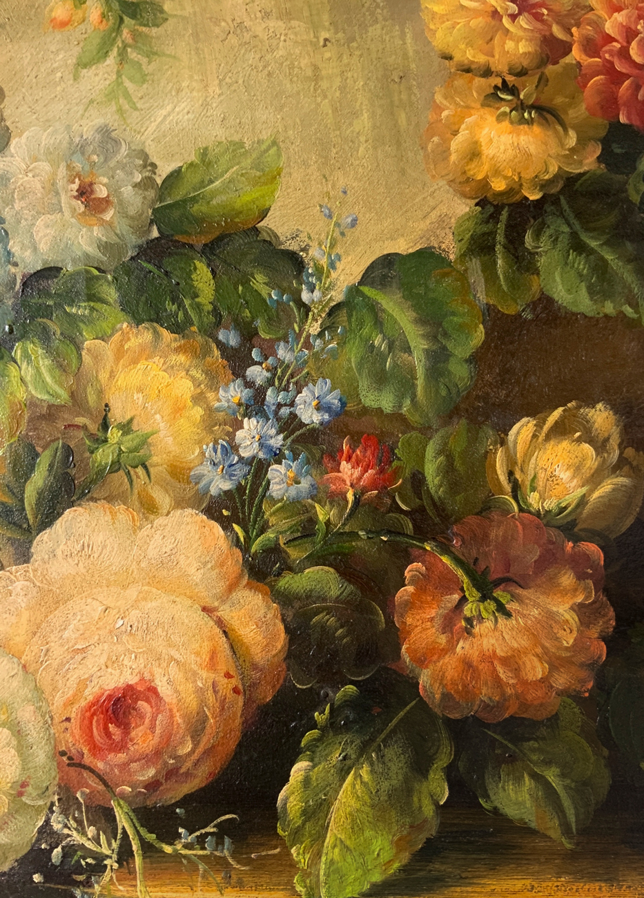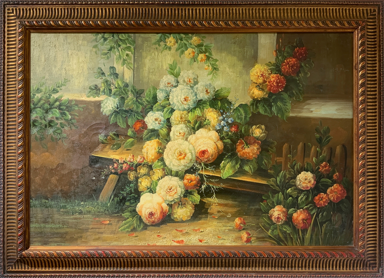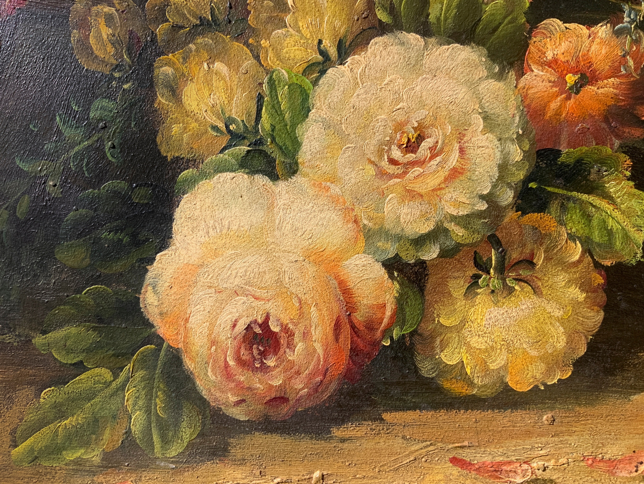 Dipinto ad olio su tela raffigurante natura morta di fiori. Inizi XX secolo. Cm 60x90, in cornice cm 75x105