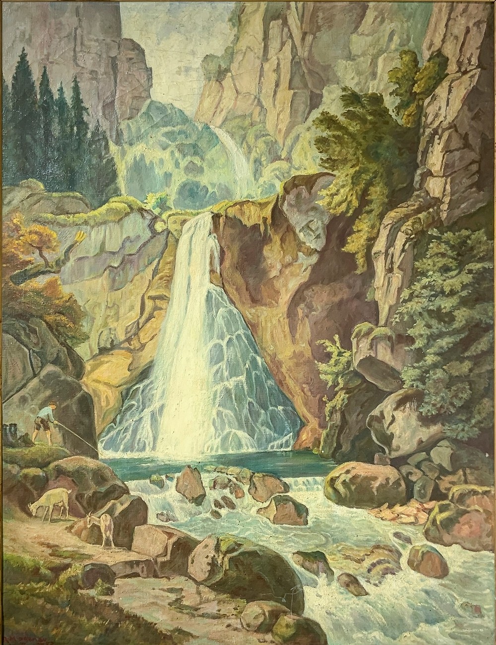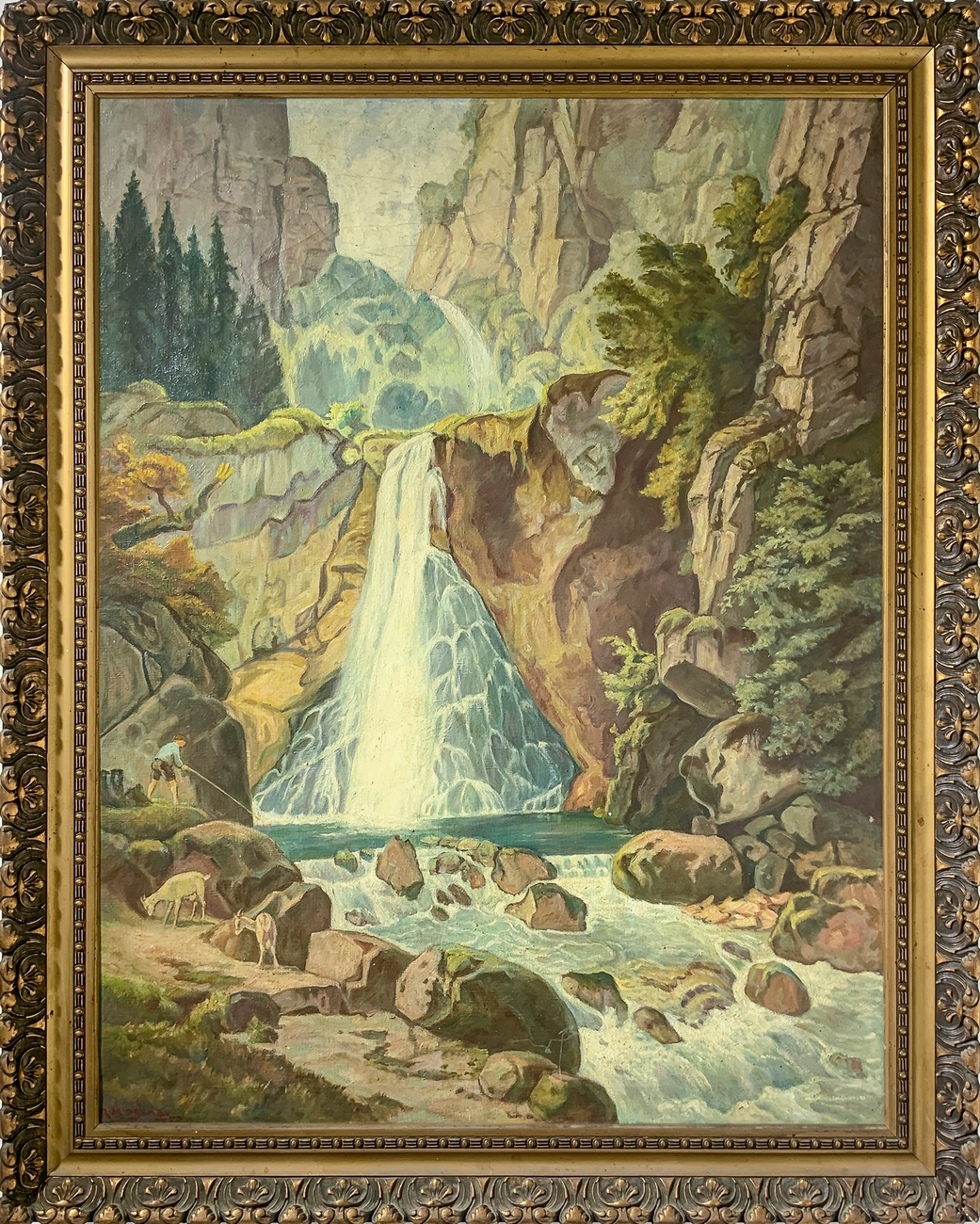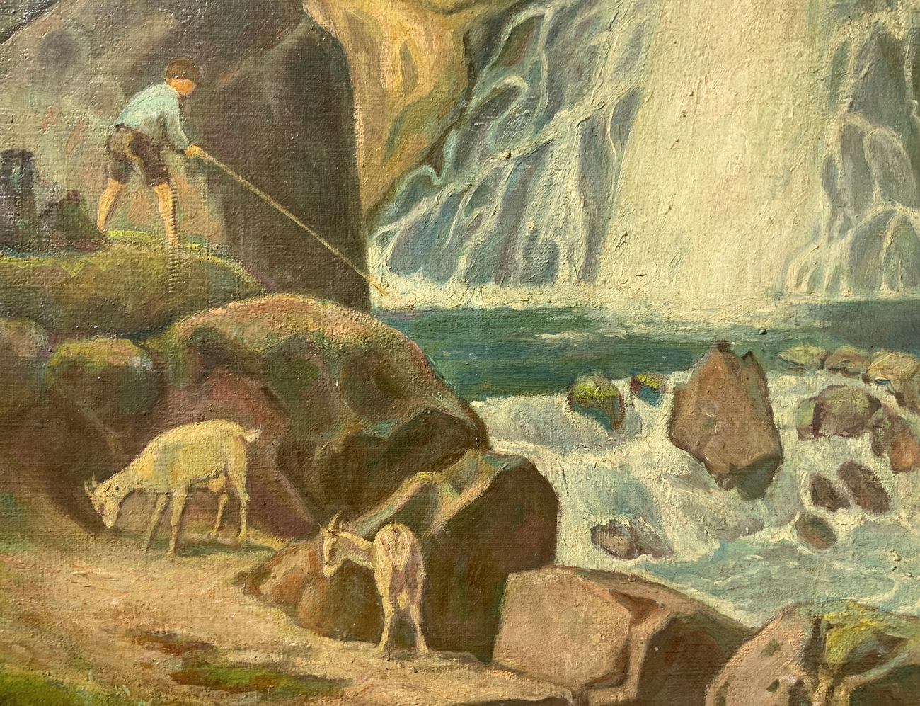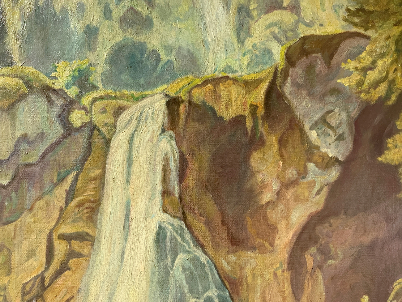 Dipinto ad olio su tela raffigurante fiume con cascata d'acqua, firmato in basso a sinistra R. Magena. Inizi XX secolo.