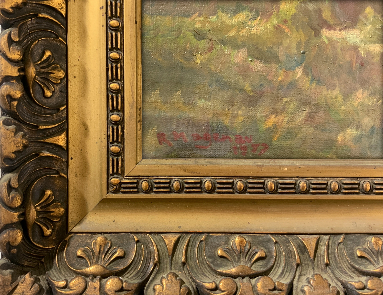 Dipinto ad olio su tela raffigurante fiume con cascata d'acqua, firmato in basso a sinistra R. Magena. Inizi XX secolo. Cm 70x80, in cornice cm 110x88