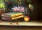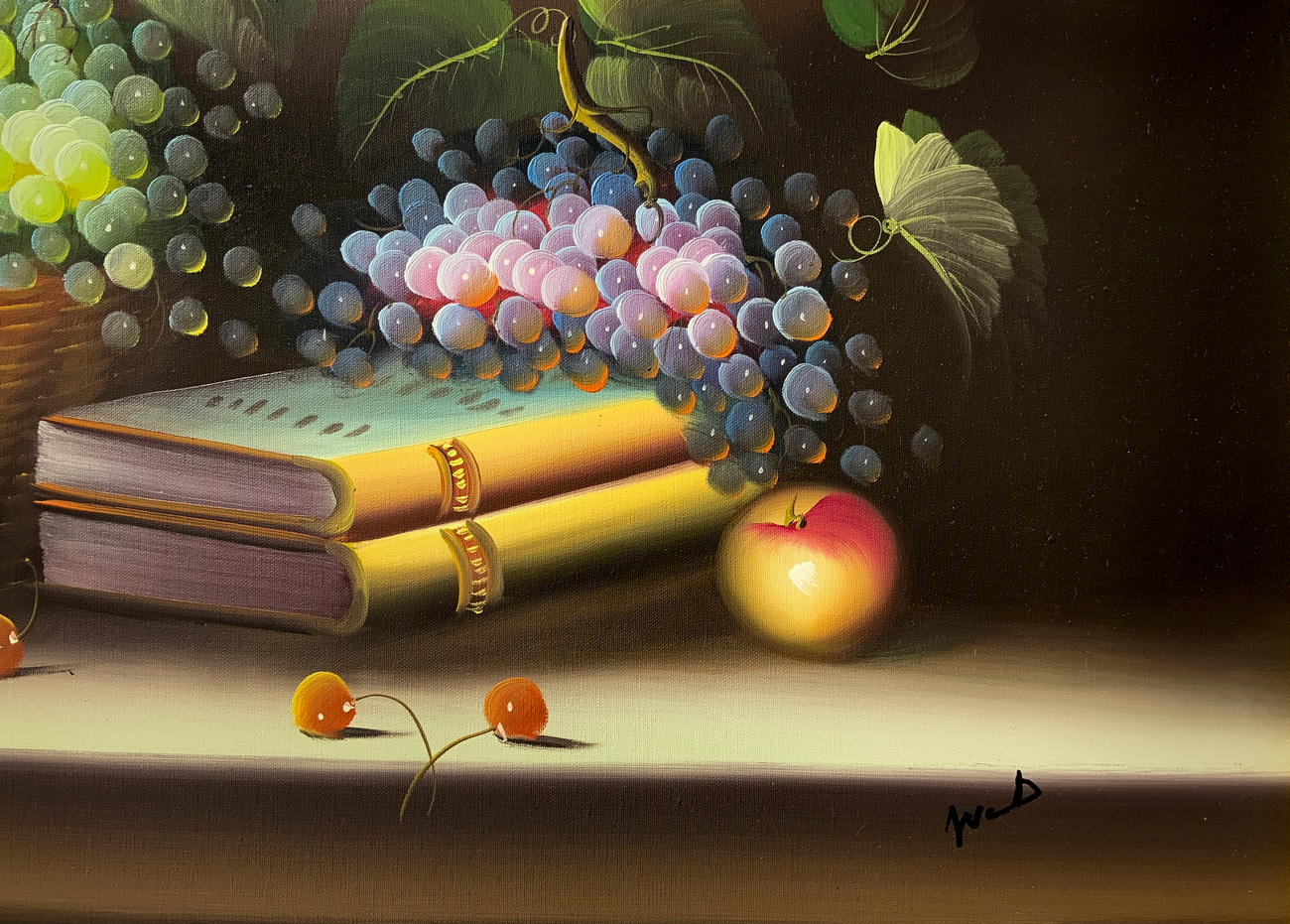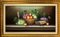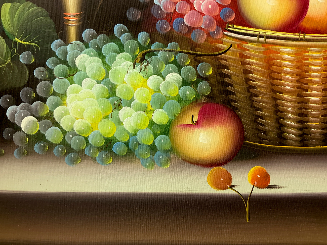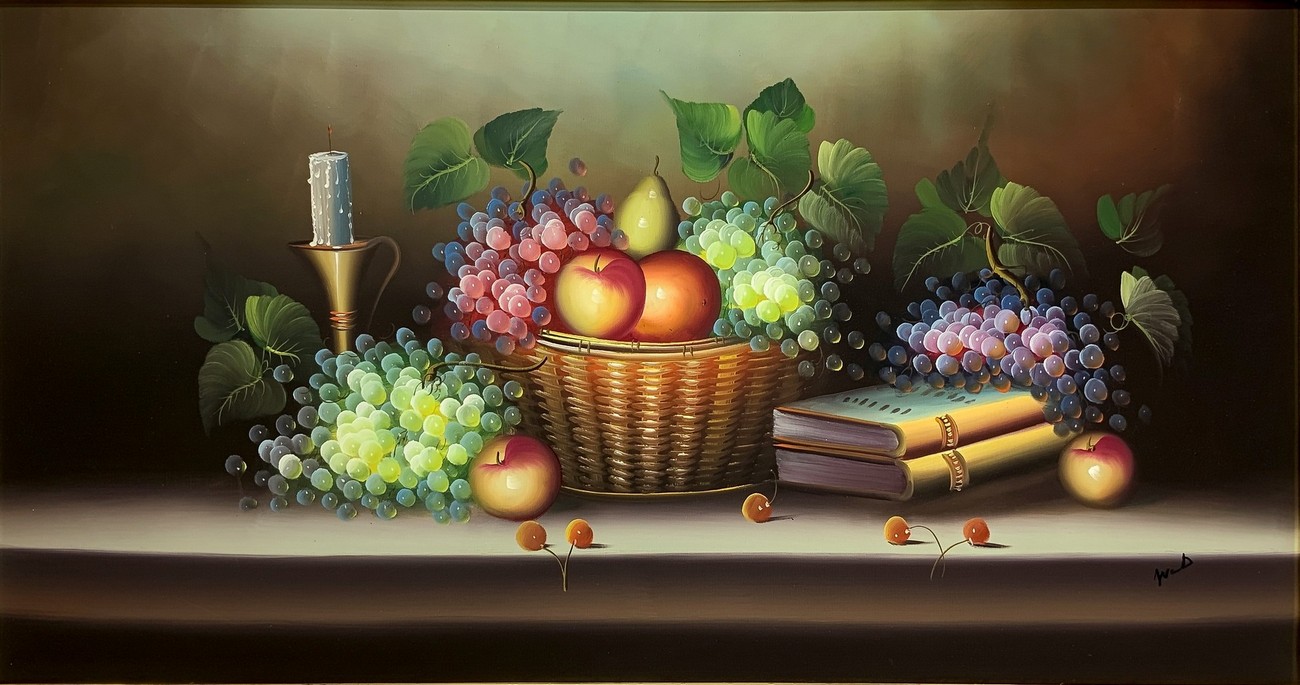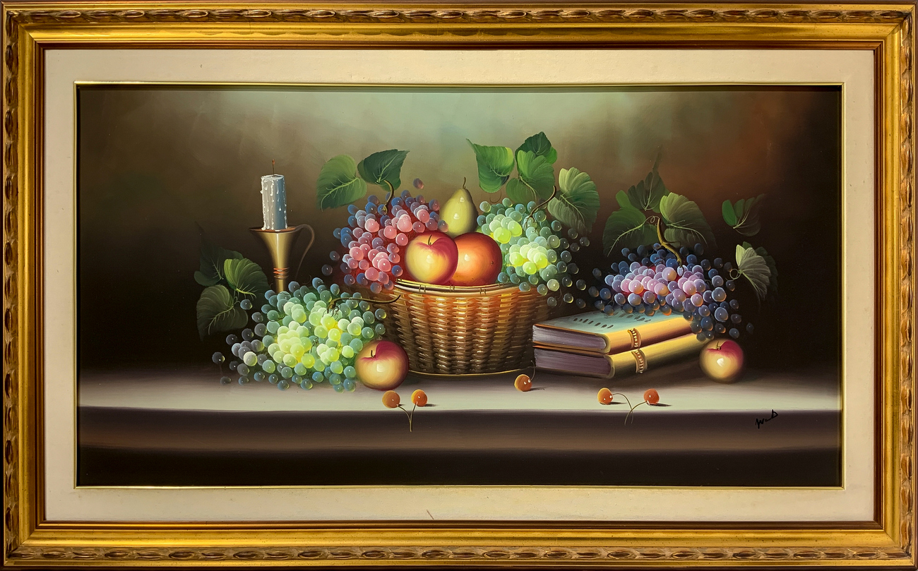 Dipinto ad olio su tela raffigurante natura morta con cesto di vimini. Cm 59x119, in cornice cm 85x145