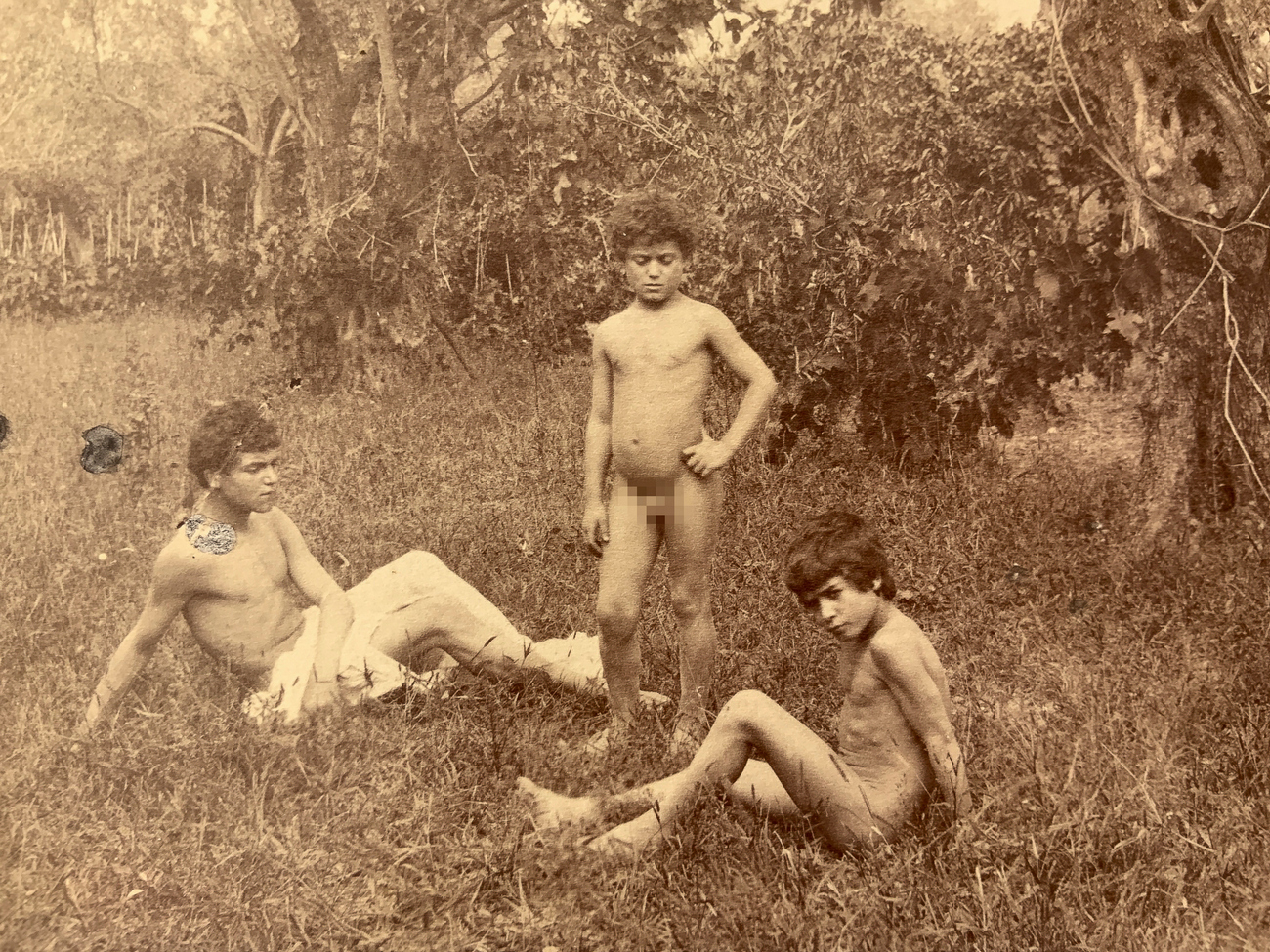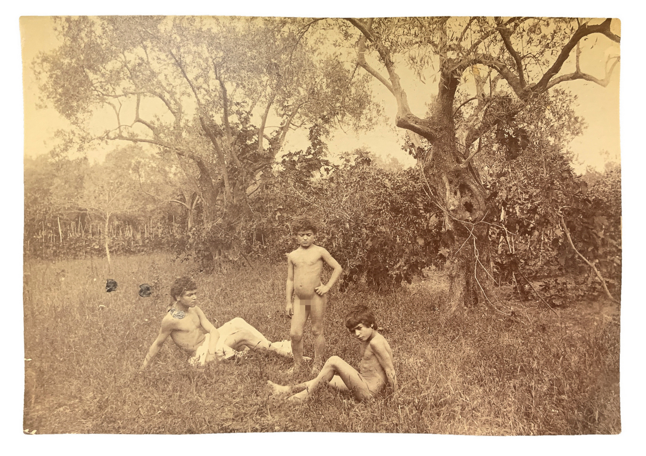 Wilhelm von Gloeden (1856-1931), foto al collodio raffigurante tre giovani in giardino con alberi di ulivo. Numerata 109