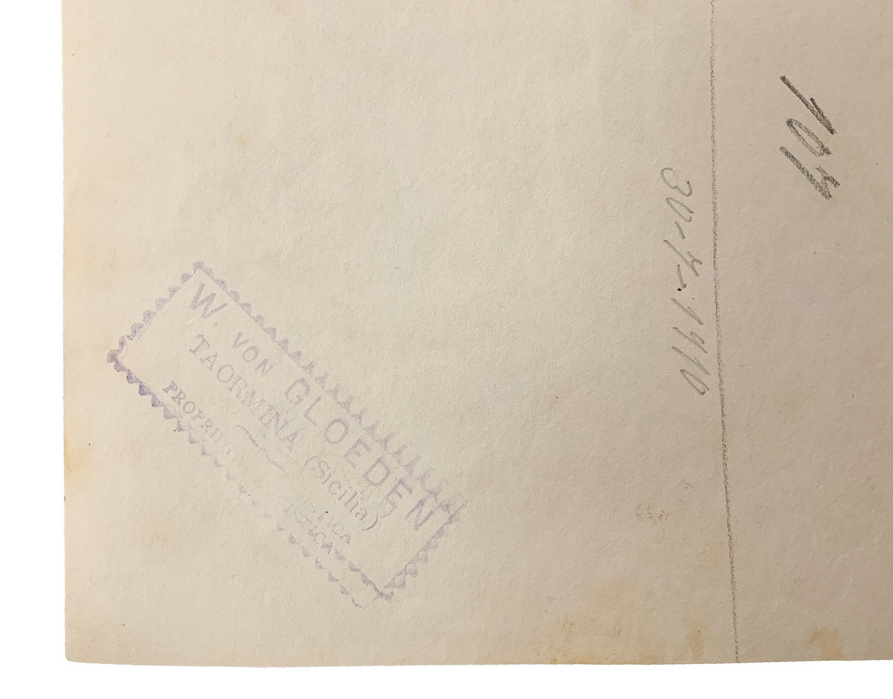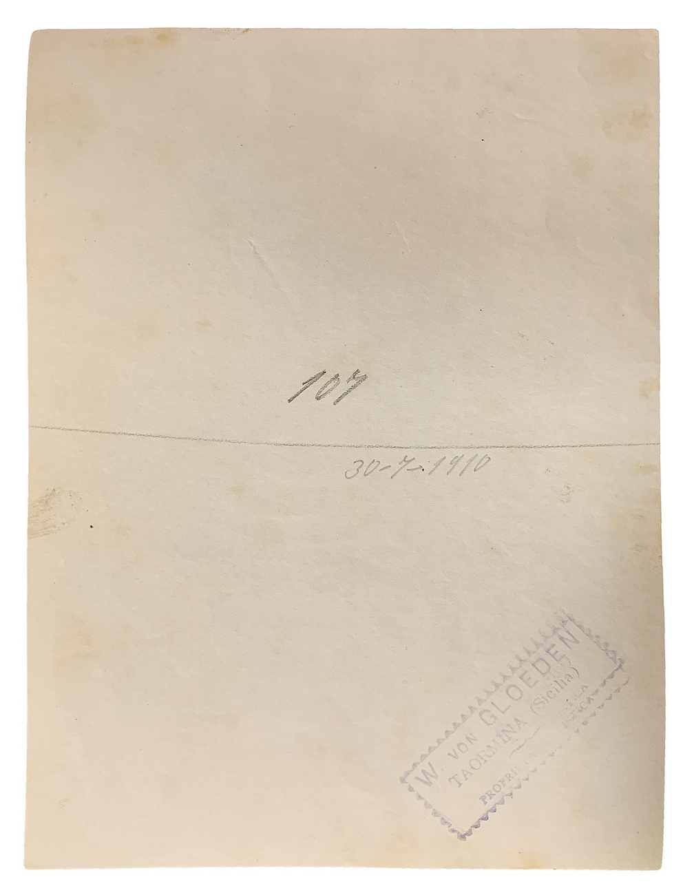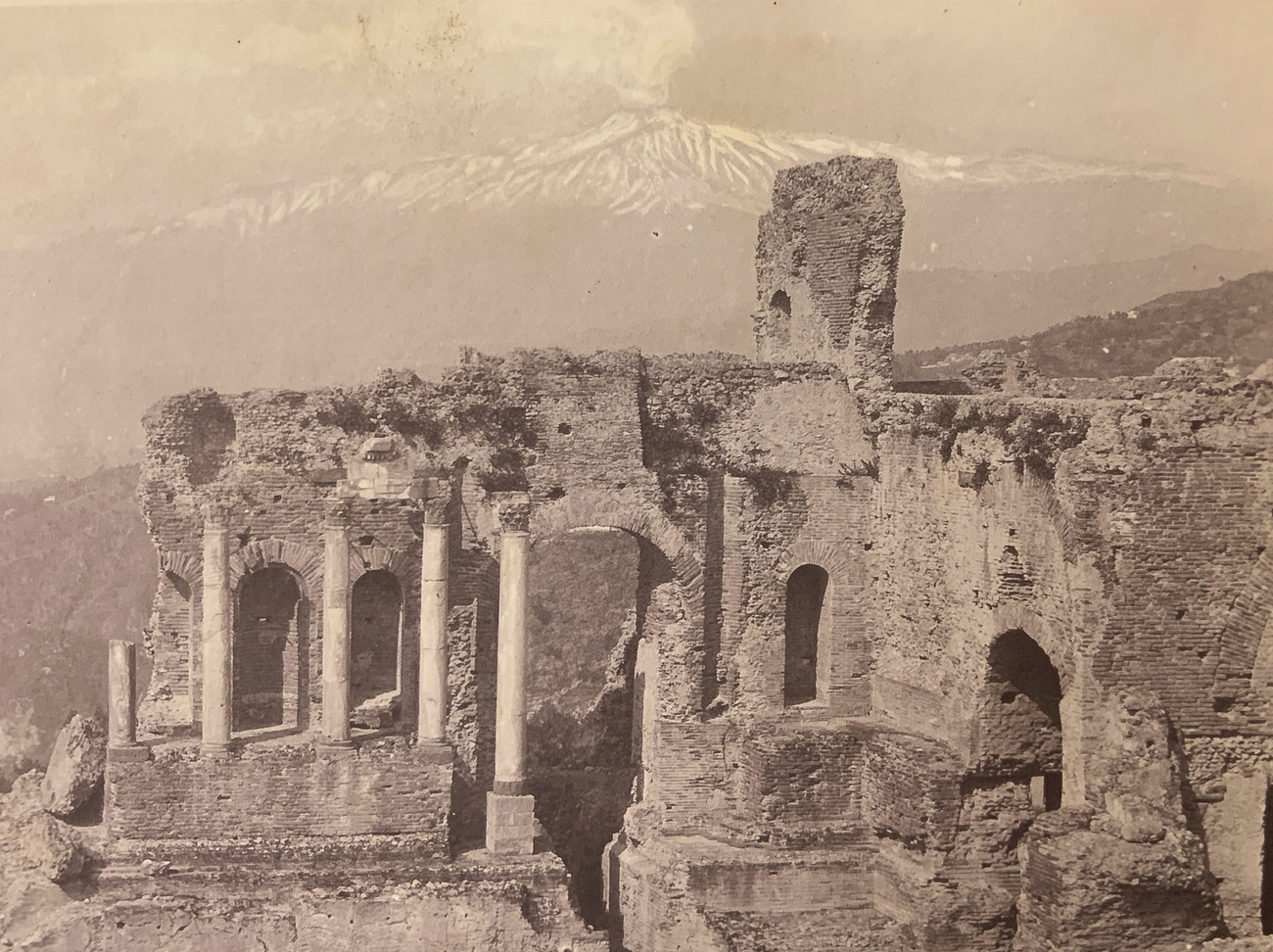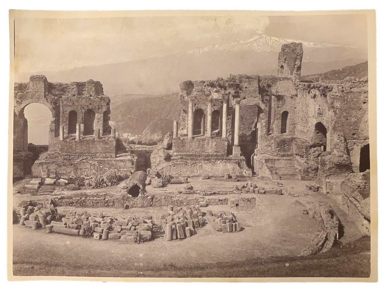 Wilhelm von Gloeden (1856-1931), foto raffigurante Teatro greco di Taormina con vista dell’Etna. Timbrata e numerata sul