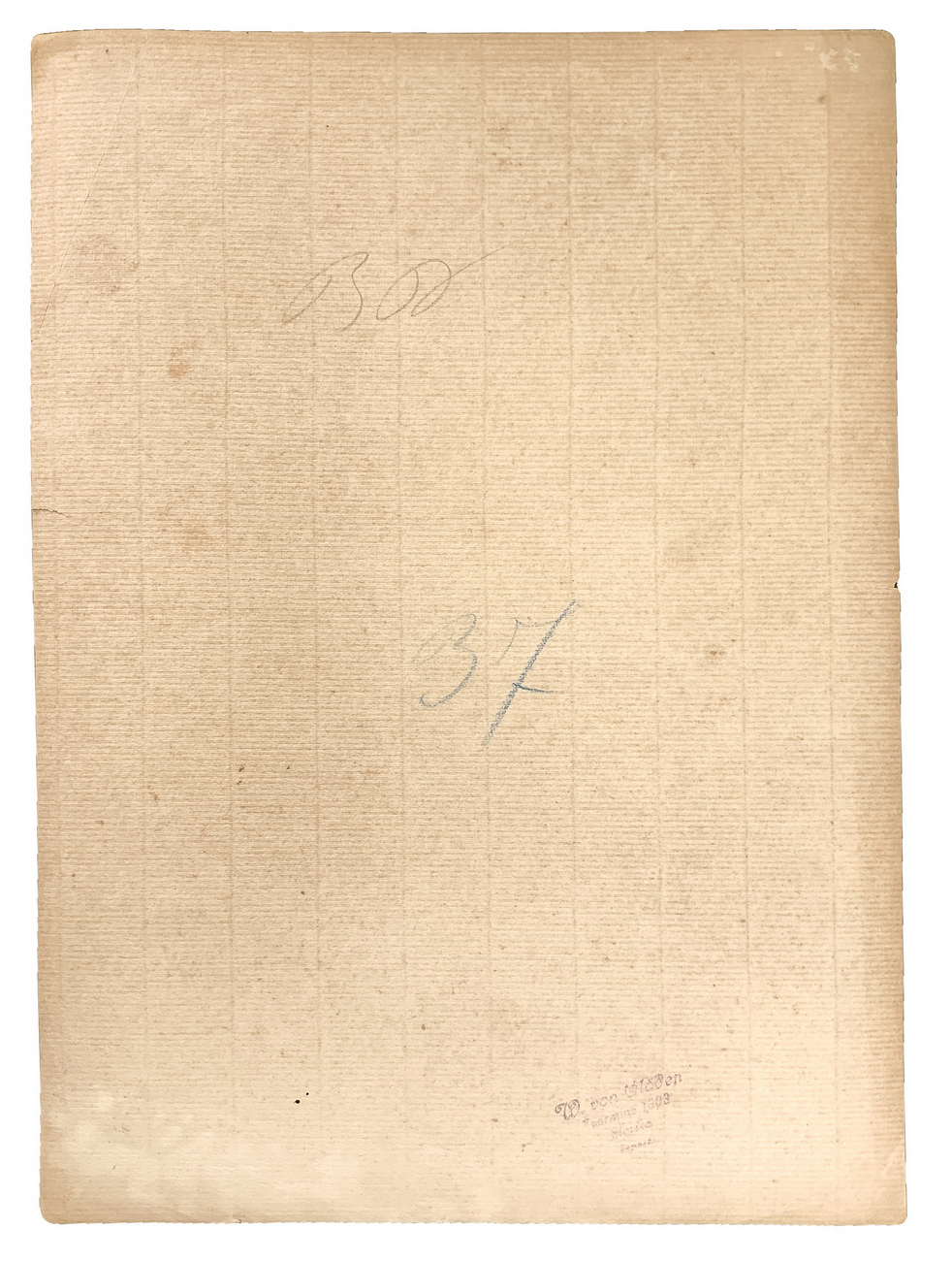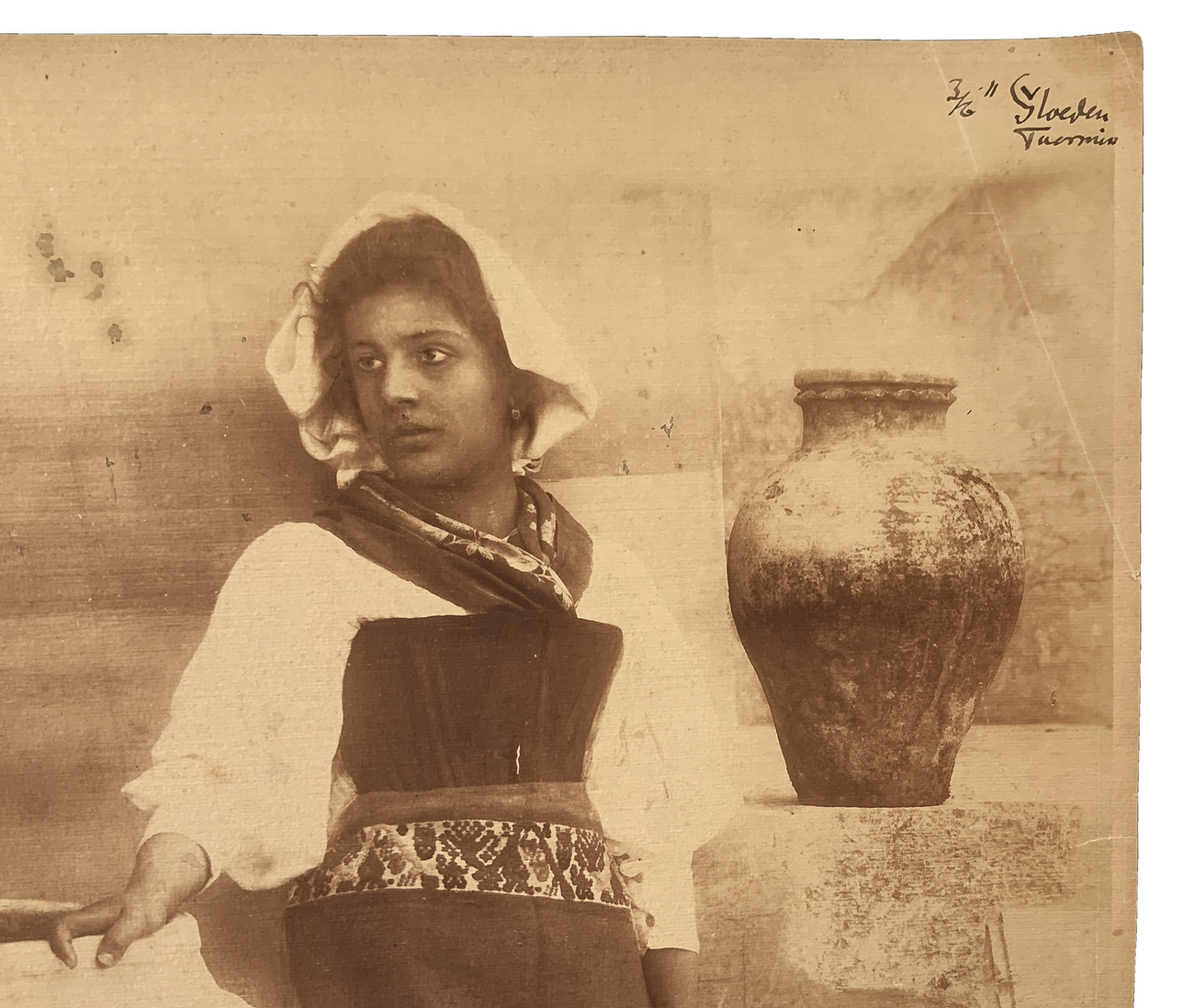 Wilhelm von Gloeden (1856-1931), stampa fotografica vintage su carta salata raffigurante “Giovane Siciliana in vestiti tradizionali”, c 1911. Firmata in alto a destra. Numerata “37” e timbrata al retro. Macchie di foxing al verso.