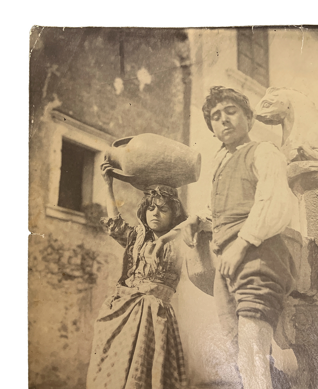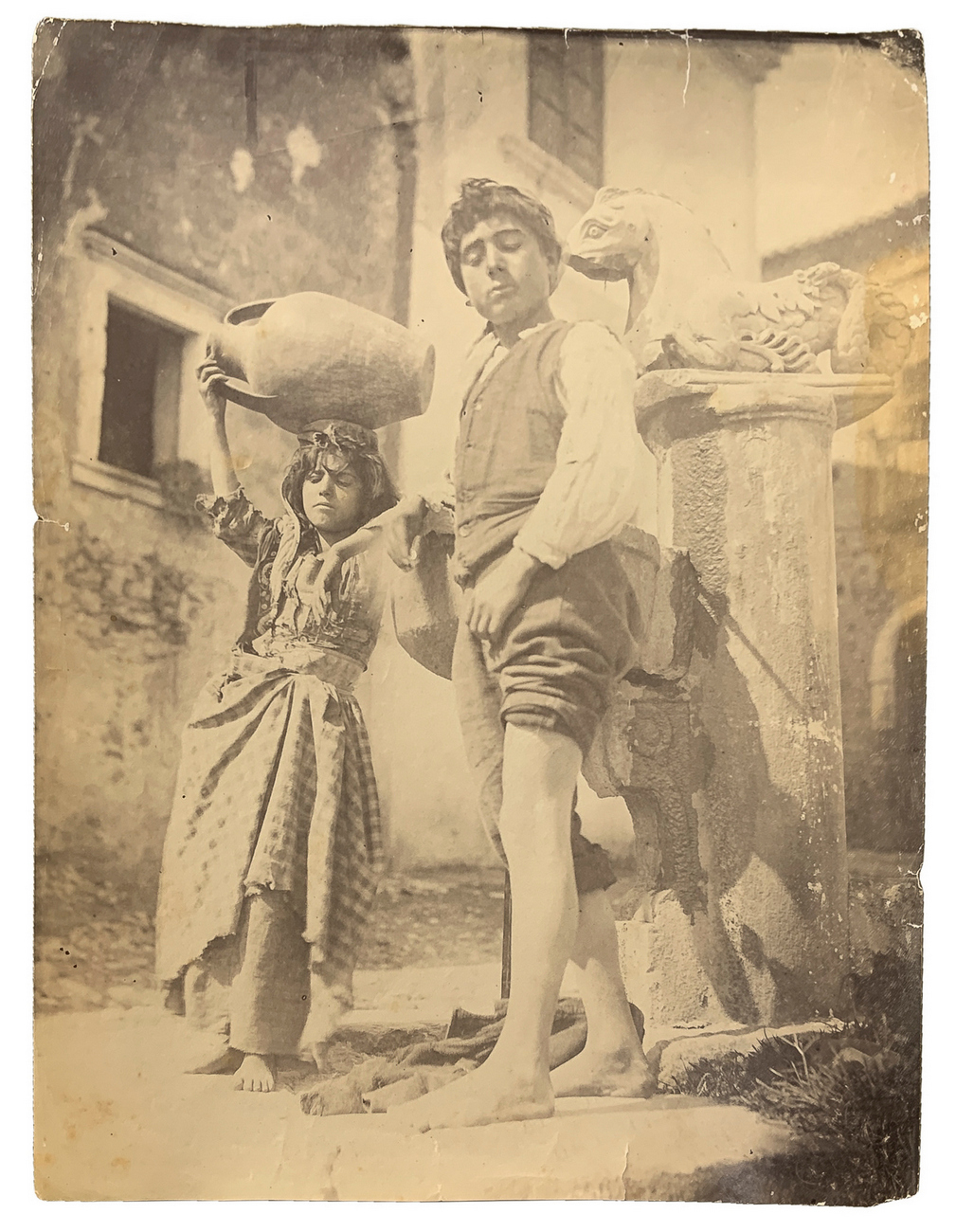 Wilhelm von Gloeden (1856-1931), foto all'albumina raffigurante ragazzi siciliani alla fontana. Doppio timbro sul retro.