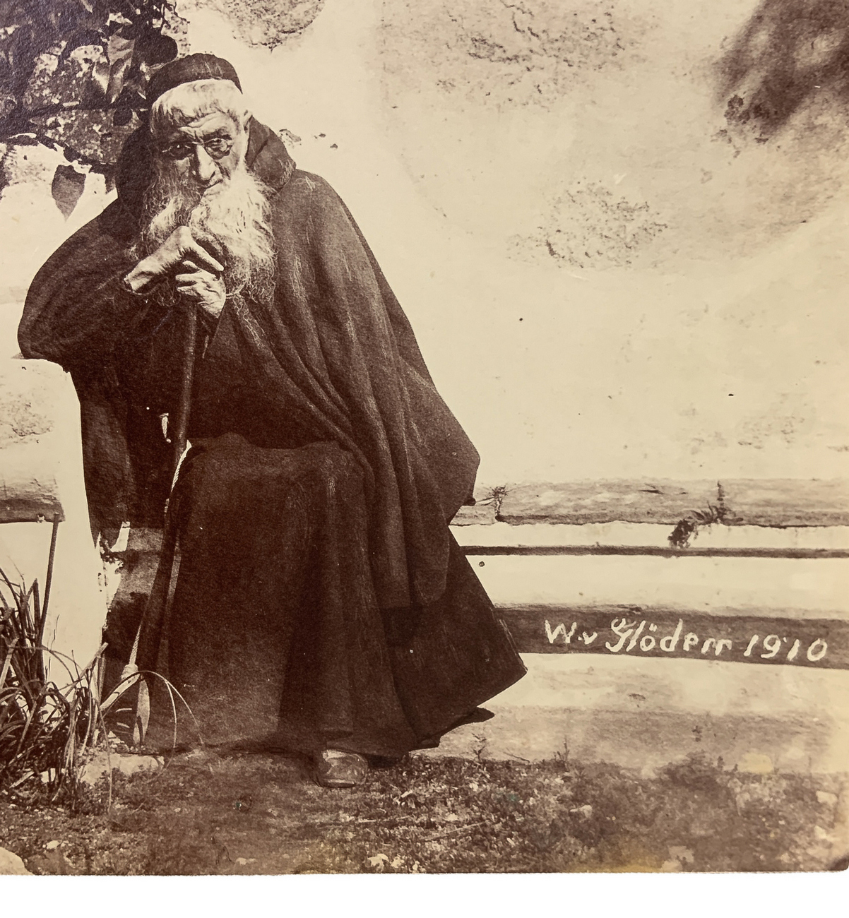 Wilhelm von Gloeden (1856-1931), foto all'albumina raffigurante frate con saio. Firmata e datata 1910 sul fronte e numer
